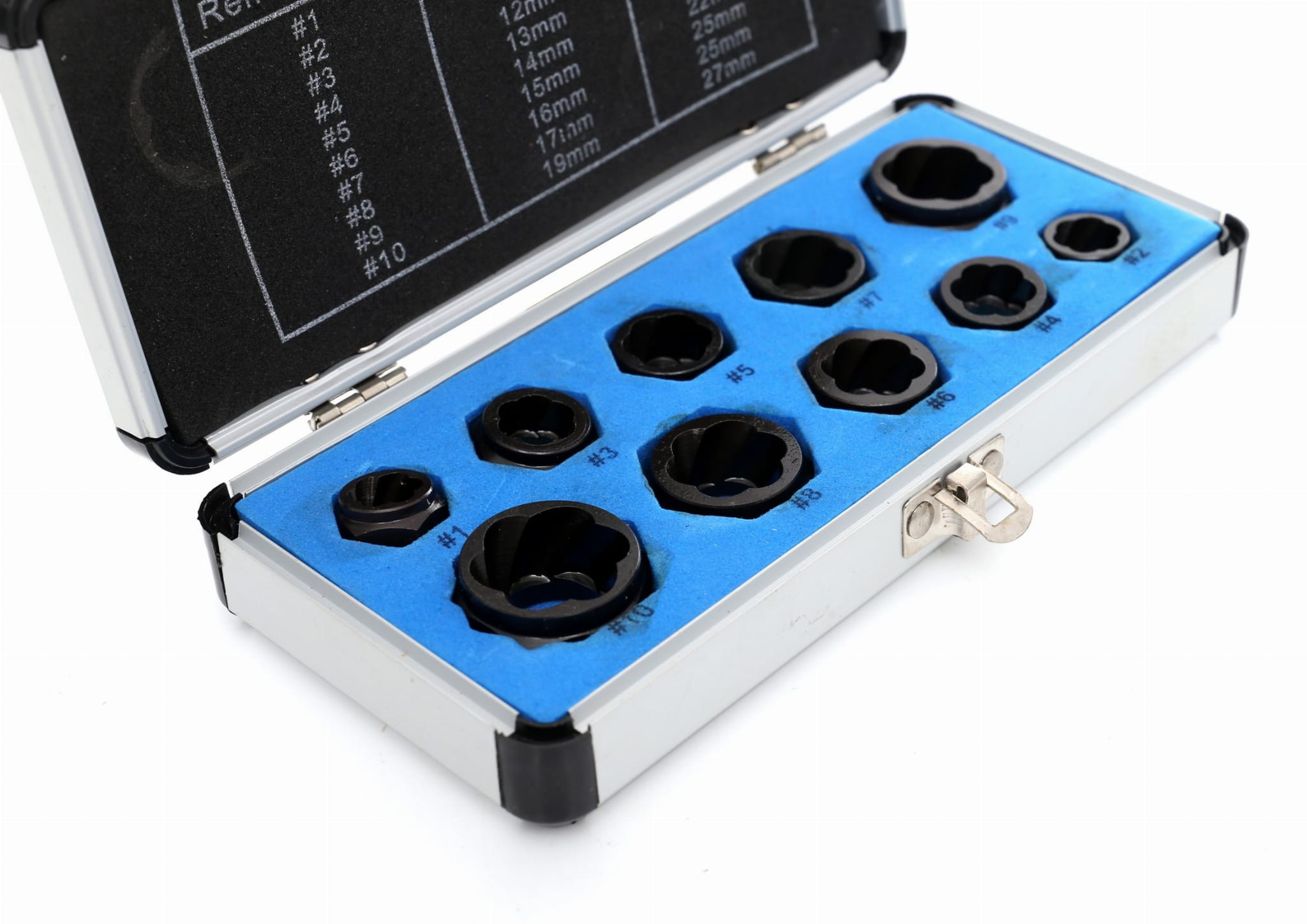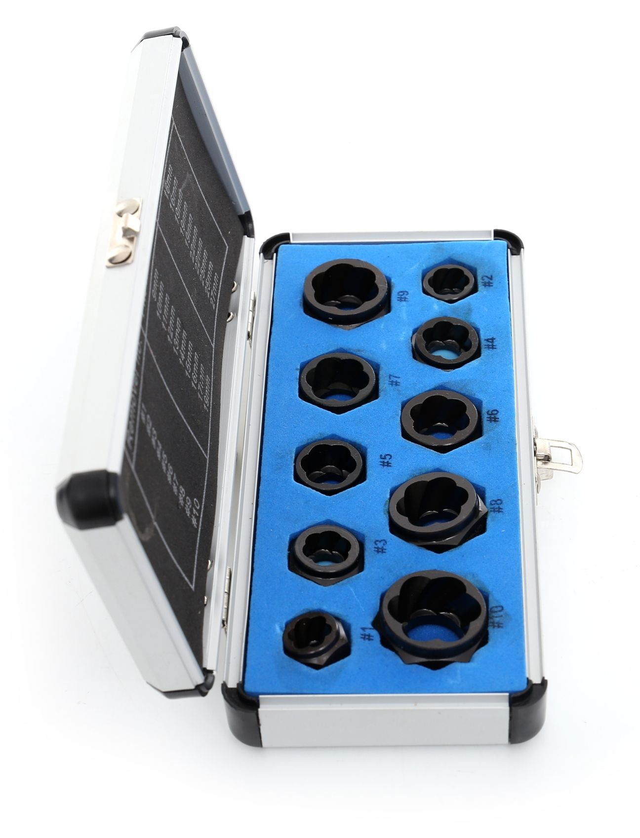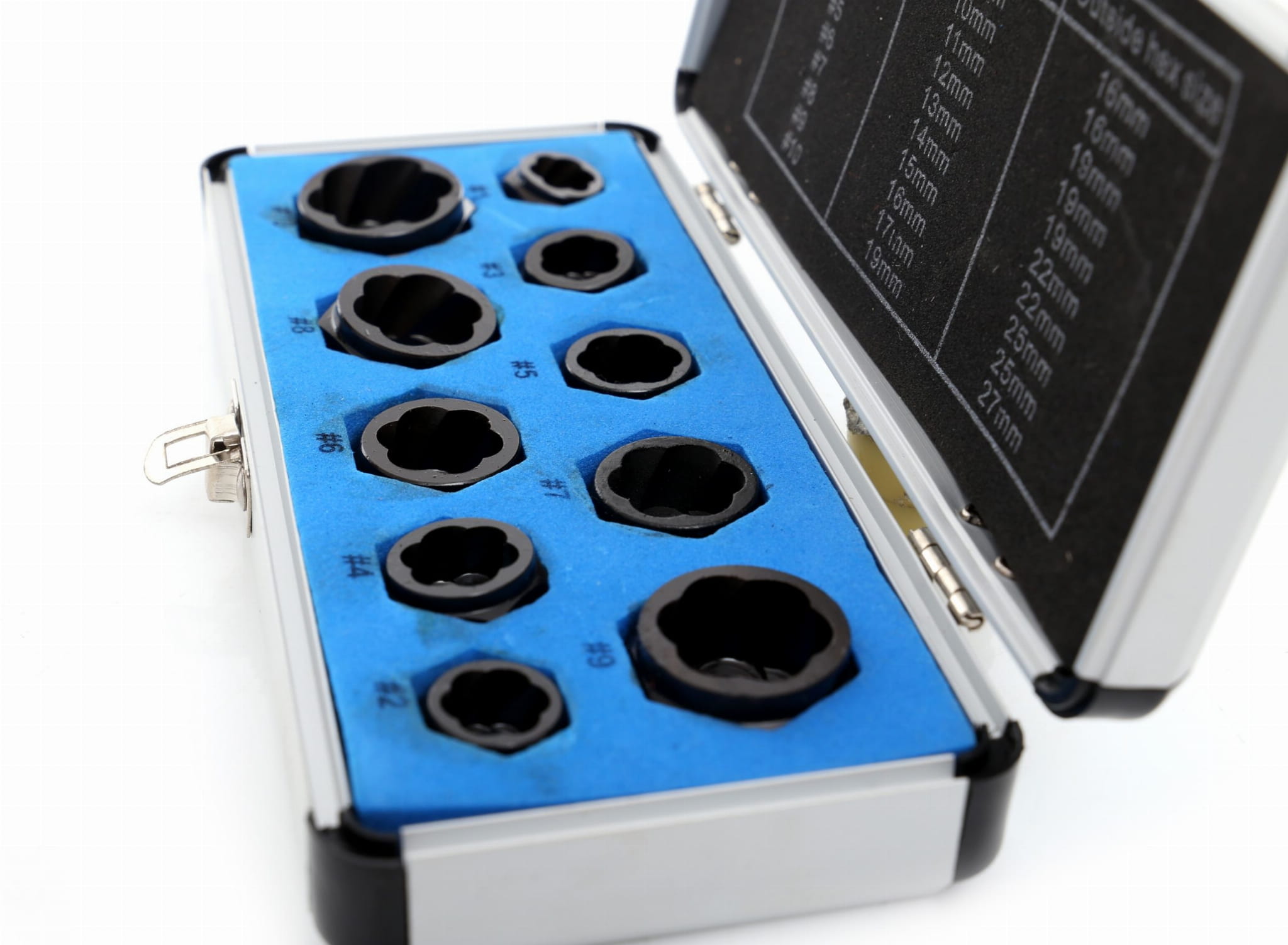 Każdy wykrętak ma wydzielone miejsce w walizce z aluminium, co zapobiega mieszaniu rozmiarów i uszkodzeniu narzędzi podczas transportu. Walizka ułatwia też szybką identyfikację brakującego elementu po zakończeniu pracy.