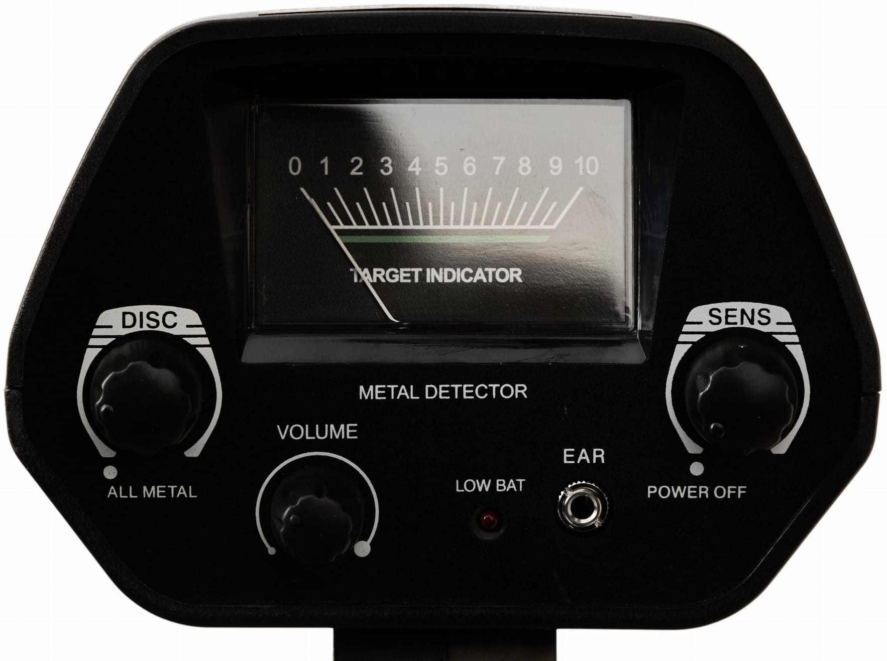 Wskazówka analogowa reaguje na wykryty sygnał i orientacyjnie wskazuje kategorię materiału. Daje szybką informację wizualną bez konieczności interpretowania samego dźwięku — przydatne szczególnie w głośnym otoczeniu lub przy pracy ze słuchawkami.