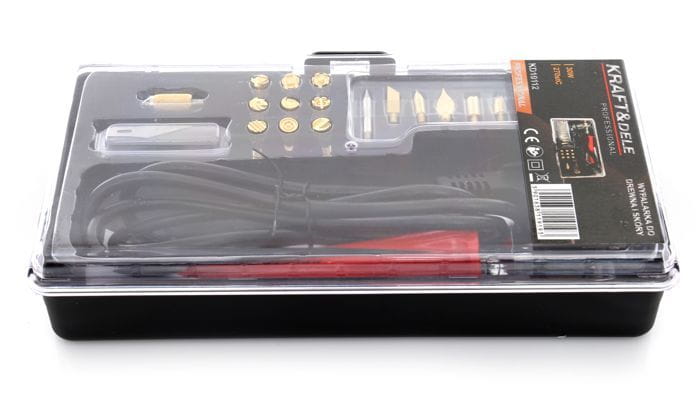 KD10112 to elektryczna wypalarka do pirografii — techniki zdobienia powierzchni za pomocą kontrolowanego ciepła. Urządzenie przeznaczone jest do pracy na drewnie, skórze i korku. W zestawie znajduje się 22 wymienne groty umożliwiające uzyskanie różnych linii, faktur i efektów zdobniczych.