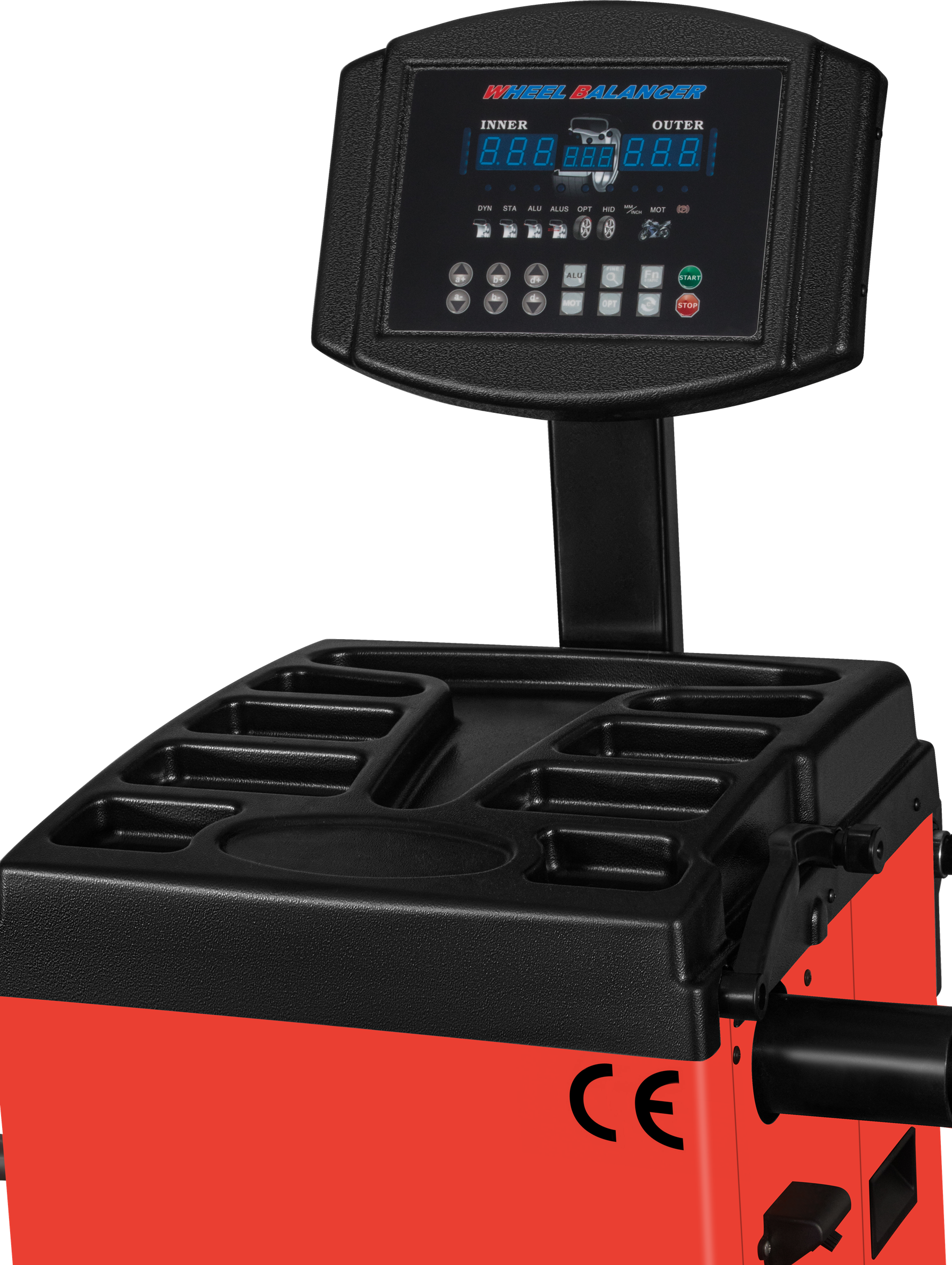 Dedykowane tryby pracy dla felg aluminiowych uwzględniają różne geometrie obręczy — m.in. felgi z ukrytymi kieszeniami na ciężarki. Tryb ALU-S automatycznie dobiera metodę wyważania na podstawie kształtu felgi, bez ręcznego wyboru programu przez operatora.