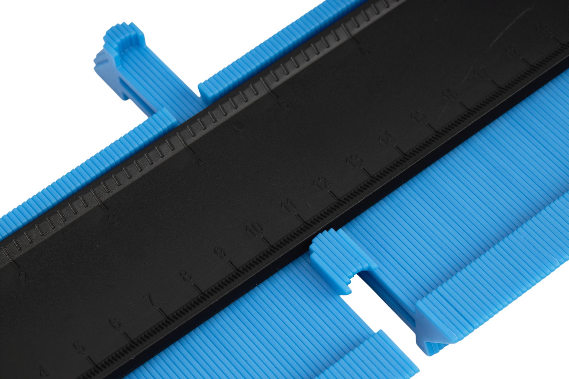 Narzędzie przykłada się do mierzonej powierzchni — ruchome płytki przesuwają się i przyjmują kształt profilu. Po dociśnięciu wzornik przenosi się na materiał docelowy i obrysowuje krawędź, uzyskując gotowy szablon do cięcia lub dopasowania.