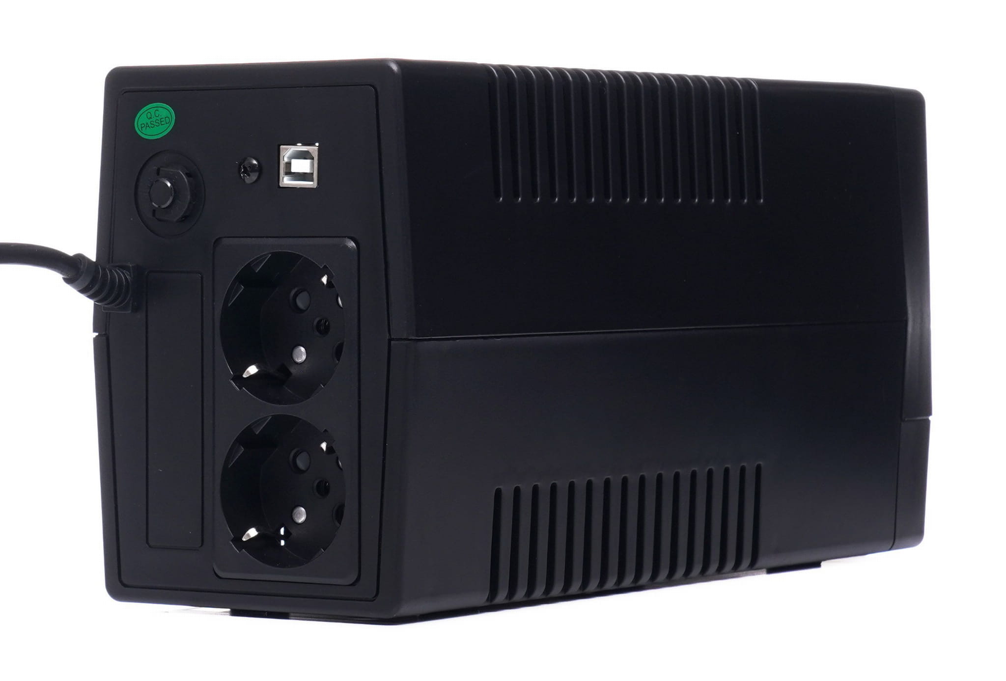 Należy zsumować pobór mocy (W) wszystkich urządzeń, które mają być podłączone. Łączna wartość nie powinna przekraczać 600W (moc rzeczywista KD1928). Moc pozorna (VA) uwzględnia współczynnik mocy — przy typowych urządzeniach biurowych wynosi on ok. 0,6, co odpowiada właśnie relacji 600W / 1000VA w tym modelu.