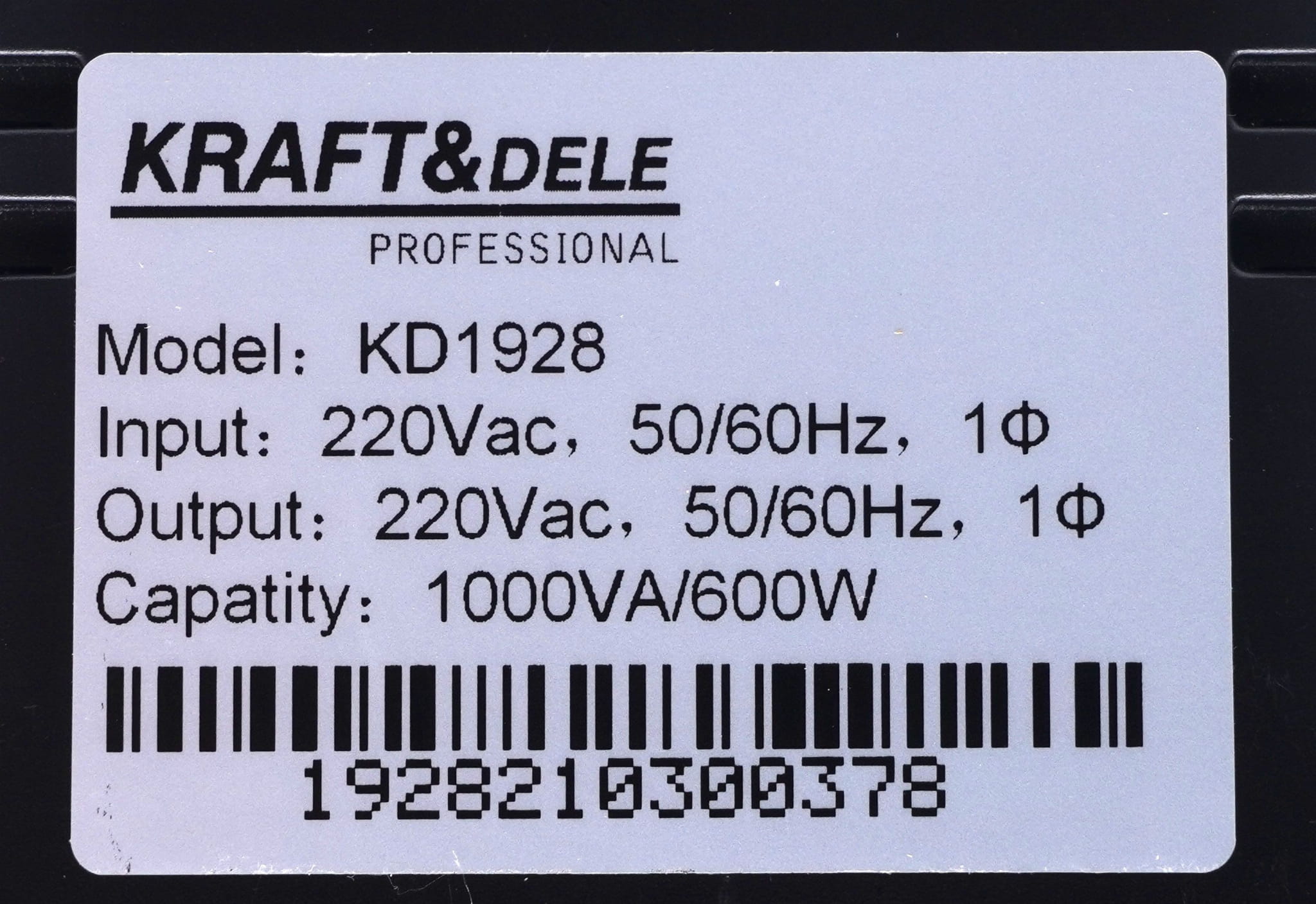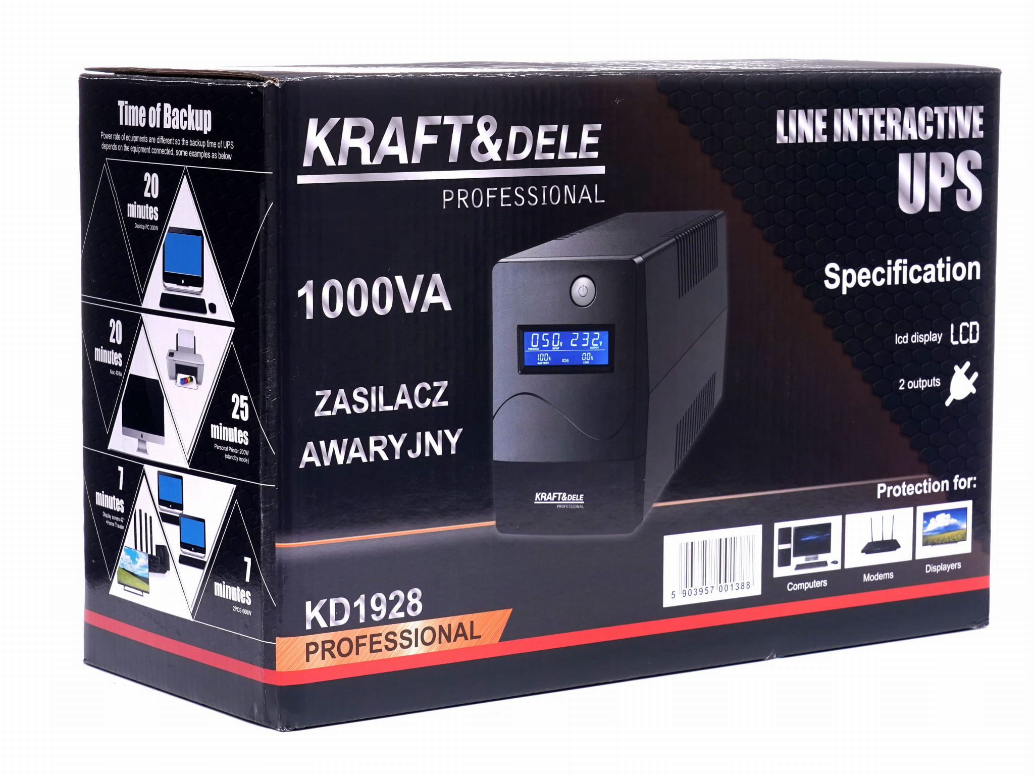 KD1928 to zasilacz bezprzerwowy (UPS) klasy line-interactive o mocy pozornej 1000VA i mocy rzeczywistej 600W, wyposażony w wyświetlacz LCD oraz wbudowaną baterię 9Ah. Urządzenie podtrzymuje zasilanie podłączonych odbiorników podczas zaniku lub nieprawidłowych parametrów napięcia sieciowego, chroniąc dane i sprzęt przed skutkami awarii energetycznej.