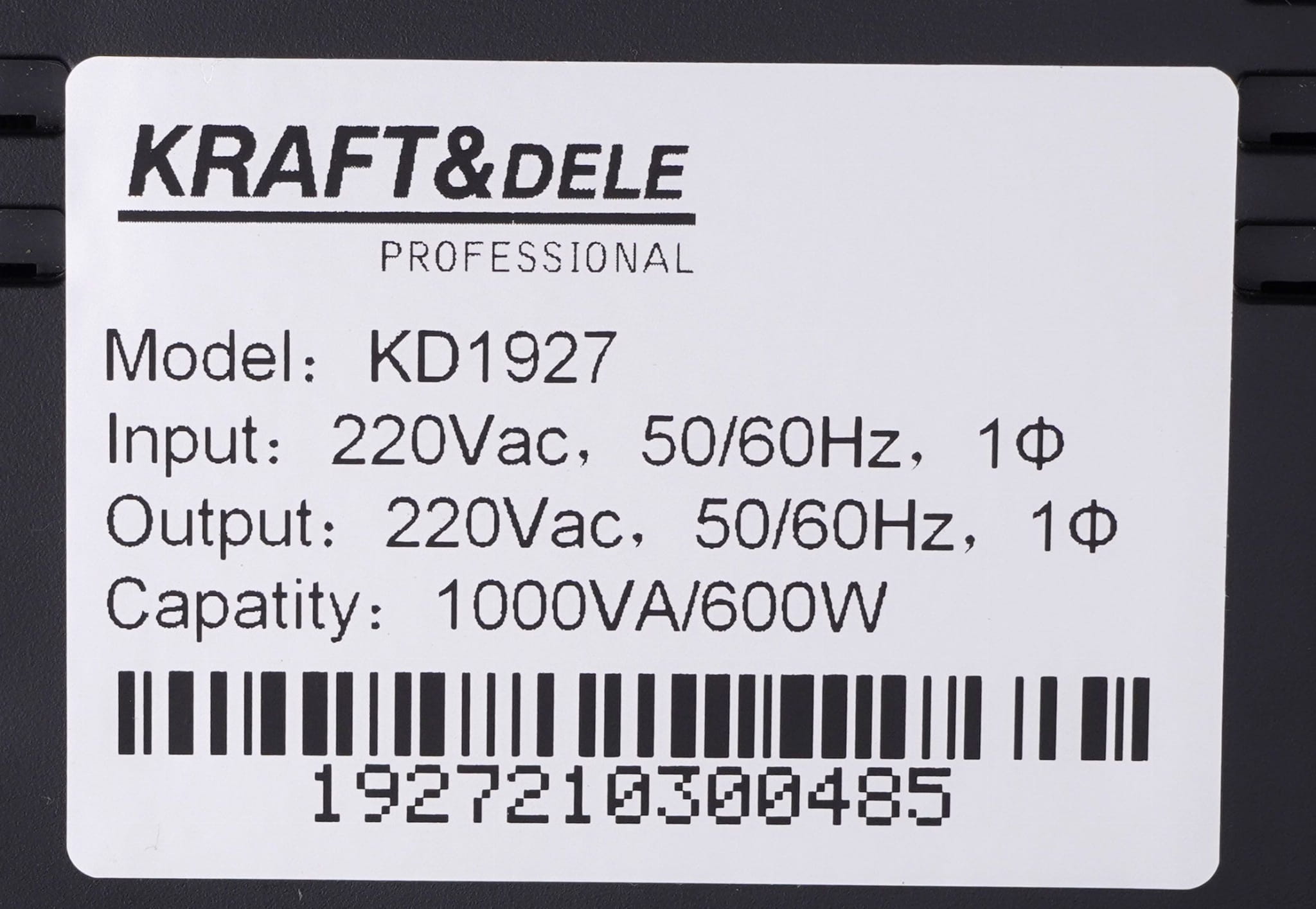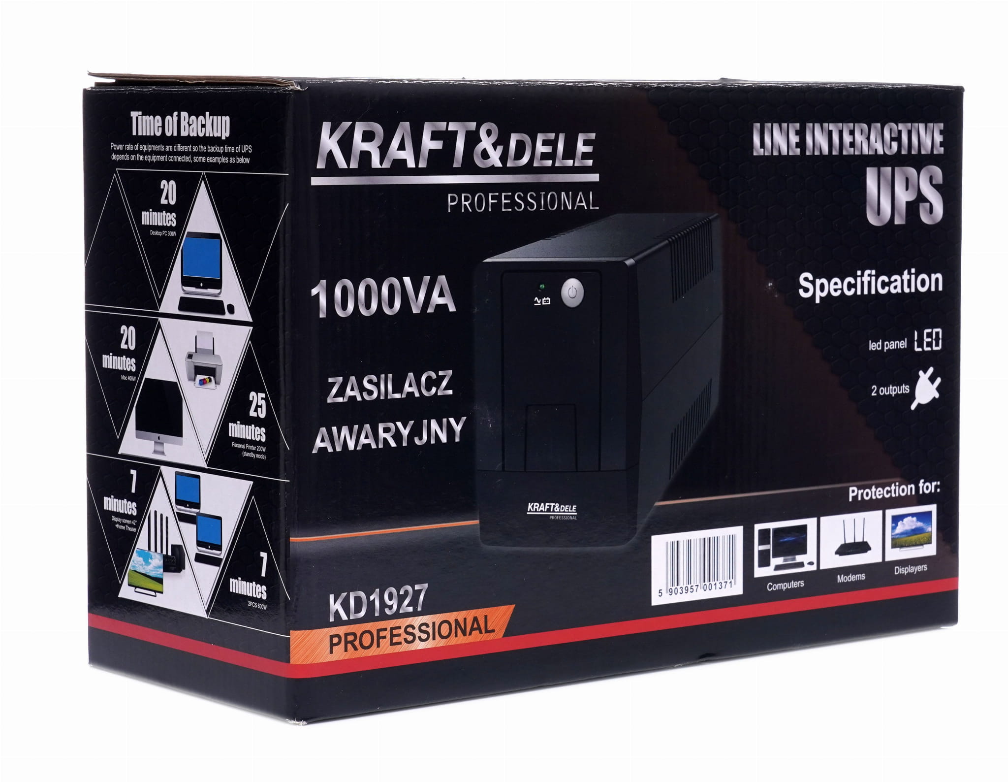 KD1927 to zasilacz bezprzerwowy (UPS) klasy offline o mocy pozornej 1000 VA i mocy czynnej 600 W, wyposażony w wyświetlacz LED prezentujący bieżący stan pracy urządzenia. Zapewnia ochronę podłączonych urządzeń przed skutkami zaniku napięcia, przepięć oraz nieprawidłowych parametrów sieci energetycznej.