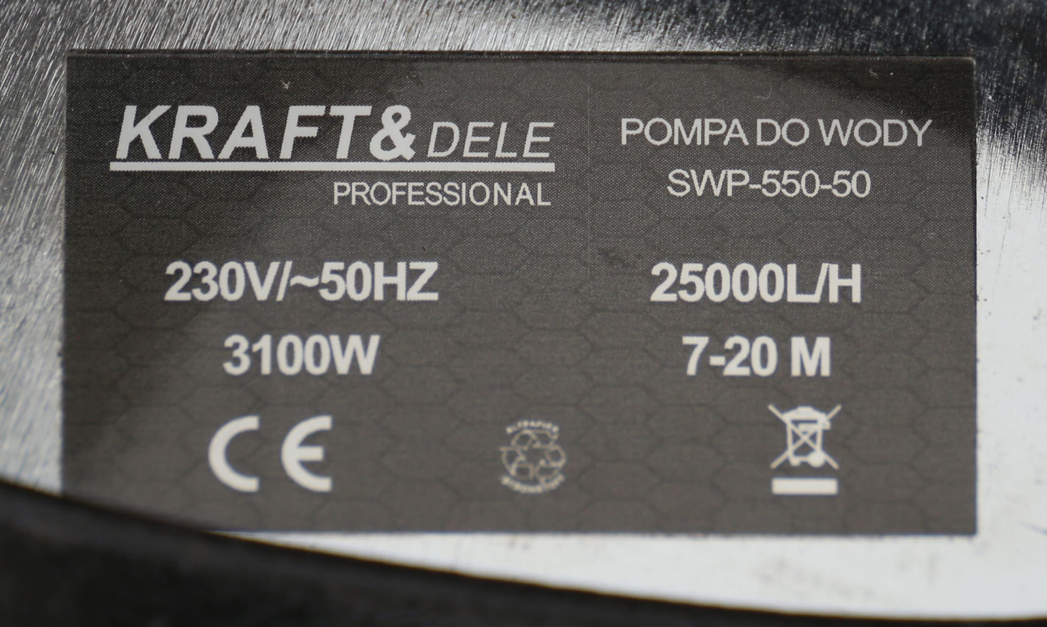 Pompa zasilana jest ze standardowego gniazda 230V / 50Hz. Przy mocy 3100W pobór prądu wynosi około 13,5A, co mieści się w zakresie typowych zabezpieczeń 16A. Przed podłączeniem należy upewnić się, że obwód elektryczny, do którego podłączane jest urządzenie, jest wyposażony w wyłącznik różnicowoprądowy (RCD) — jest to wymóg bezpieczeństwa przy pracy w środowisku wilgotnym.