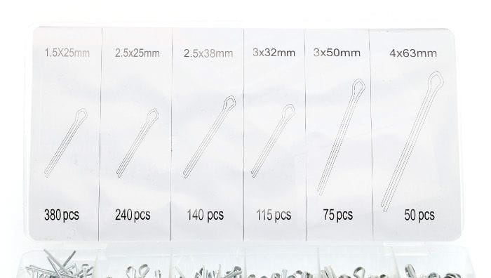 Zestaw obejmuje zawleczki w kilku rozmiarach, co pozwala dobrać właściwy element do różnych średnic otworów i grubości łączonych części. Eliminuje to konieczność zakupu kilku osobnych opakowań przy pracy z różnorodnymi podzespołami.