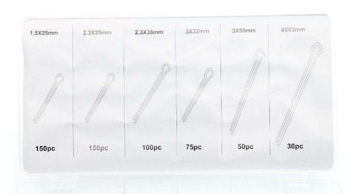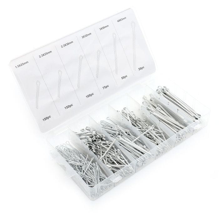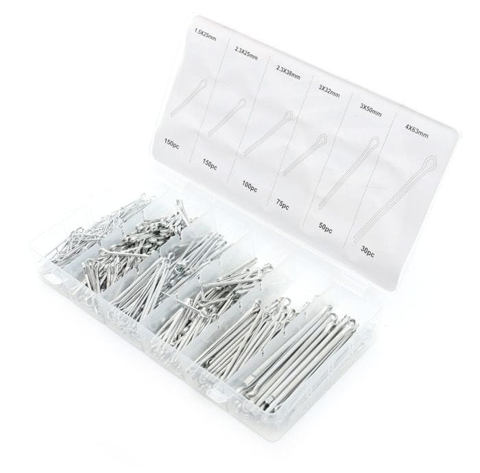 Zestaw obejmuje wiele rozmiarów zawleczek w jednym opakowaniu. Dzięki temu nie ma potrzeby zamawiania poszczególnych wymiarów osobno — odpowiedni rozmiar można dobrać na miejscu, bezpośrednio podczas naprawy lub montażu.