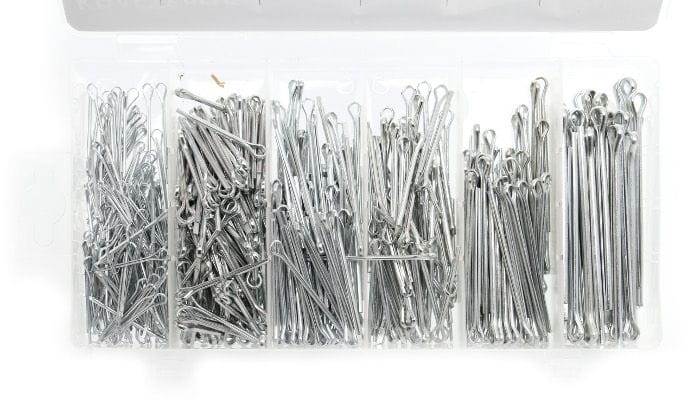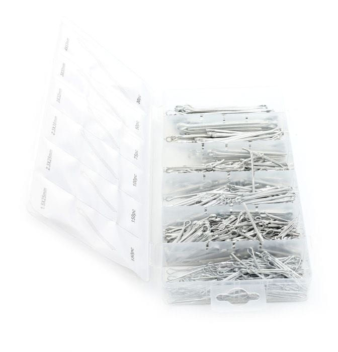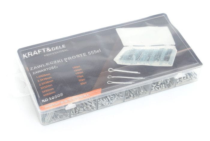Zestaw 555 stalowych zawleczek prostych w różnorodnych rozmiarach, przeznaczonych do zabezpieczania elementów przed przesuwaniem się wzdłuż wałków, osi, trzpieni i śrub. Całość przechowywana jest w pojemniku z oznaczonymi przegródkami, co ułatwia szybkie odnalezienie właściwego rozmiaru podczas pracy.