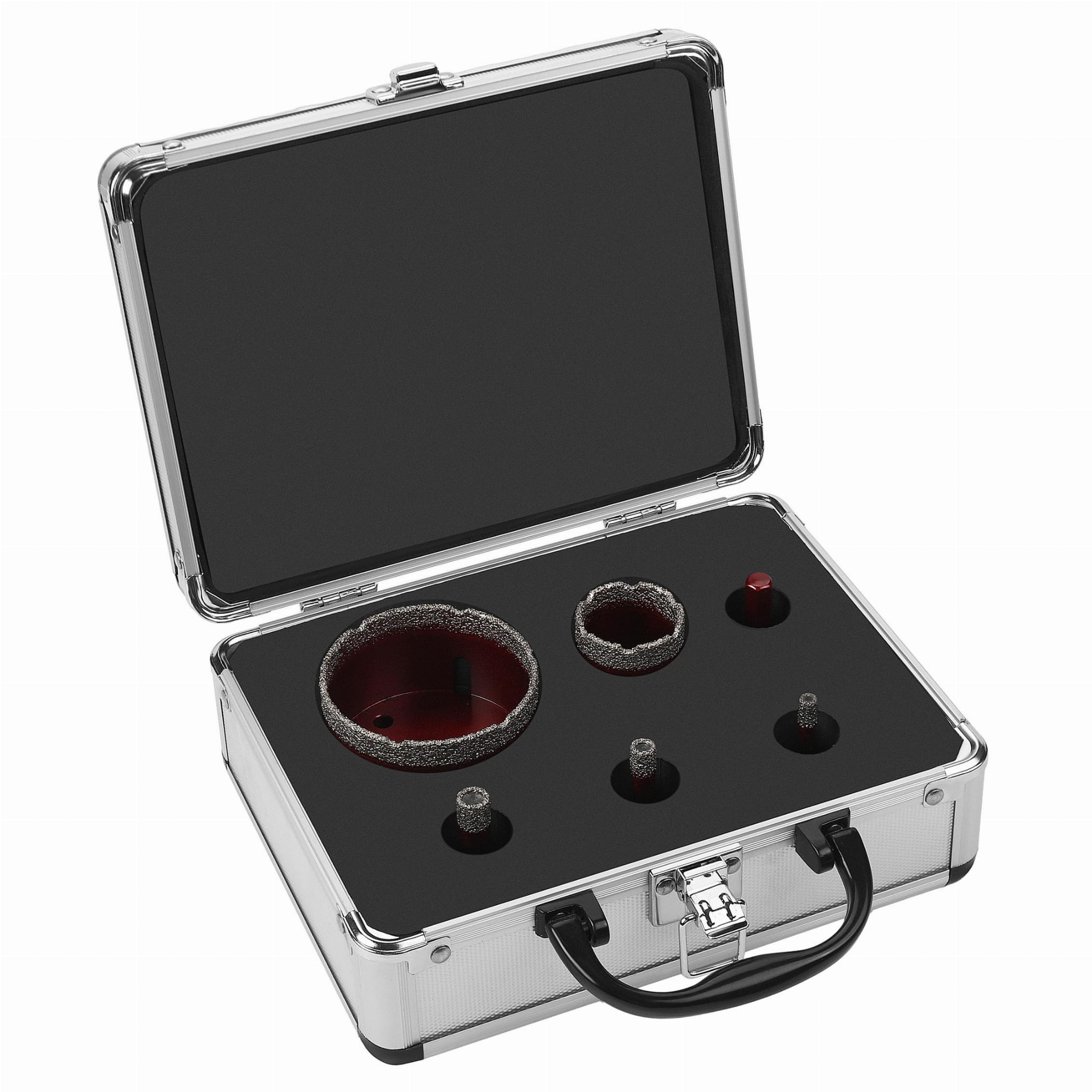 KD5953 to zestaw pięciu otwornic diamentowych z adapterem, przeznaczonych do wiercenia otworów w materiałach ceramicznych, gresie i kamieniu. Zakres średnic od 6 do 68 mm pozwala na wykonanie zarówno małych przepustów instalacyjnych, jak i dużych otworów pod osprzęt sanitarny. Zestaw dostarczany jest w zamykanej walizce ułatwiającej przechowywanie i transport narzędzi.