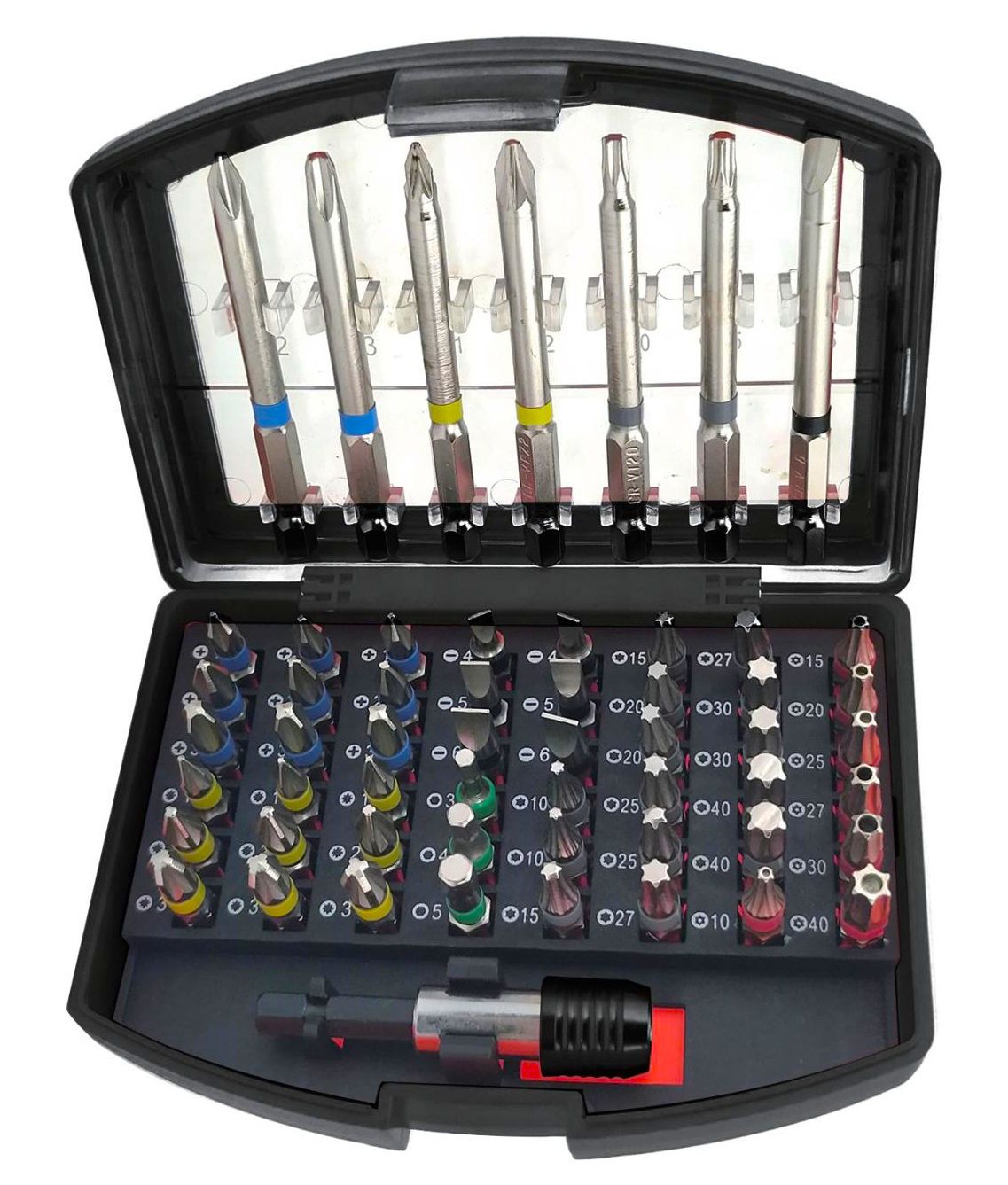 Opakowanie z przezroczystym wglądem pozwala szybko zlokalizować potrzebną końcówkę bez przeszukiwania całego zestawu. Trzymak do bitów zwiększa zasięg i ułatwia pracę w miejscach o utrudnionym dostępie.