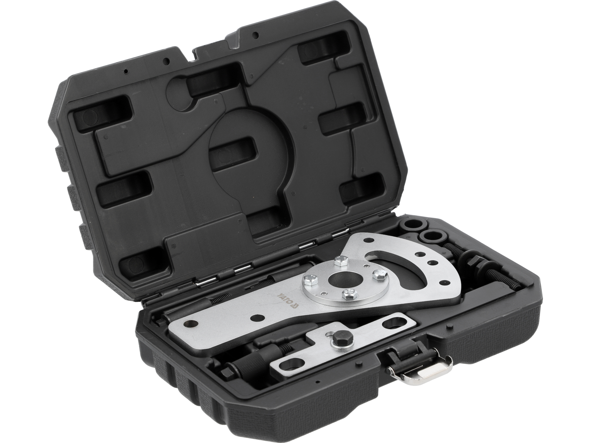 Zestaw zawiera wszystkie niezbędne blokady i narzędzia do przeprowadzenia pełnego cyklu prac przy rozrządzie — od unieruchomienia wału korbowego, przez blokowanie wałków rozrządu, po kontrolę pozycji. Kompletność zestawu eliminuje konieczność dokupowania dodatkowych komponentów.