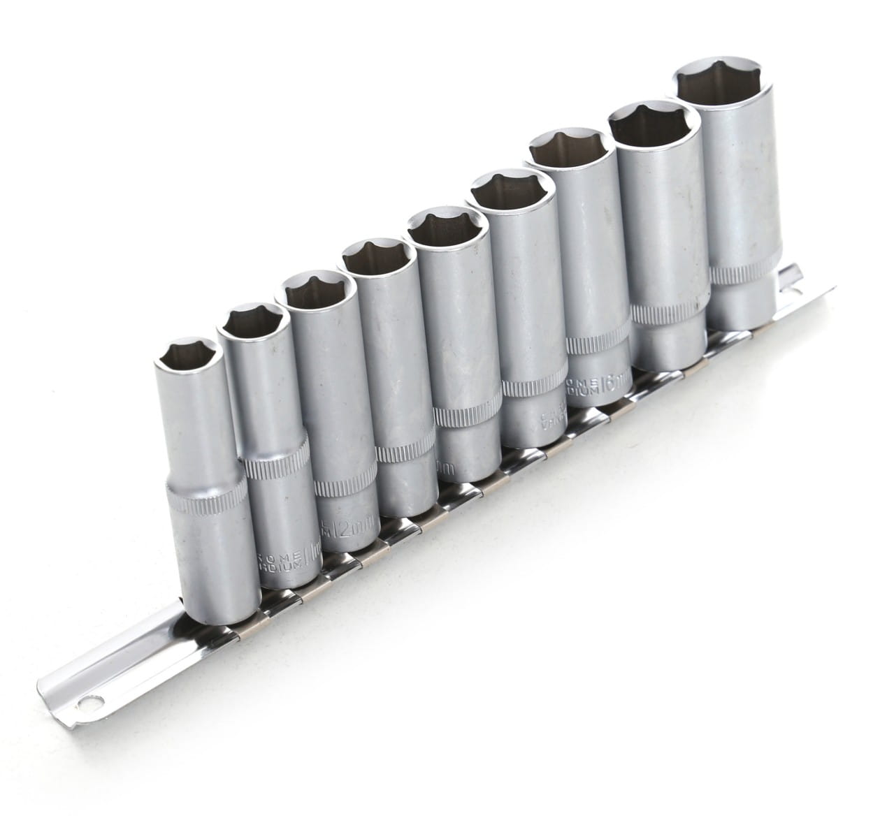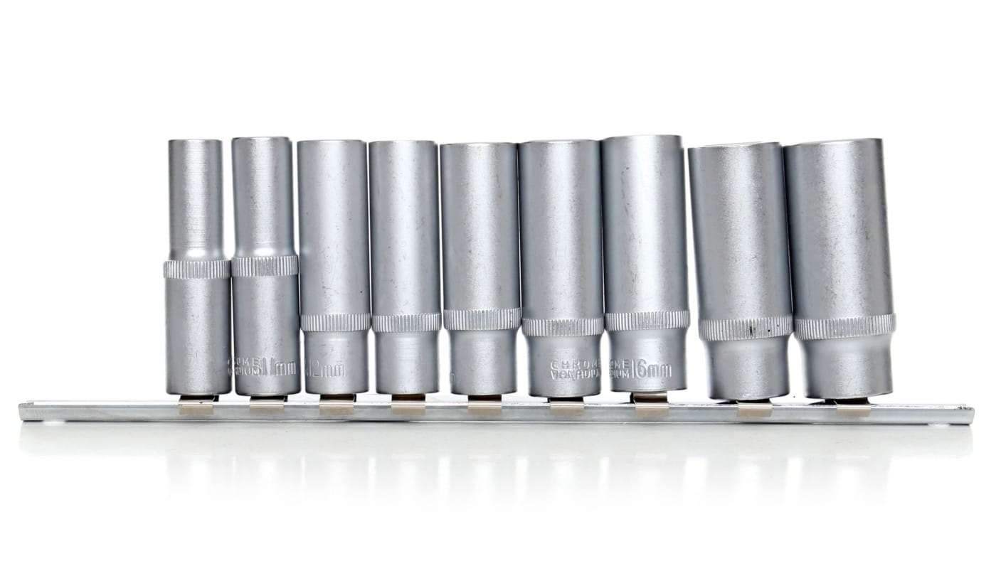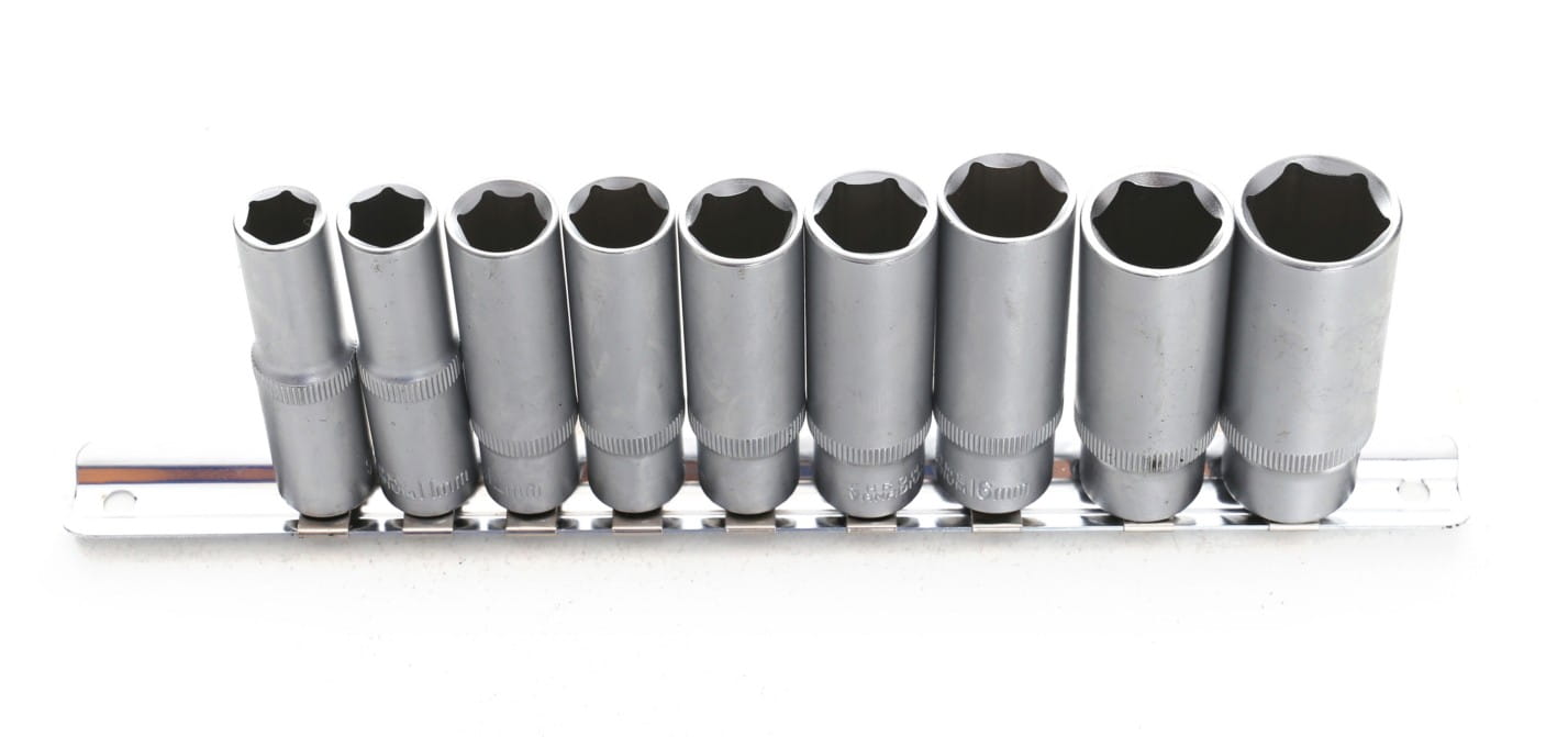 Zestaw dziewięciu długich nasadek z napędem 3/8" wykonanych ze stali chromowo-wanadowej. Wydłużona konstrukcja o długości 63 mm umożliwia pracę przy śrubach i nakrętkach osadzonych głęboko w gniazdach lub trudno dostępnych miejscach, gdzie standardowe nasadki nie mają wystarczającego zasięgu.