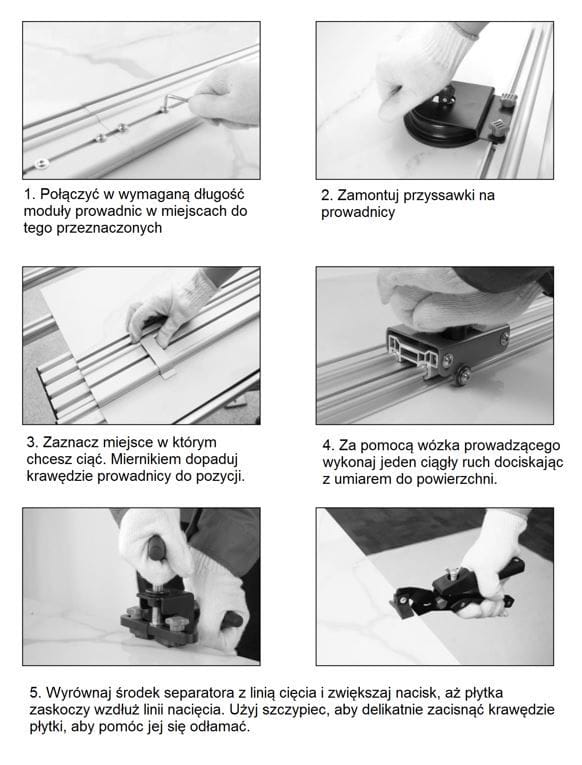 Prowadnica pełni rolę szyny prowadzącej dla narzędzia tnącego — szlifierki kątowej z tarczą diamentową lub frezarki. Narzędzie przesuwa się wzdłuż krawędzi szyny, co zapewnia prostoliniowe cięcie na całej długości płytki. W odróżnieniu od ręcznych przecinarek do płytek, system prowadnic nie ma ograniczenia wynikającego z długości belki roboczej — szyny można łączyć, dostosowując długość do formatu ciętego materiału.