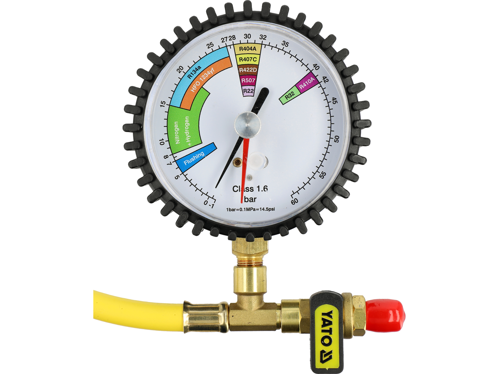 Zestaw diagnostyczny do wykrywania nieszczelności w instalacjach klimatyzacyjnych i chłodniczych. Wyposażony w manometr 80 mm, zawór odcinający oraz adapter miedziany z uniwersalnym złączem SAE 1/4".
