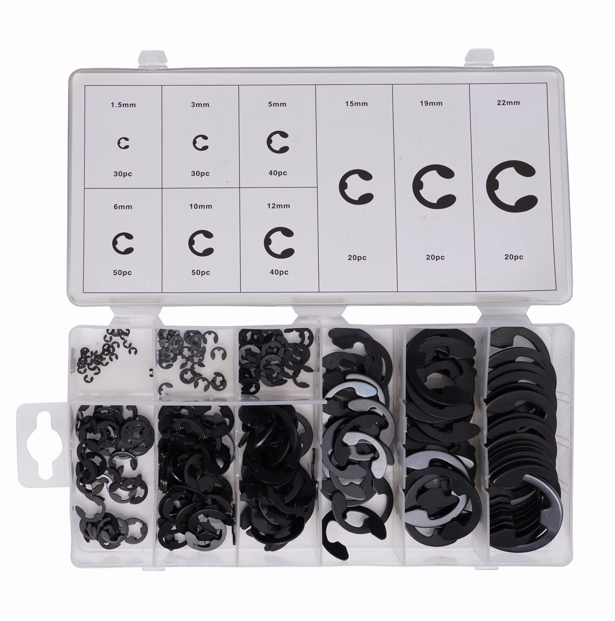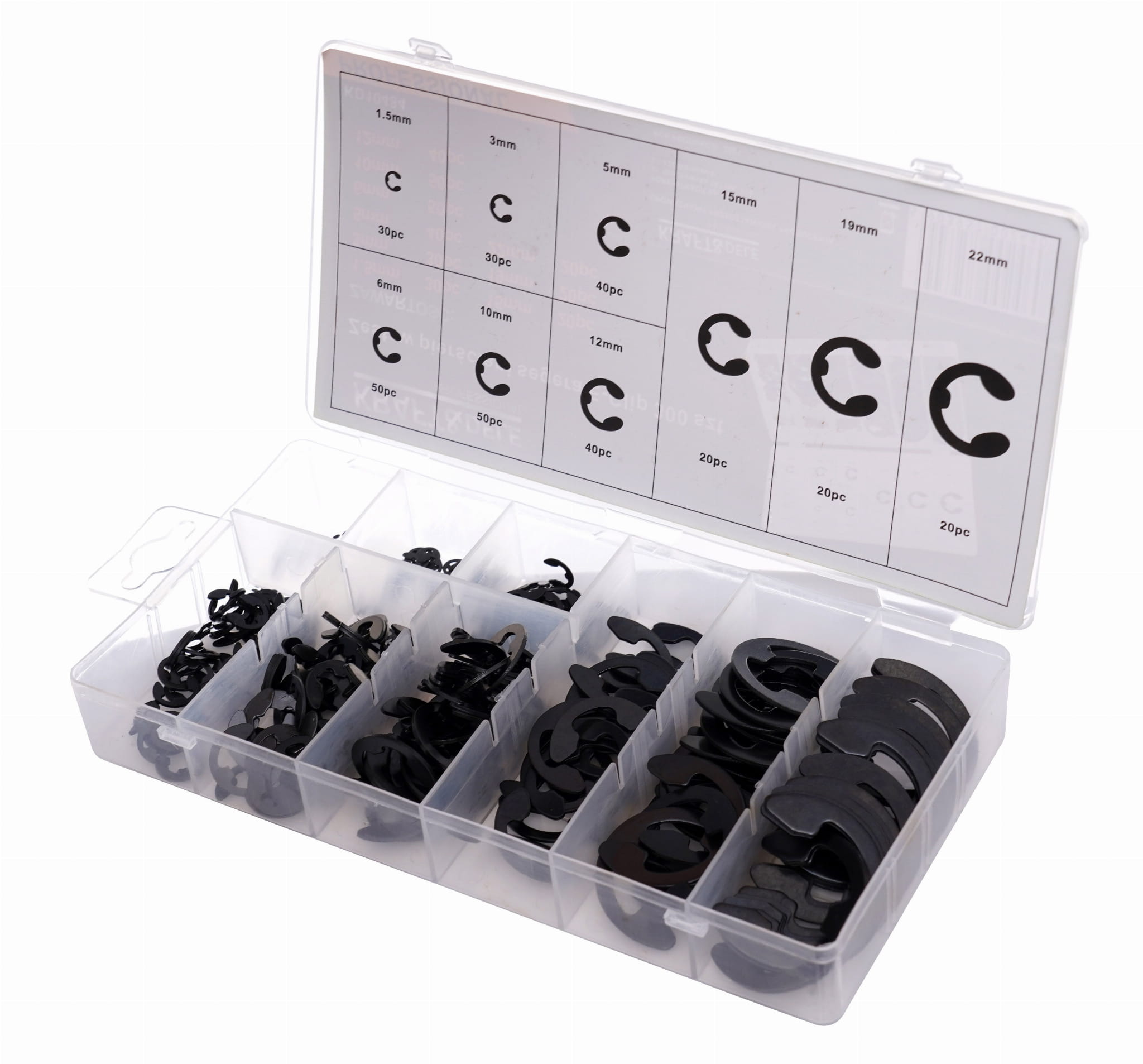 Komplet 300 pierścieni typu E-Clips (zwanych również pierścieniami Seegera w wersji zewnętrznej lub spinkami E) wykonanych ze stali nierdzewnej. Zestaw obejmuje 9 rozmiarów średnic od 1,5 do 22 mm, przeznaczonych do szybkiego osiowego zabezpieczania wałków, sworzni i trzpieni przed przesuwaniem się osadzonych na nich elementów.