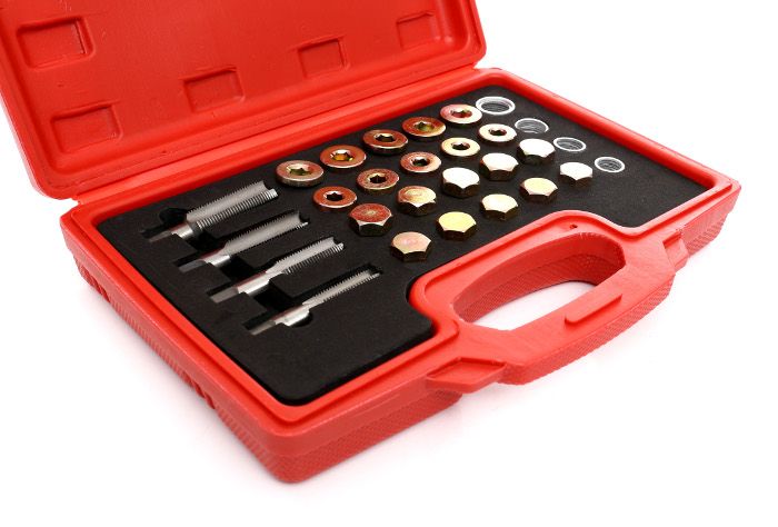 Przed przystąpieniem do naprawy należy zidentyfikować rozmiar oryginalnego gwintu korka. Informację tę można znaleźć w dokumentacji technicznej pojazdu lub zmierzyć średnicę zewnętrzną korka suwmiarką. Najczęściej spotykane rozmiary w samochodach osobowych to M12 × 1,5, M14 × 1,5 oraz M16 × 1,5 — zestaw KD10511 obejmuje rozmiary M13, M15, M17 i M20, dlatego przed zakupem warto zweryfikować, czy gwint w danym pojeździe mieści się w tym zakresie.