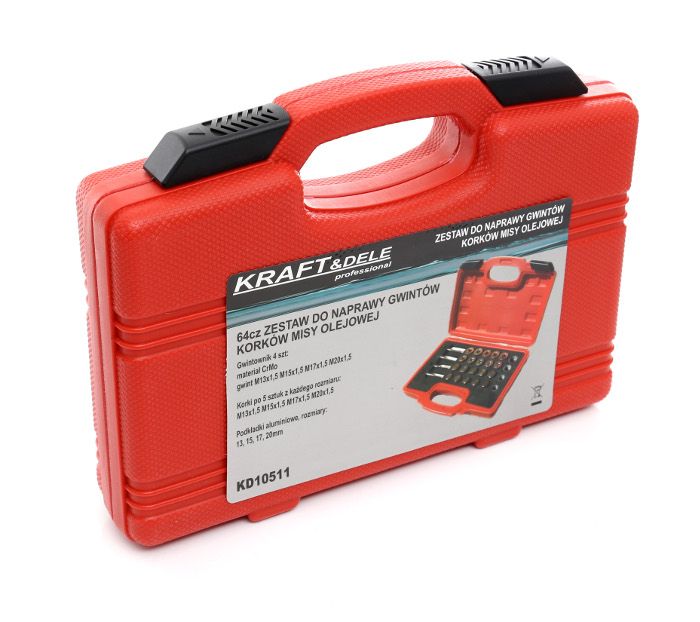 KD10511 to 64-elementowy zestaw naprawczy przeznaczony do regeneracji uszkodzonych gwintów korków spustowych w miskach olejowych, skrzyniach biegów i innych układach samochodowych. W skład zestawu wchodzą gwintowniki ze stali HSS, korki zamienne oraz podkładki aluminiowe w czterech rozmiarach — od M13 do M20 — pokrywających zdecydowaną większość popularnych gwintów stosowanych w samochodach osobowych i lekkich dostawczych.