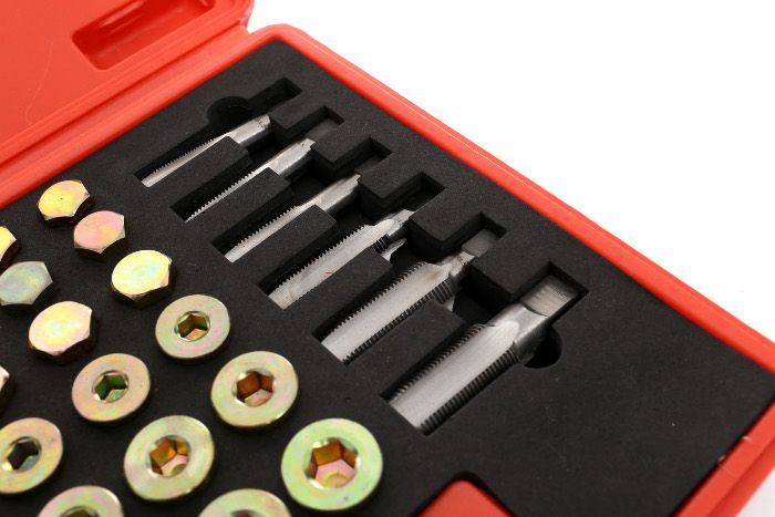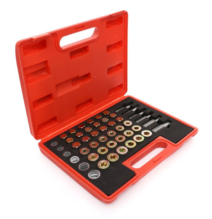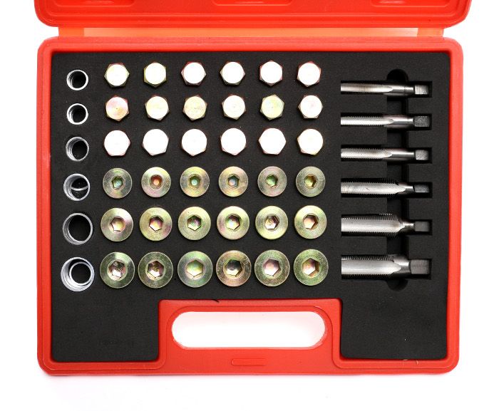 Gwintowniki, korki i podkładki w jednym opakowaniu ułatwiają sprawne wykonanie naprawy bez kompletowania części osobno.