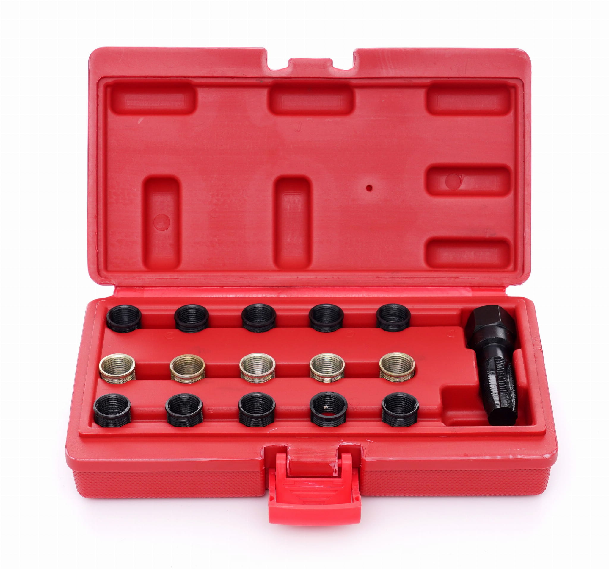 KD10592 to zestaw narzędzi przeznaczony do regeneracji uszkodzonych gwintów w gniazdach świec zapłonowych o rozmiarze M14x1.25 — standardowym dla większości silników benzynowych. W skład zestawu wchodzą gwintownik formujący nowy gwint oraz wkładki gwintowe (Helicoil), które trwale odbudowują zniszczone gniazdo bez konieczności wymiany głowicy.