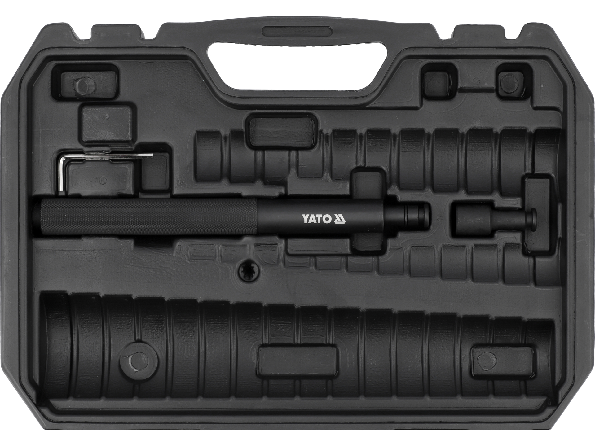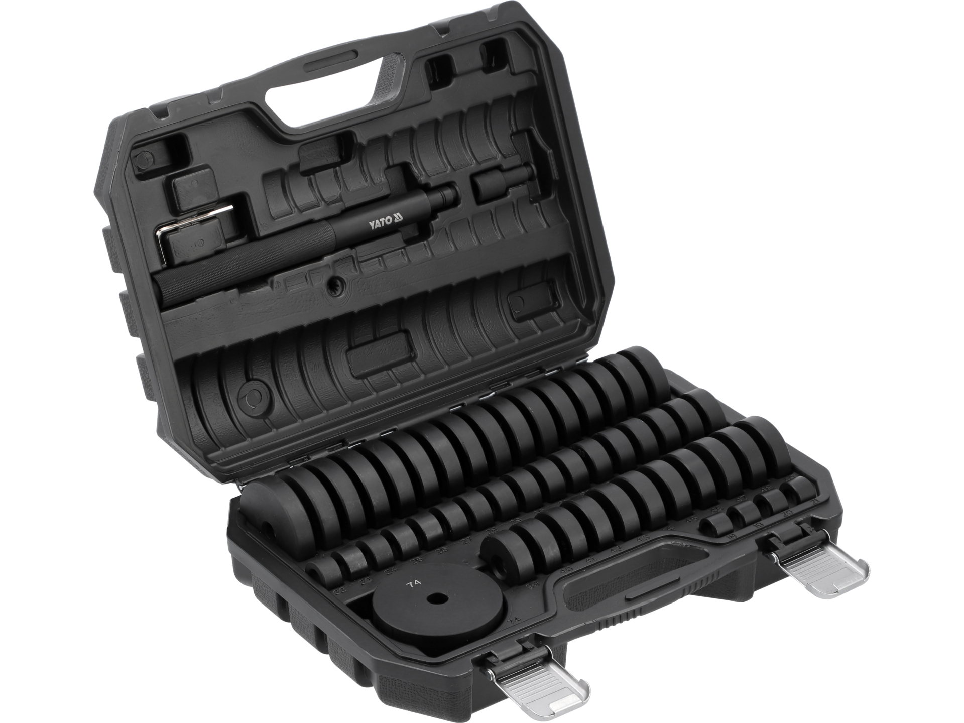 Zestaw narzędzi przeznaczony do montażu i demontażu łożysk oraz tulei w warsztatach mechanicznych i samochodowych. Umożliwia bezpieczne wyprasowywanie i wprasowywanie elementów bez uszkodzenia gniazd montażowych i obudów.
