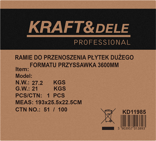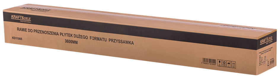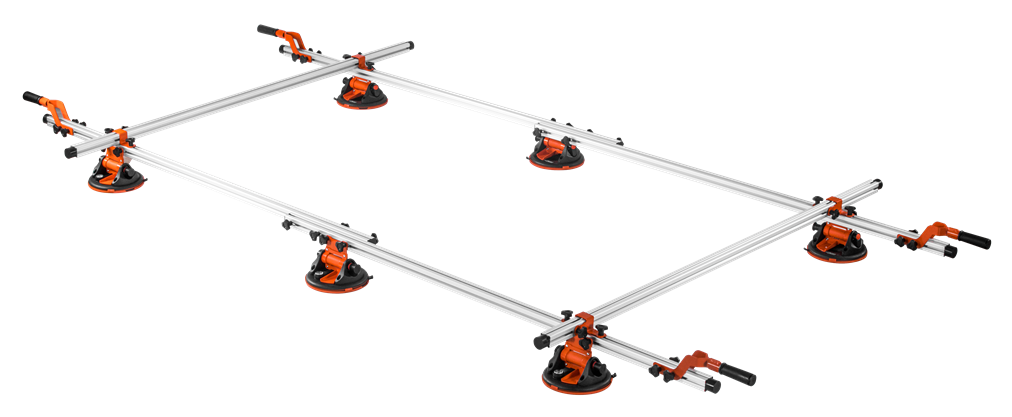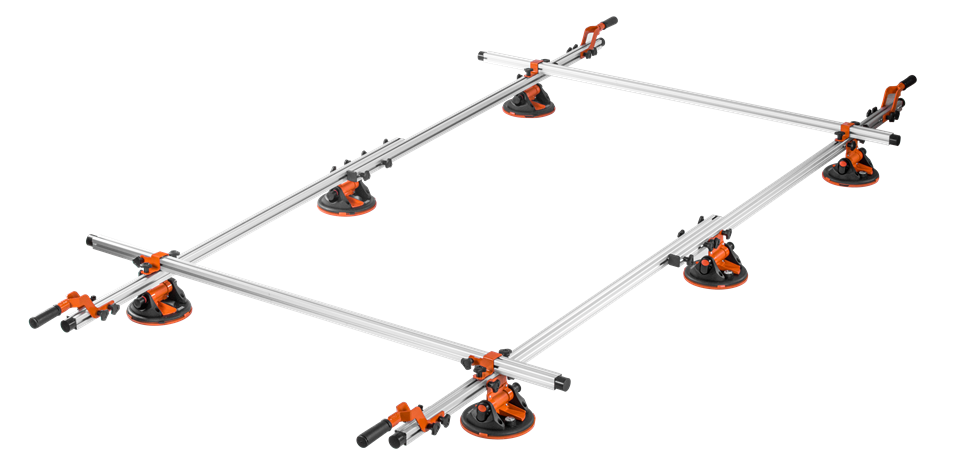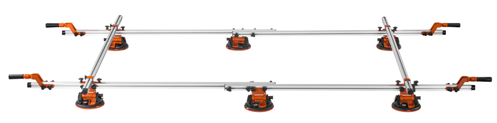 KD11985 to modułowy system do ręcznego przenoszenia wielkoformatowych płyt, szyb i paneli o wymiarach do 360 x 180 cm i masie do 150 kg. Rama zbudowana z aluminium i stali współpracuje z sześcioma przyssawkami gumowymi o średnicy 20 cm, zapewniając stabilne mocowanie do gładkich, nieprzepuszczalnych powierzchni.