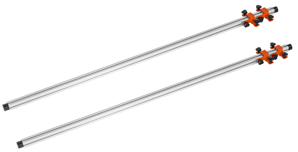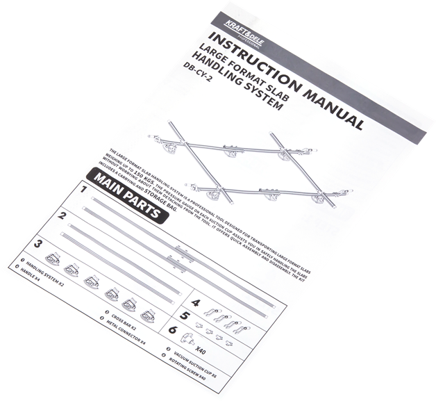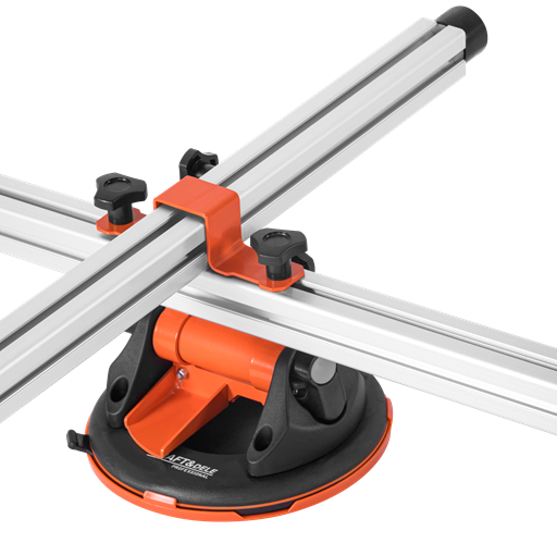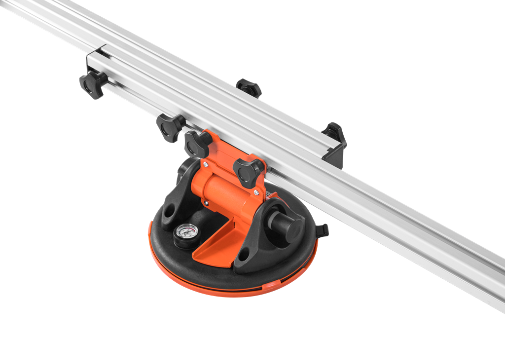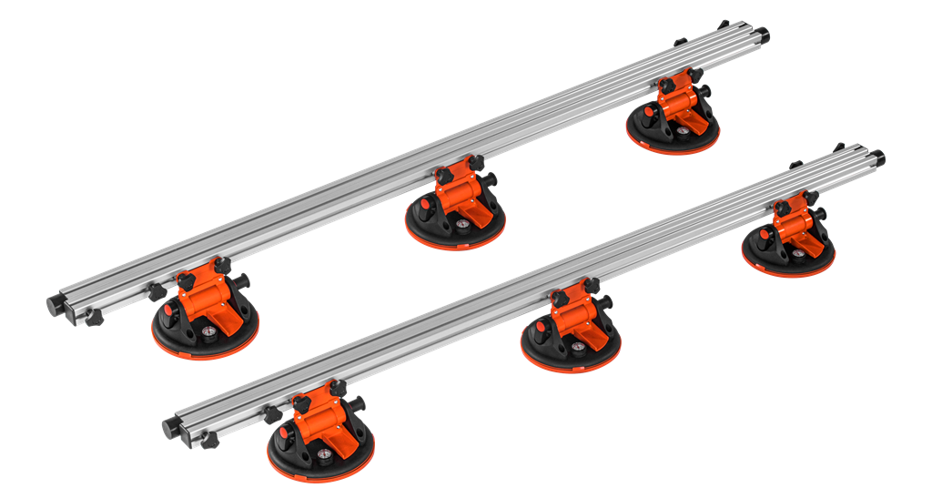 Dwie belki krzyżowe i cztery metalowe łączniki umożliwiają dostosowanie rozstawu przyssawek do różnych formatów płyt. Śruby obrotowe (40 szt. w zestawie) pozwalają na precyzyjne ustawienie kąta i pozycji każdego punktu mocowania.