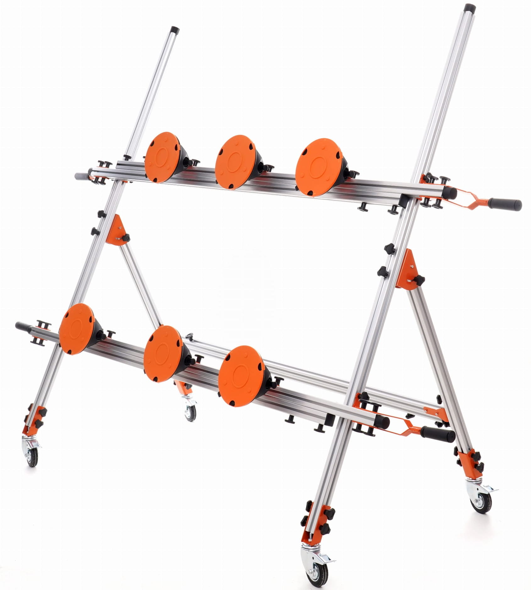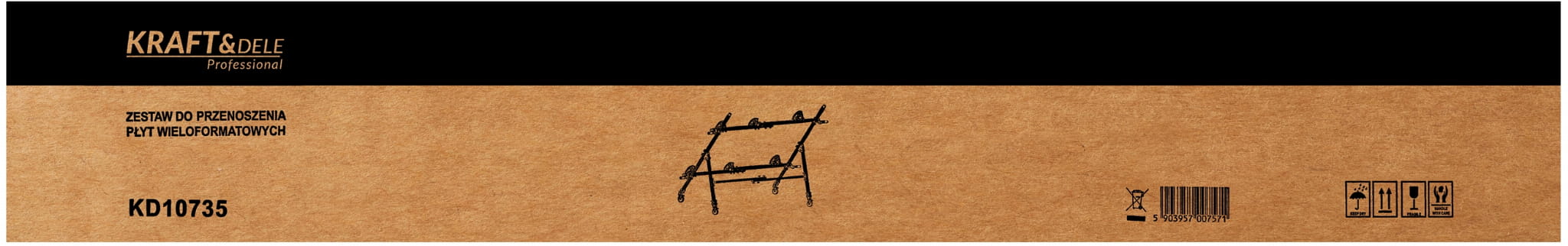 KD10735 to aluminiowy przenośnik przeznaczony do bezpiecznego transportu płytek ceramicznych wielkoformatowych oraz szyb o długości od 160 do 360 cm. Konstrukcja oparta na profilach aluminiowych z belkami poprzecznymi umożliwia obsługę ciężkich elementów przez jedną lub dwie osoby bez konieczności stosowania dodatkowego sprzętu dźwigowego.