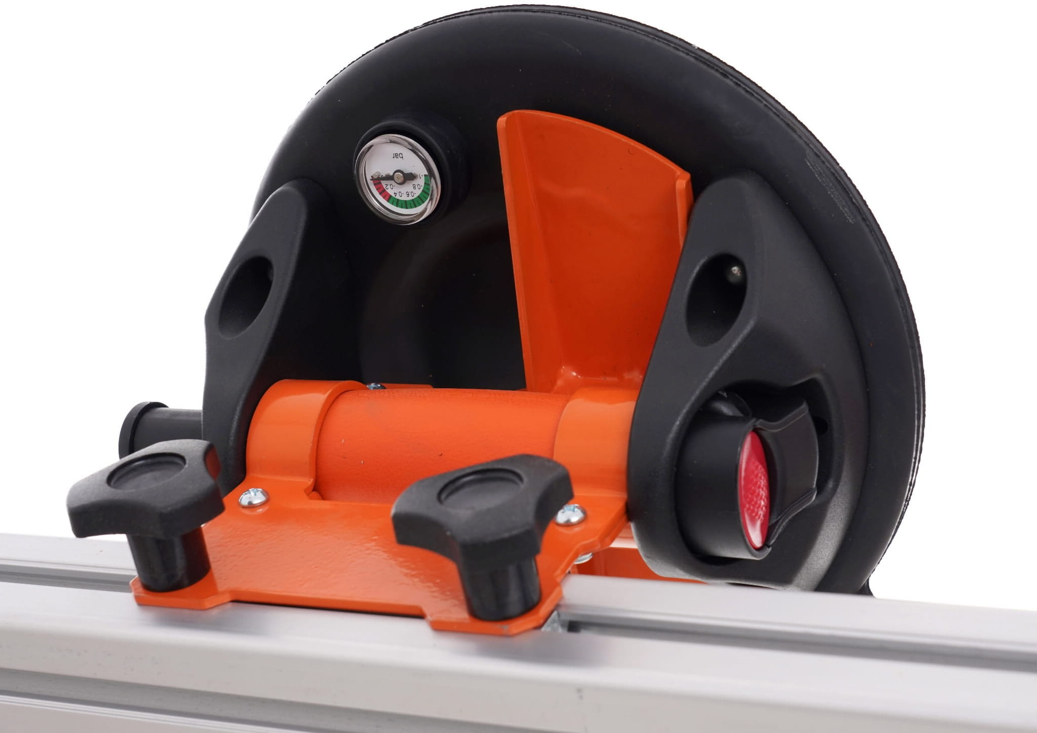 Przyssawki mocuje się bezpośrednio do powierzchni płytki lub szyby. Pompka pozwala wytworzyć podciśnienie i sprawdzić szczelność połączenia przed podniesieniem materiału. Sześć punktów mocowania rozłożonych wzdłuż ramy redukuje ryzyko odkształcenia lub zsunięcia się elementu.