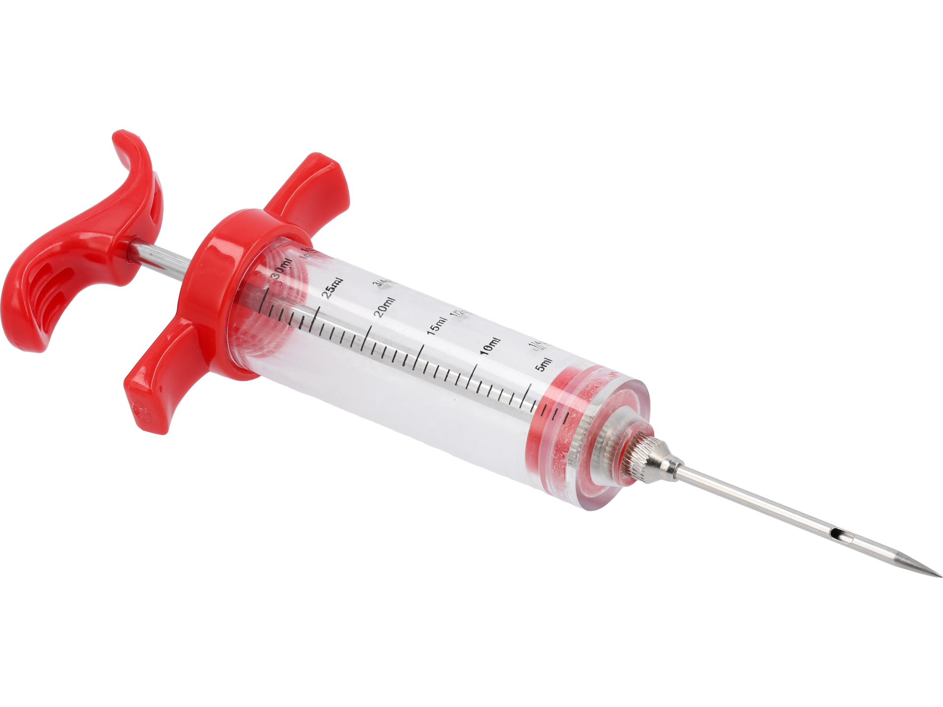 Pojemnik z tworzywa PP i akrylu z podziałką co 5 ml, igła ze stali nierdzewnej długości 8,6 cm. Silkonowy pierścień zapewnia szczelność. Umożliwia precyzyjne wprowadzanie płynnych marynat, bulionów lub roztopionego masła bezpośrednio do wnętrza mięsa, zwiększając jego soczystość.