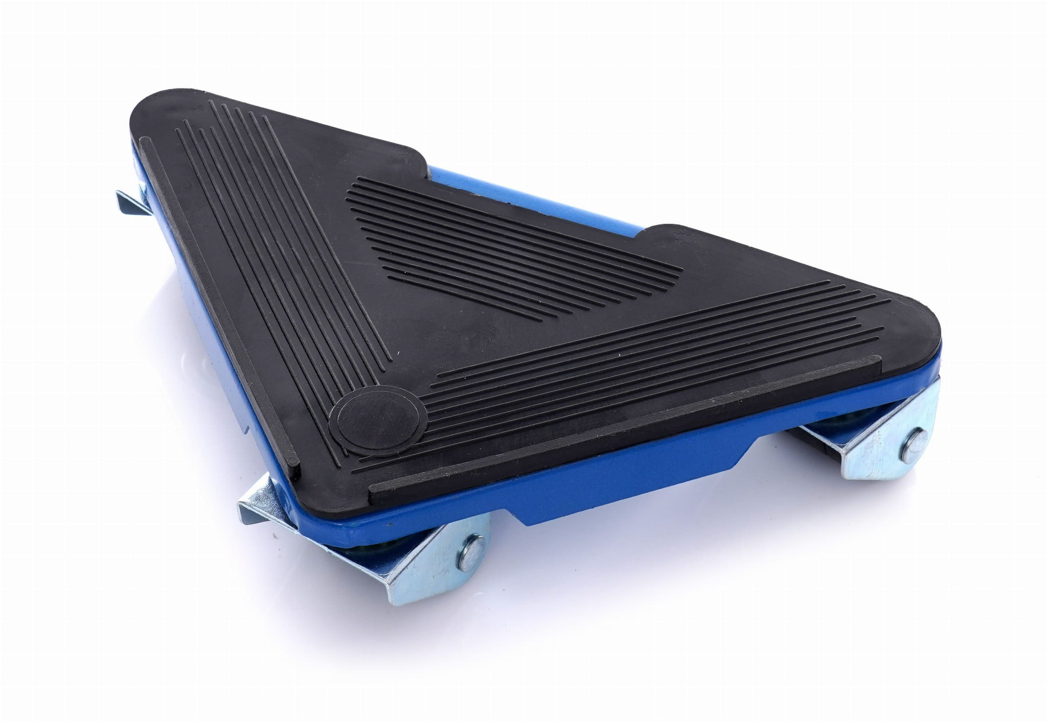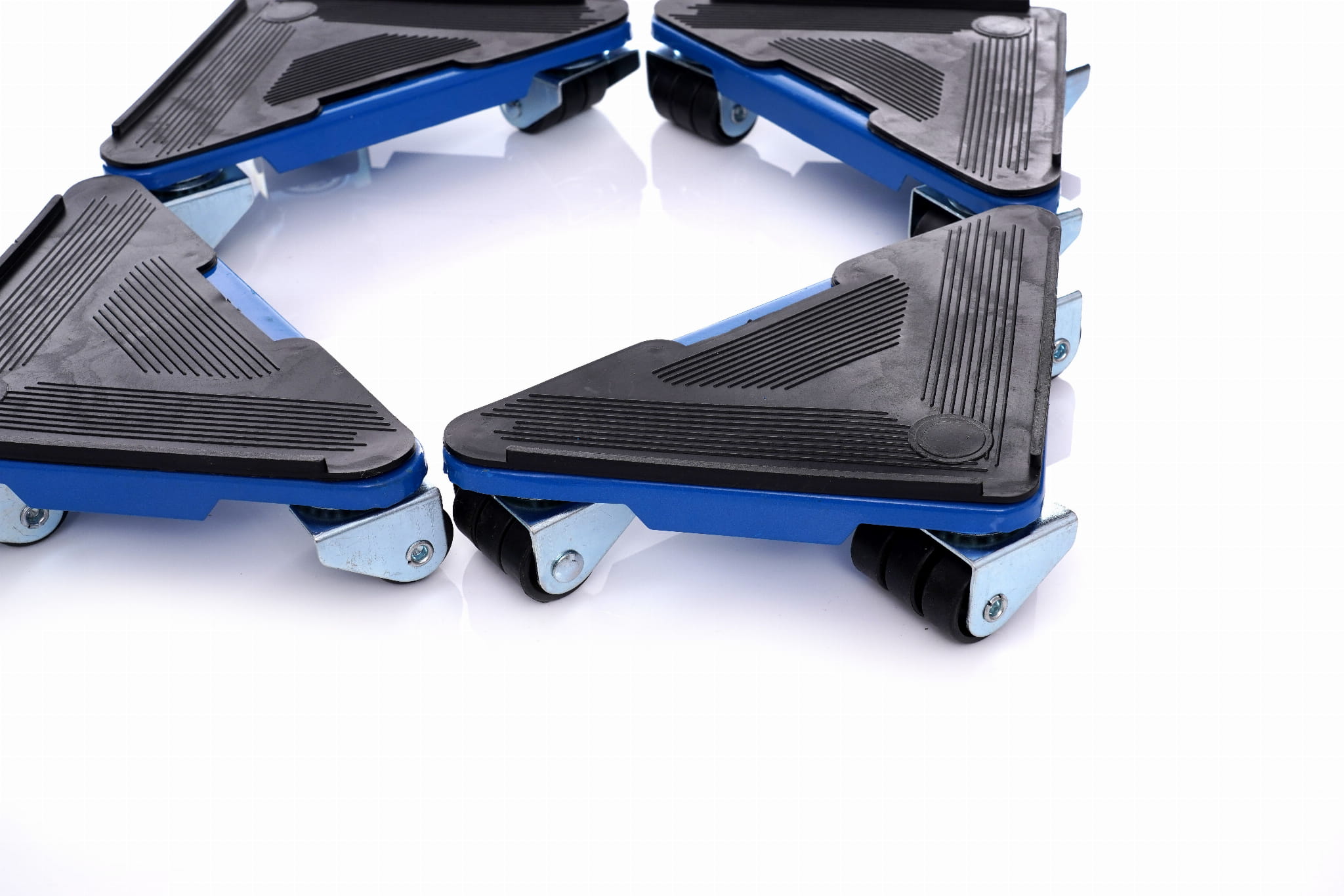 Dźwignią unieść krawędź lub narożnik mebla na tyle, by uzyskać prześwit wystarczający do wsunięcia podstawki (ok. 5 cm). Wsunąć podstawkę z rolkami pod uniesiony narożnik, a następnie opuścić mebel. Czynność powtórzyć dla każdej z czterech podstawek. Po ustawieniu wszystkich podstawek mebel można swobodnie przesuwać w dowolnym kierunku. Przed użyciem sprawdzić, czy łączna masa przenoszonego przedmiotu nie przekracza 300 kg oraz czy ciężar rozkłada się równomiernie na wszystkie cztery podstawki (max. 75 kg każda).