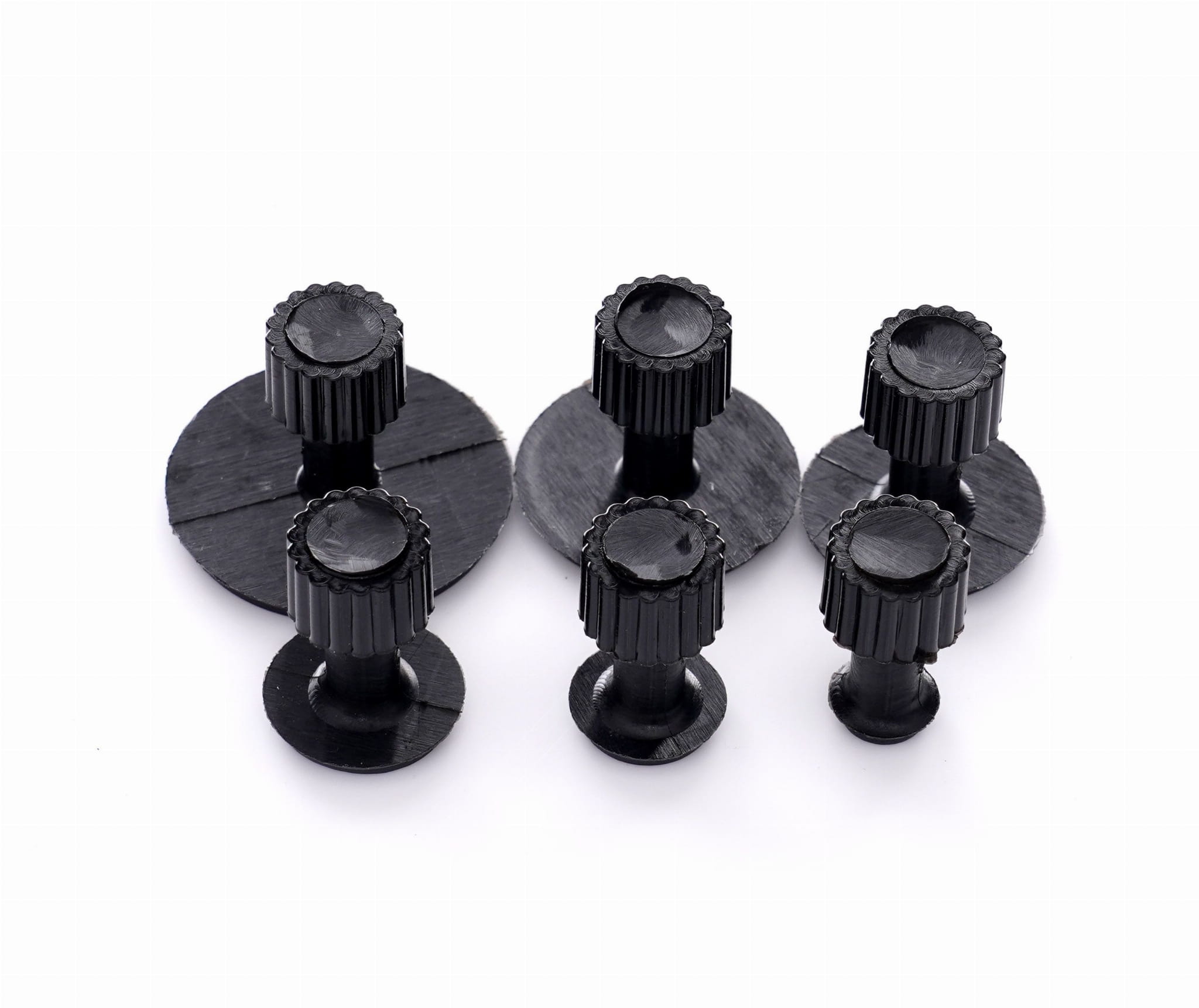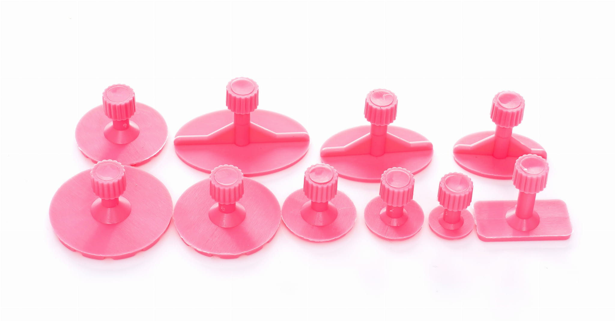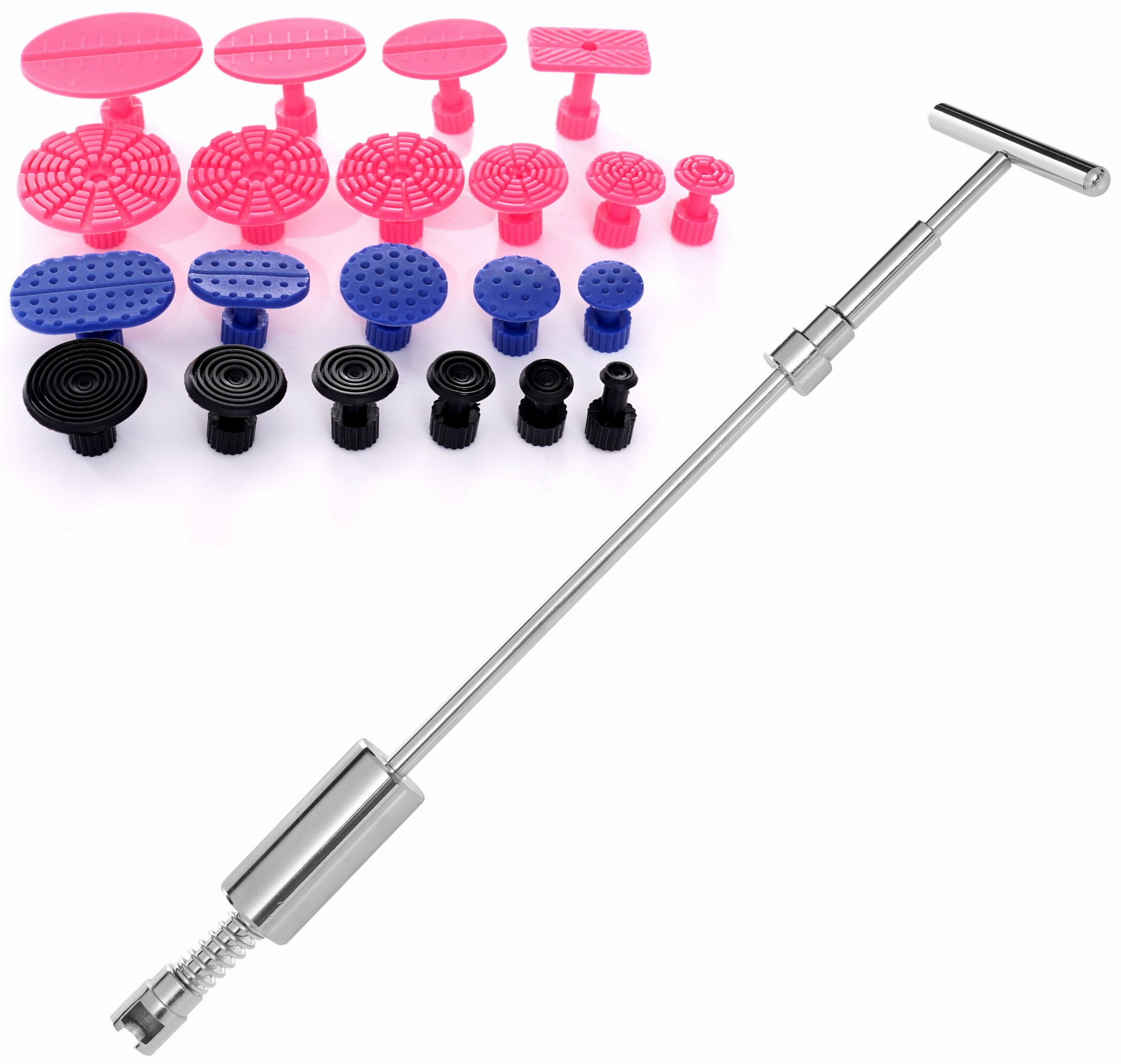 Zestaw zawiera 5 niebieskich, 4 żółte i 10 czerwonych adapterów. Różne średnice i profile pozwalają dopasować narzędzie do rozmiaru wgniecenia — mniejsze adaptery sprawdzają się przy precyzyjnych, punktowych deformacjach, większe przy rozleglejszych uszkodzeniach.