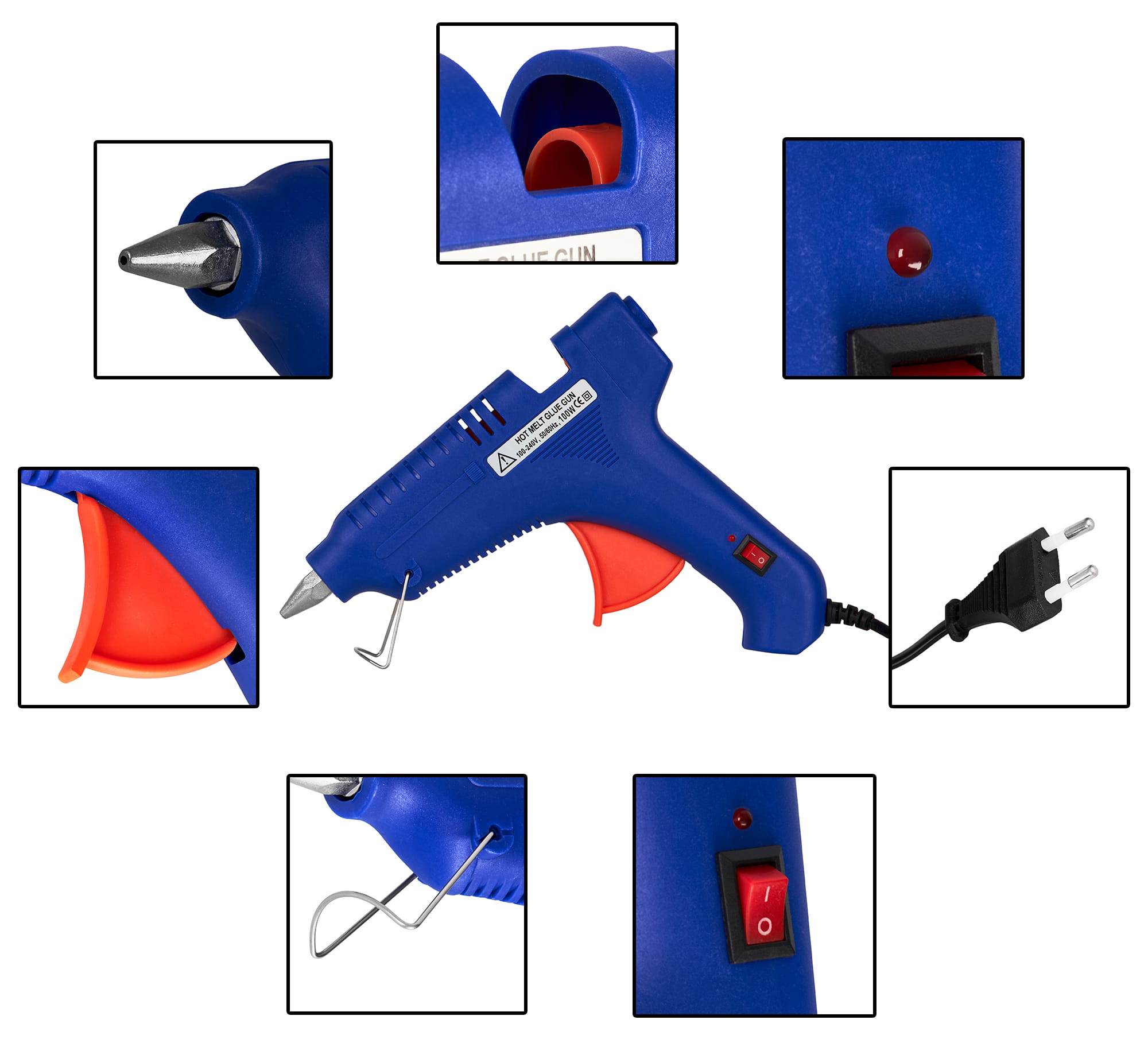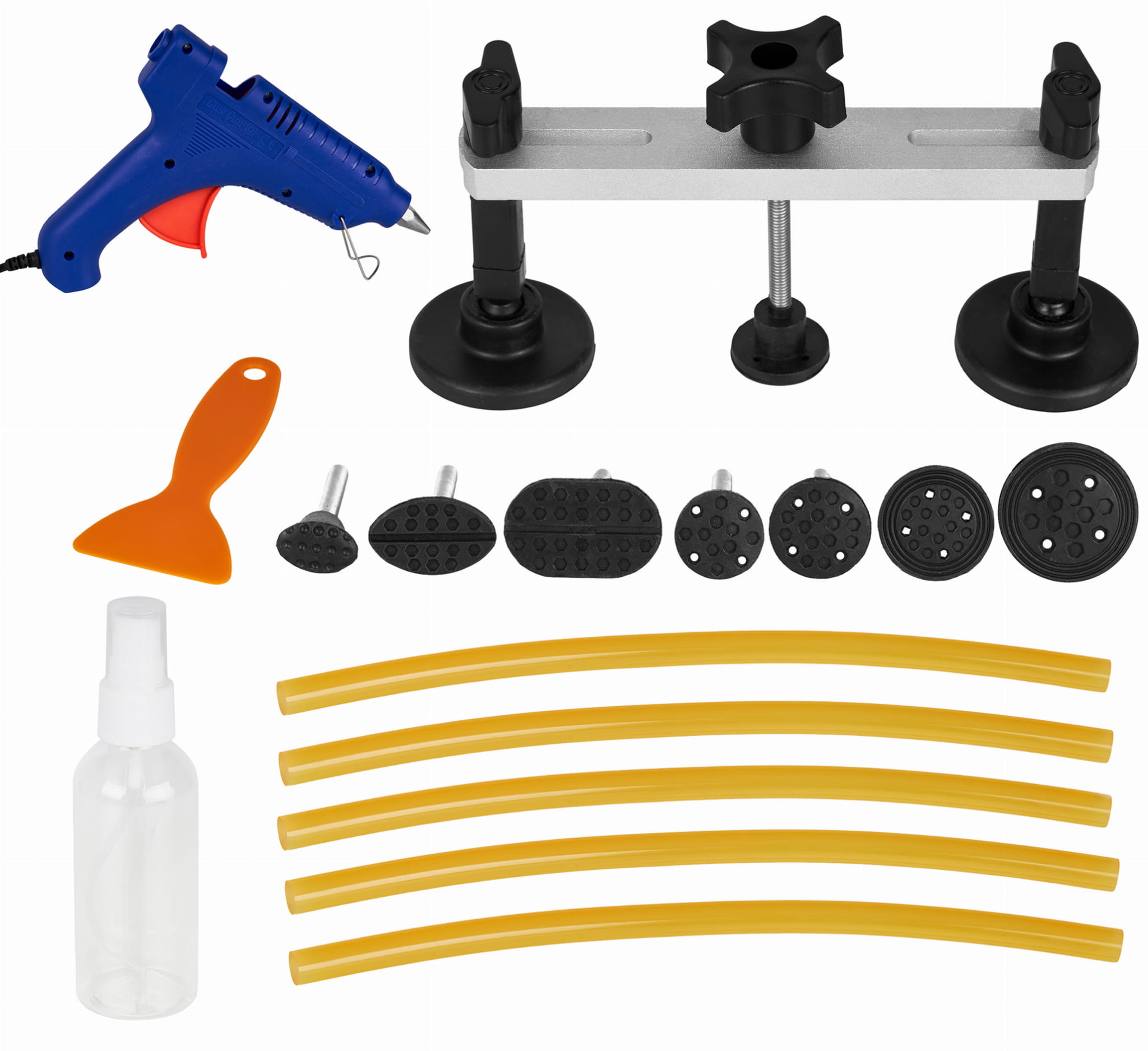 Dołączony pistolet eliminuje potrzebę zakupu osobnego urządzenia. Klej termiczny (5 sztyftów w zestawie) osiąga odpowiednią lepkość po podgrzaniu, zapewniając pewne połączenie adaptera z powierzchnią karoserii na czas trwania naprawy.