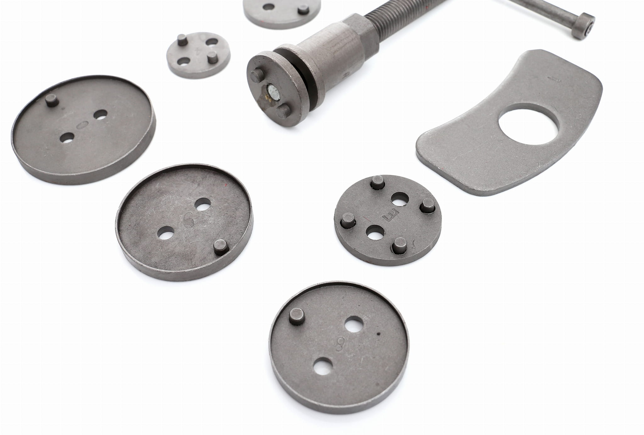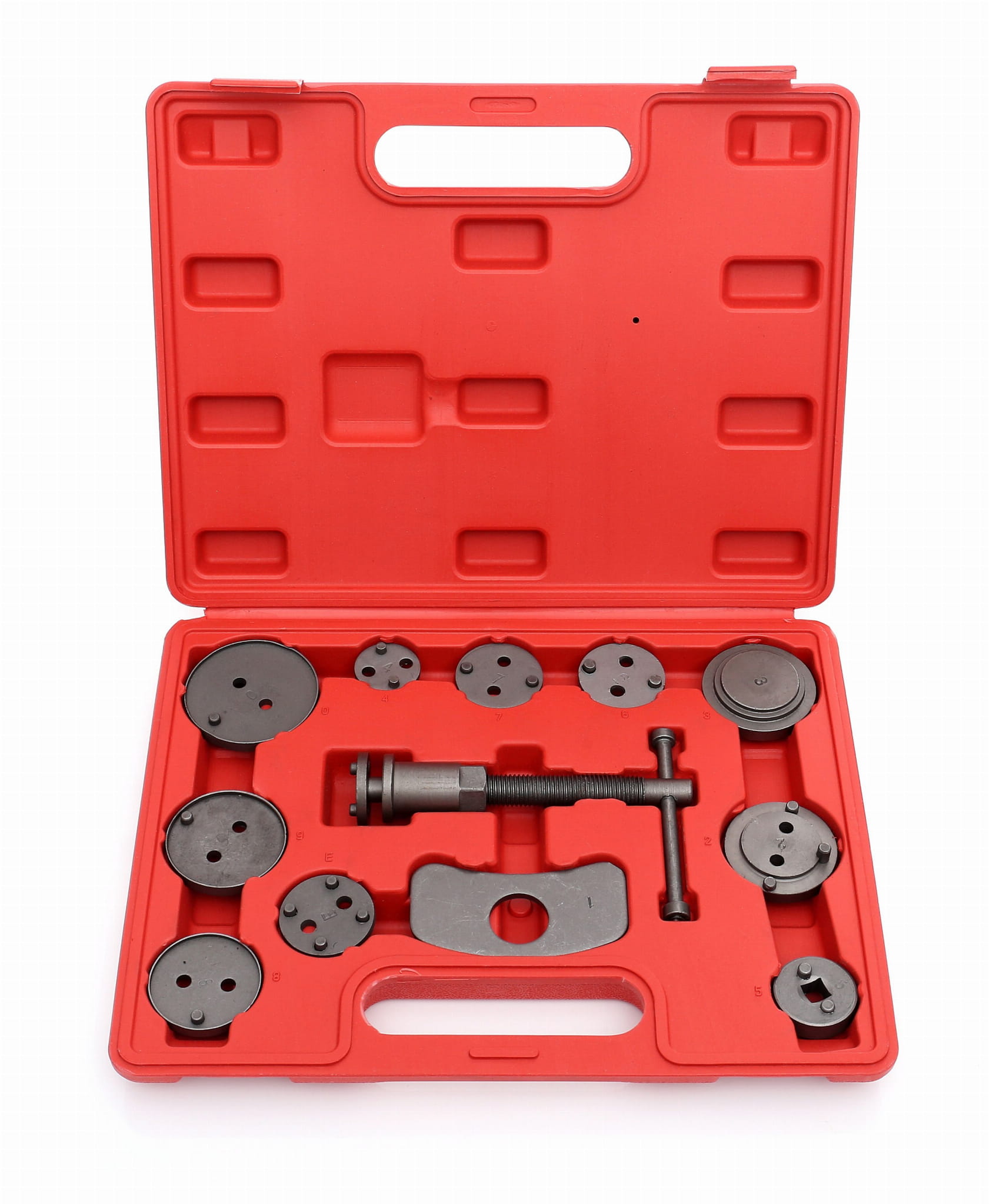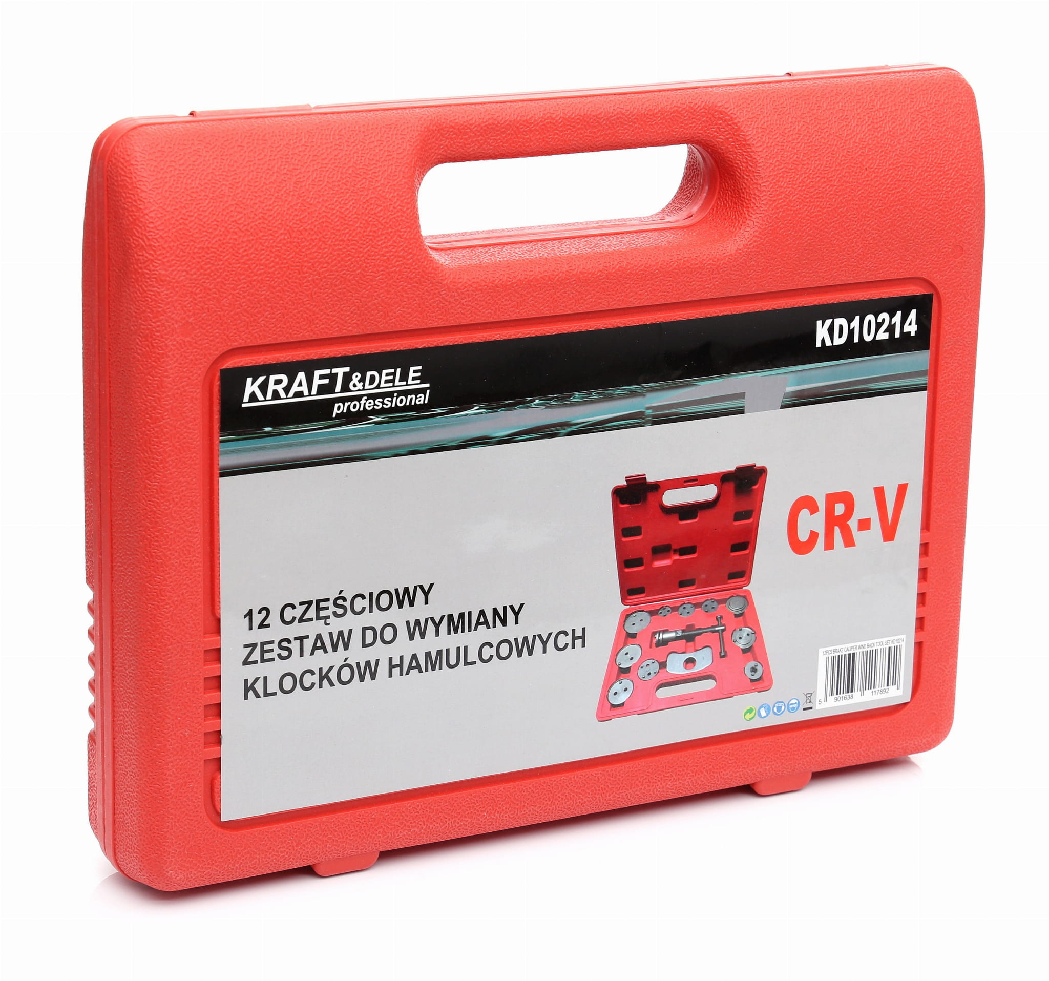 KD10214 to kompletny zestaw narzędzi przeznaczony do wciskania i cofania tłoczków hamulcowych podczas wymiany klocków hamulcowych w samochodach osobowych. Zestaw obsługuje zaciski z tłoczkiem wciskanym (prawa i lewa strona) oraz tłoczkiem wkręcanym, co pozwala na pracę przy większości konstrukcji stosowanych w pojazdach europejskich i azjatyckich.