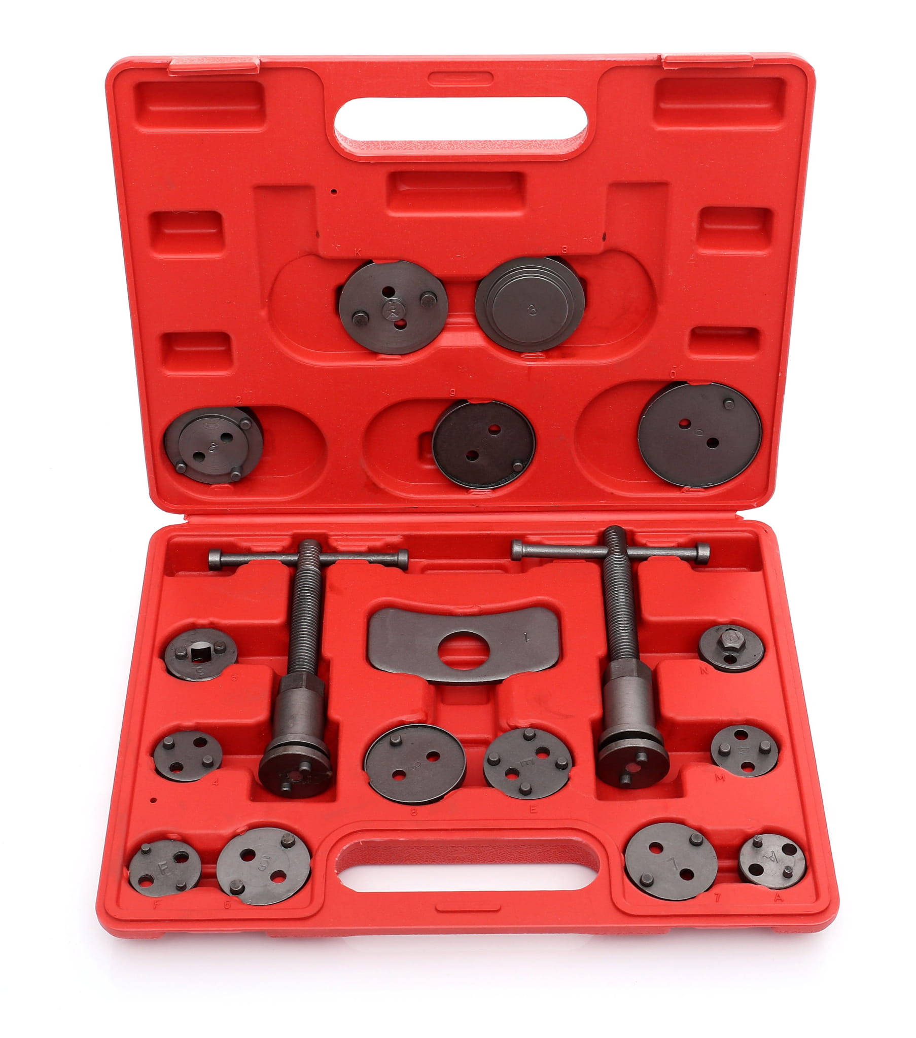 18 elementów zebranych w jednym zestawie pozwala przeprowadzić wymianę klocków hamulcowych bez konieczności sięgania po dodatkowe narzędzia — wszystkie niezbędne adaptery i końcówki znajdują się w jednym miejscu.