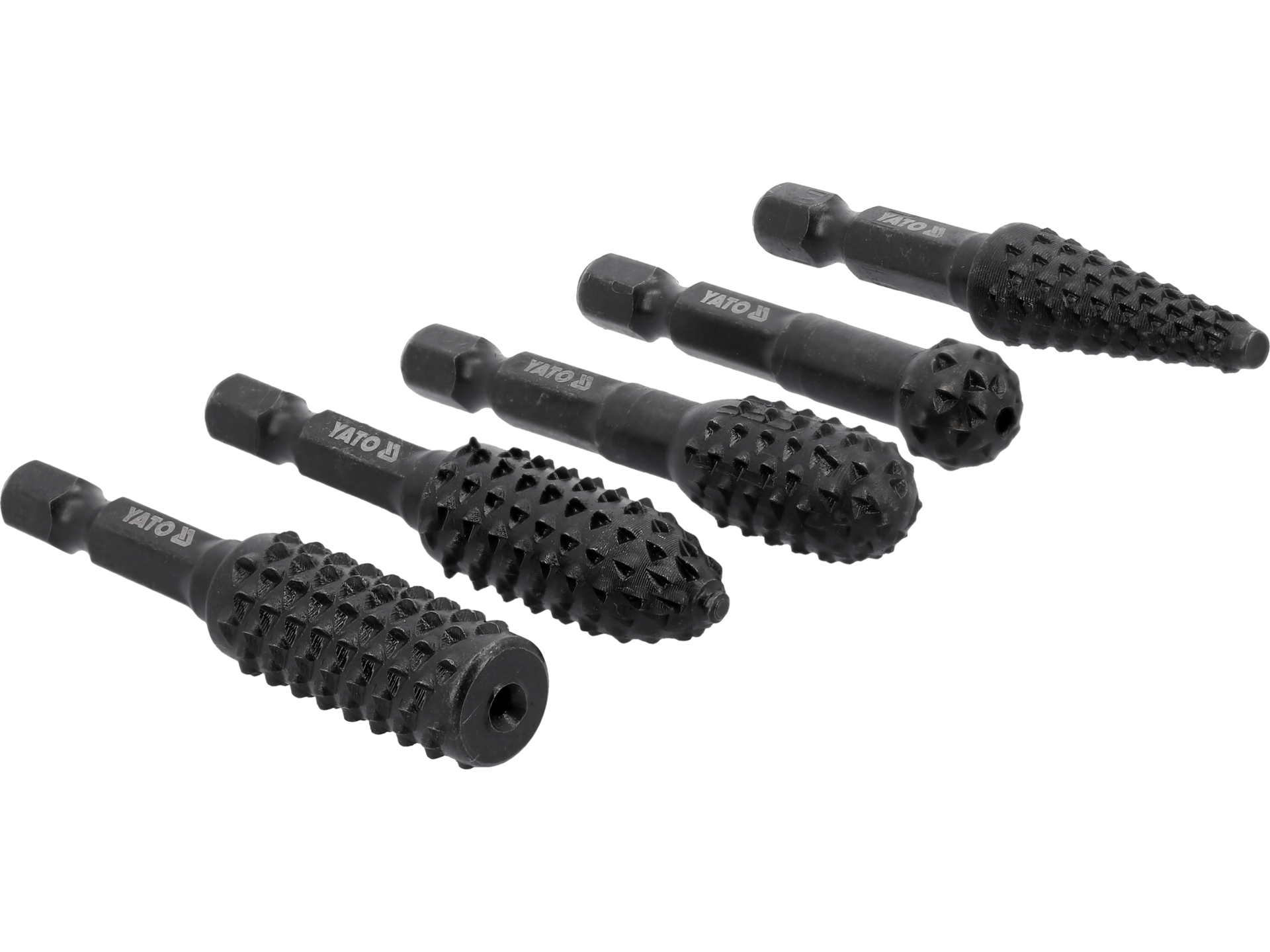 Kompletny zestaw pięciu frezów do obróbki drewna z uchwytem sześciokątnym HEX 1/4", wykonanych ze stali węglowej #45 z oksydowaną powierzchnią. Narzędzia przeznaczone do prac stolarskich, montażowych i wykończeniowych w drewnie, płytach wiórowych i sklejce.