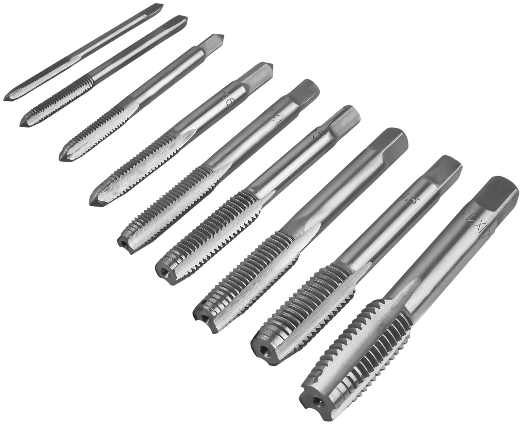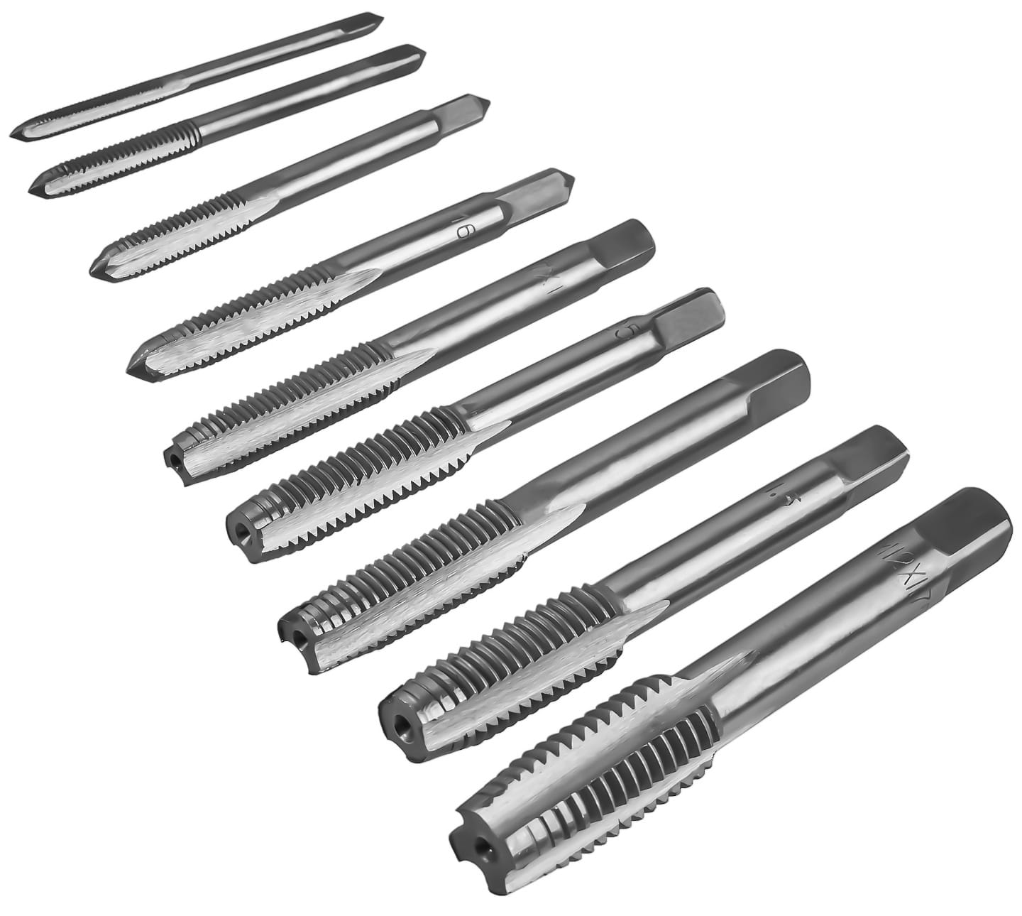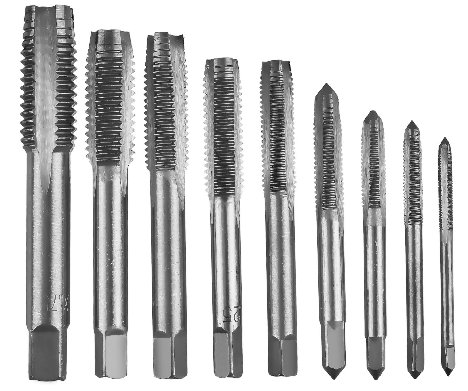 Gwintownik wkręca się w uprzednio nawiercony otwór i nacina w nim gwinty — np. pod śruby lub wkręty. Zestaw zawiera 9 gwintowników w rozmiarach M3 do M12 ze skokami zgodnymi z normą metryczną oraz jeden gwintownik 1/8 NPT27 do instalacji hydraulicznych i pneumatycznych.