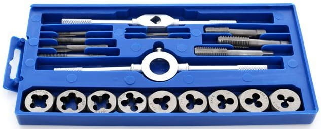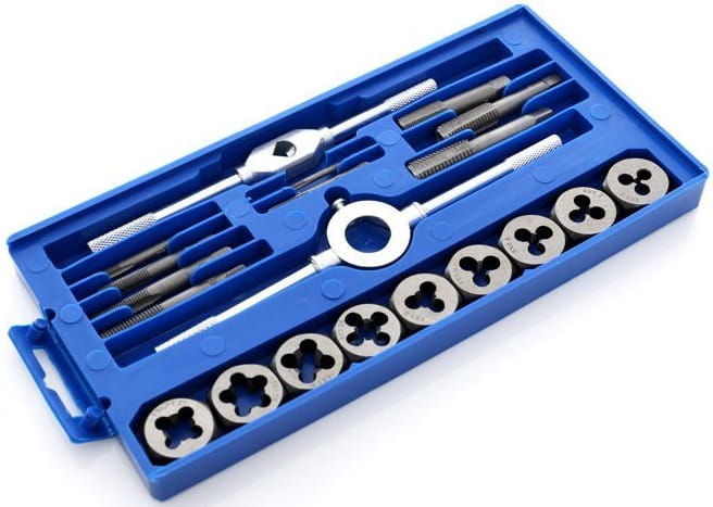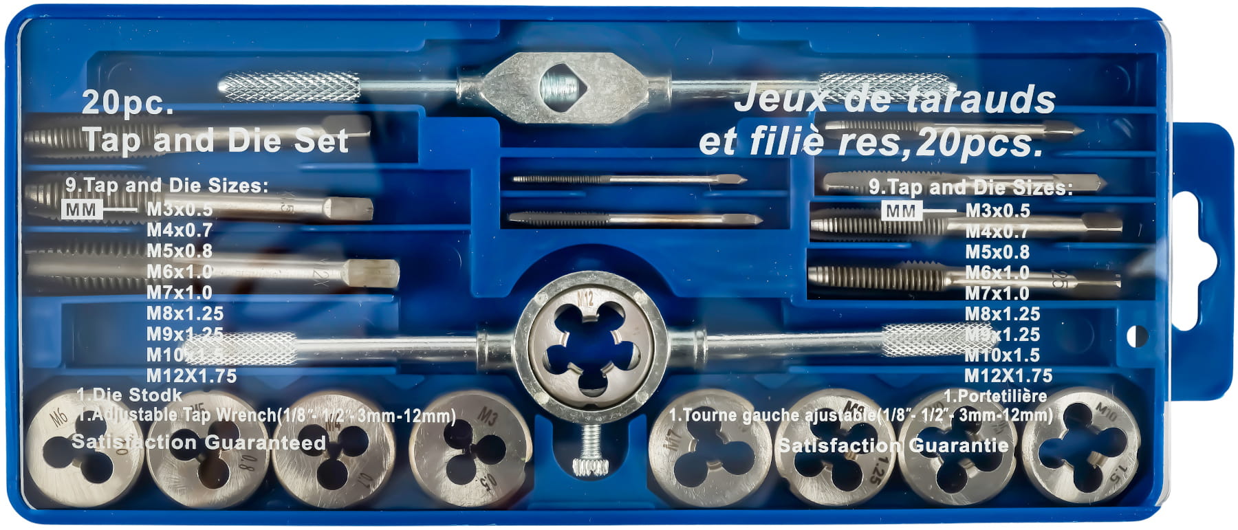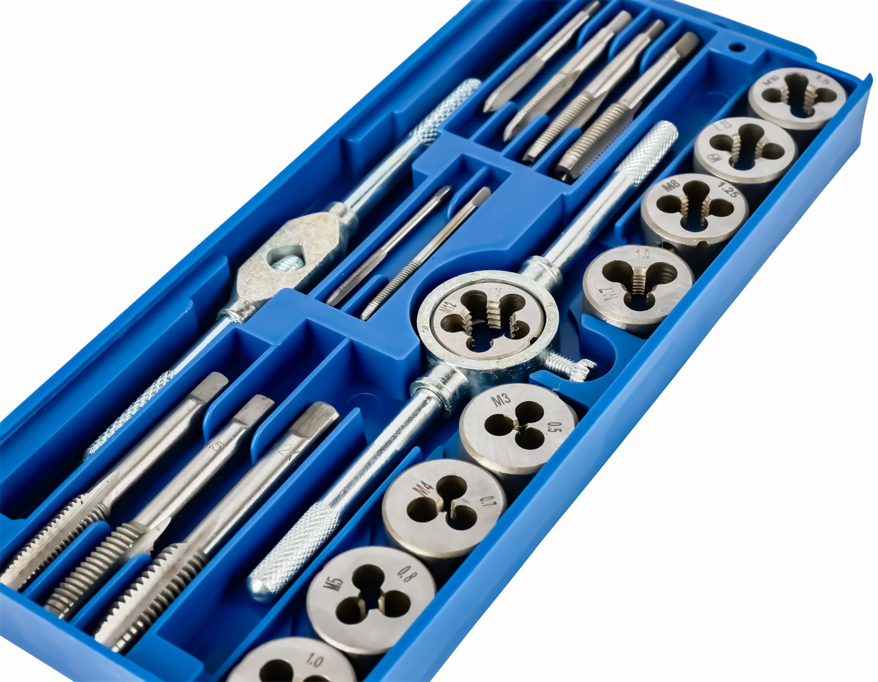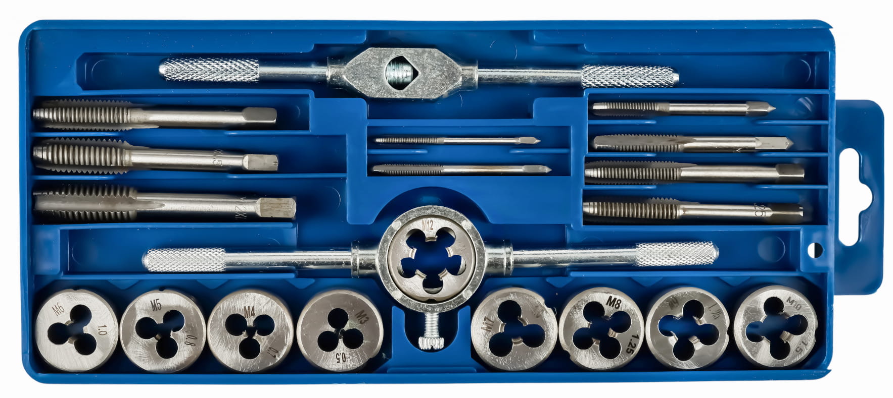 Gwintownik wkręca się w uprzednio nawiercony otwór i nacina w nim gwinty — np. pod śruby lub wkręty. Zestaw zawiera 9 gwintowników w rozmiarach M3 do M12 ze skokami zgodnymi z normą metryczną oraz jeden gwintownik 1/8 NPT27 do instalacji hydraulicznych i pneumatycznych.