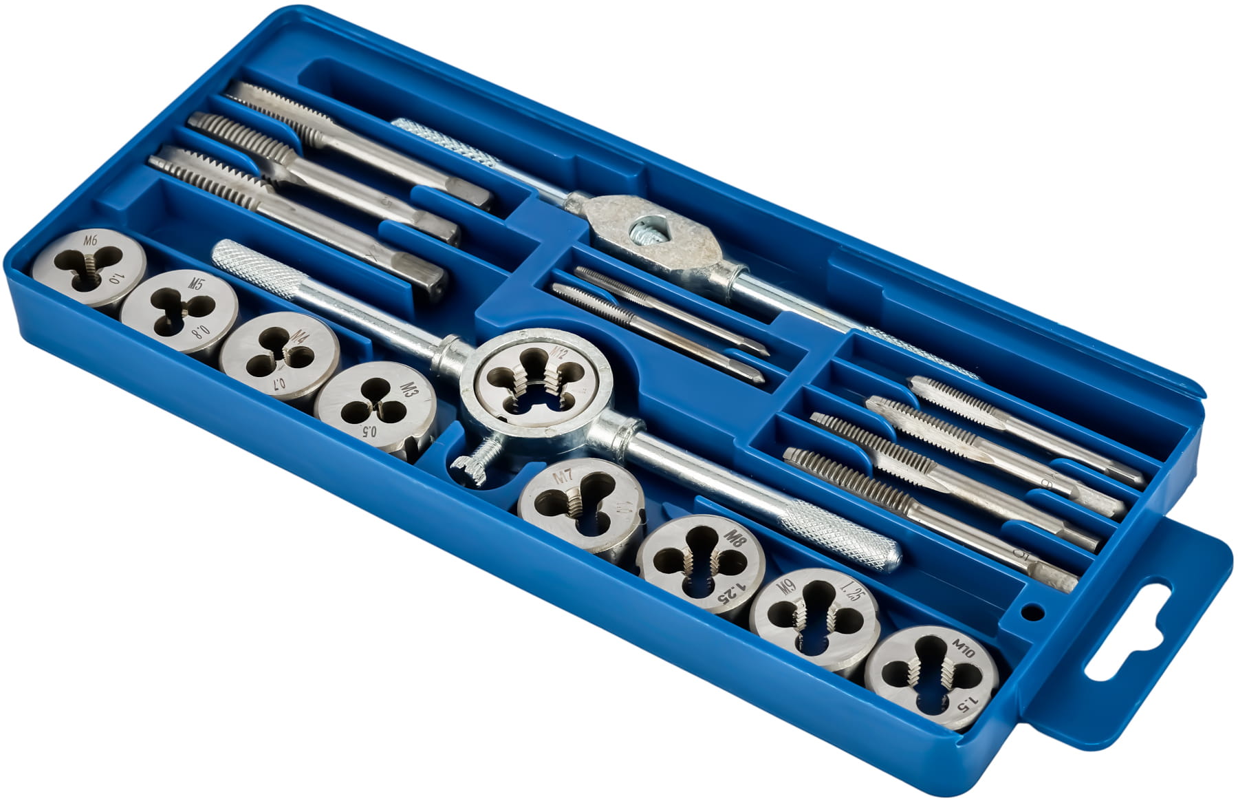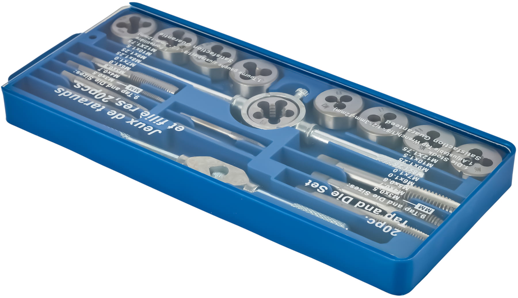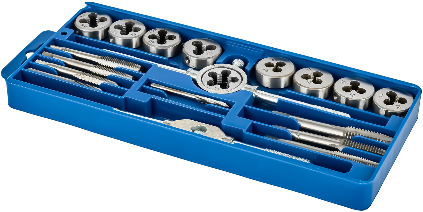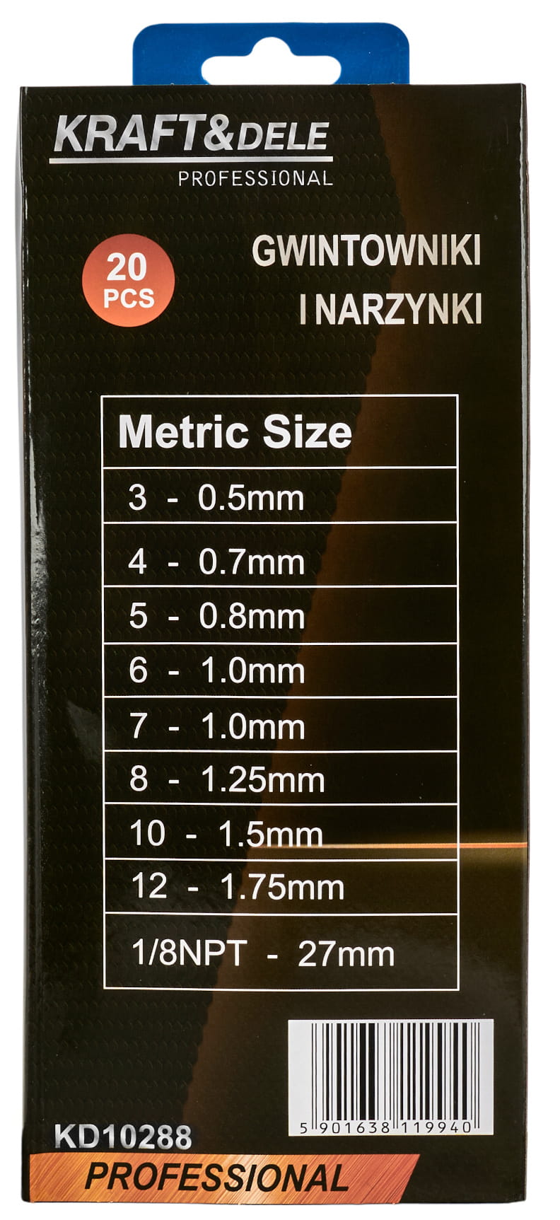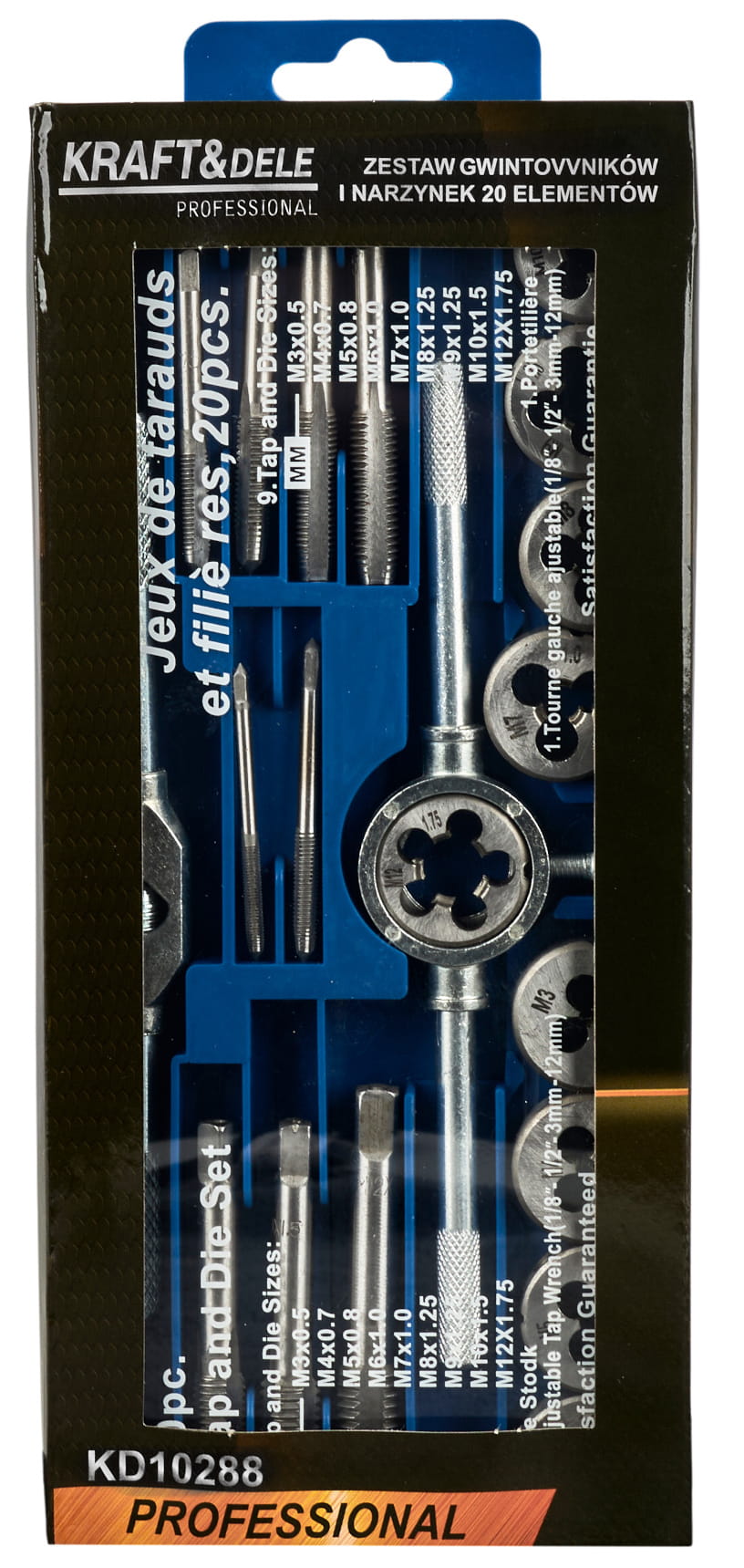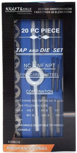 KD10288 to komplet 20 narzędzi do ręcznego nacinania gwintów metrycznych oraz calowych NPT. Zestaw obejmuje gwintowniki do gwintów wewnętrznych (otworów i nakrętek), narzynki do gwintów zewnętrznych (śrub i prętów) w zakresie M3–M12 oraz 1/8 NPT27, a także dwa uchwyty robocze. Narzędzia wykonano ze stali utwardzanej, co zapewnia odporność na zużycie podczas pracy z metalem.