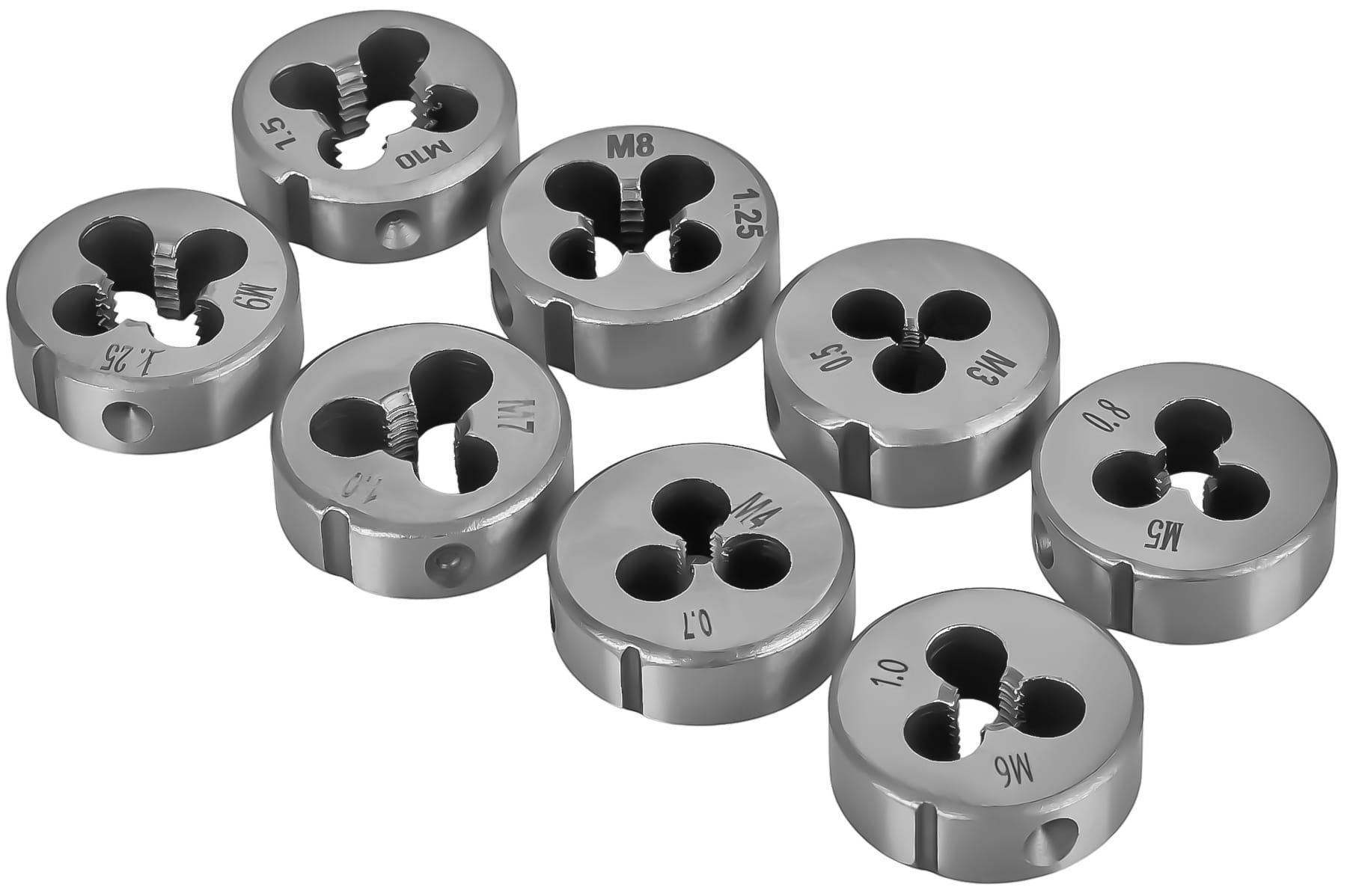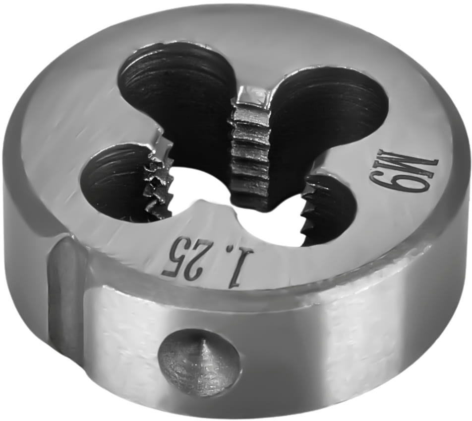 Narzynka nakładana jest na pręt lub bolec i nacina na nim gwint zewnętrzny — np. przy naprawie uszkodzonego gwintu śruby lub wykonywaniu gwintowanego zakończenia pręta. Zestaw zawiera 9 narzynek odpowiadających rozmiarami gwintownikom, w tym rozmiar NPT27 do rur i złączy.