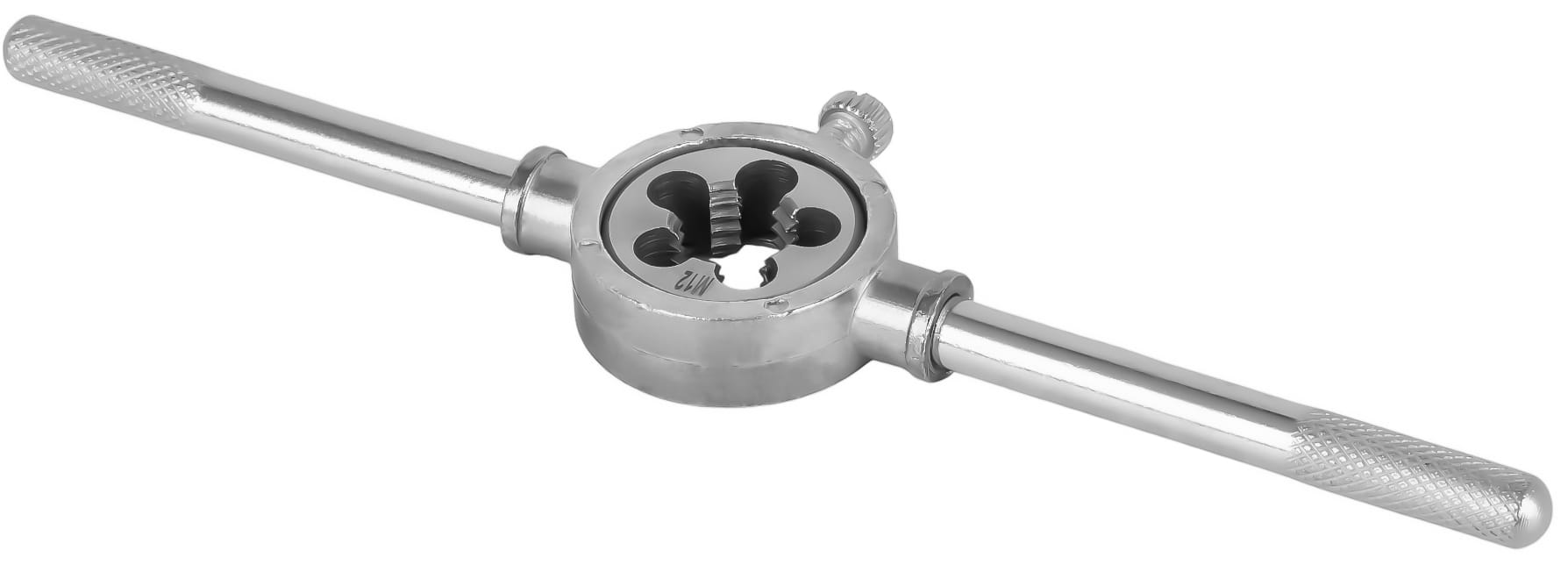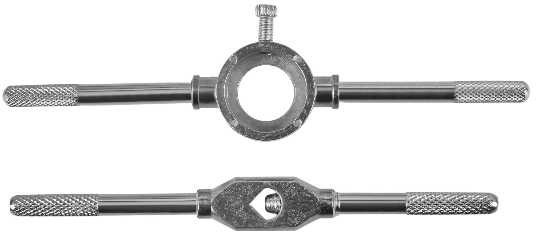 W zestawie znajdują się dwa pokrętła: uchwyt do gwintowników (oprawka z zaciskiem) oraz oprawka do narzynek (pokrętło z rowkami ustalającymi). Obecność obu uchwytów pozwala na natychmiastowe rozpoczęcie pracy bez konieczności dokupowania dodatkowych akcesoriów.
