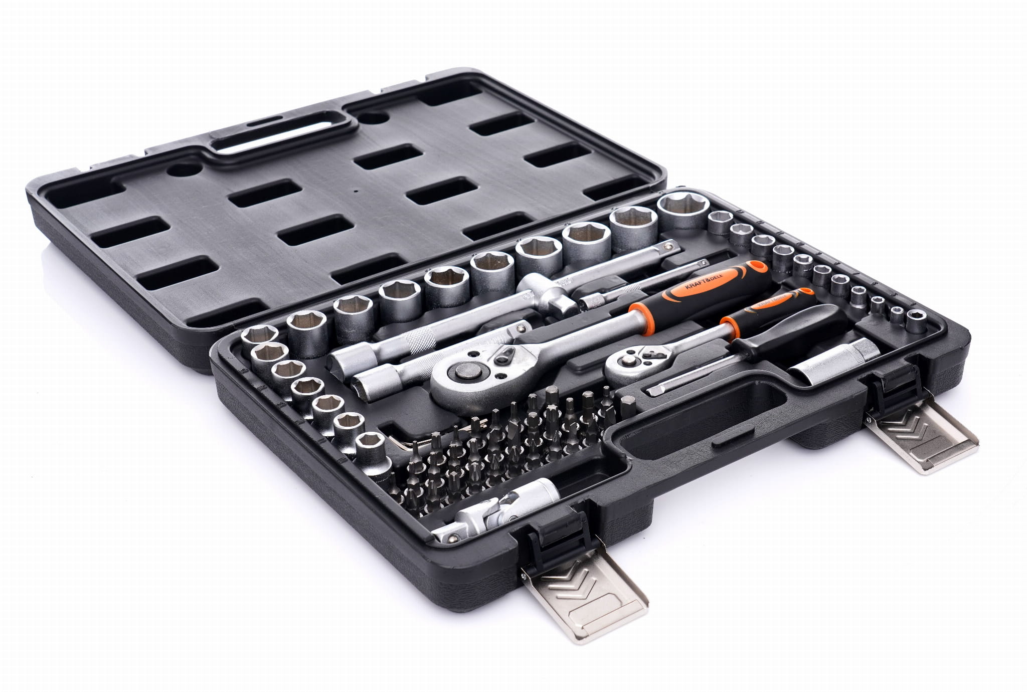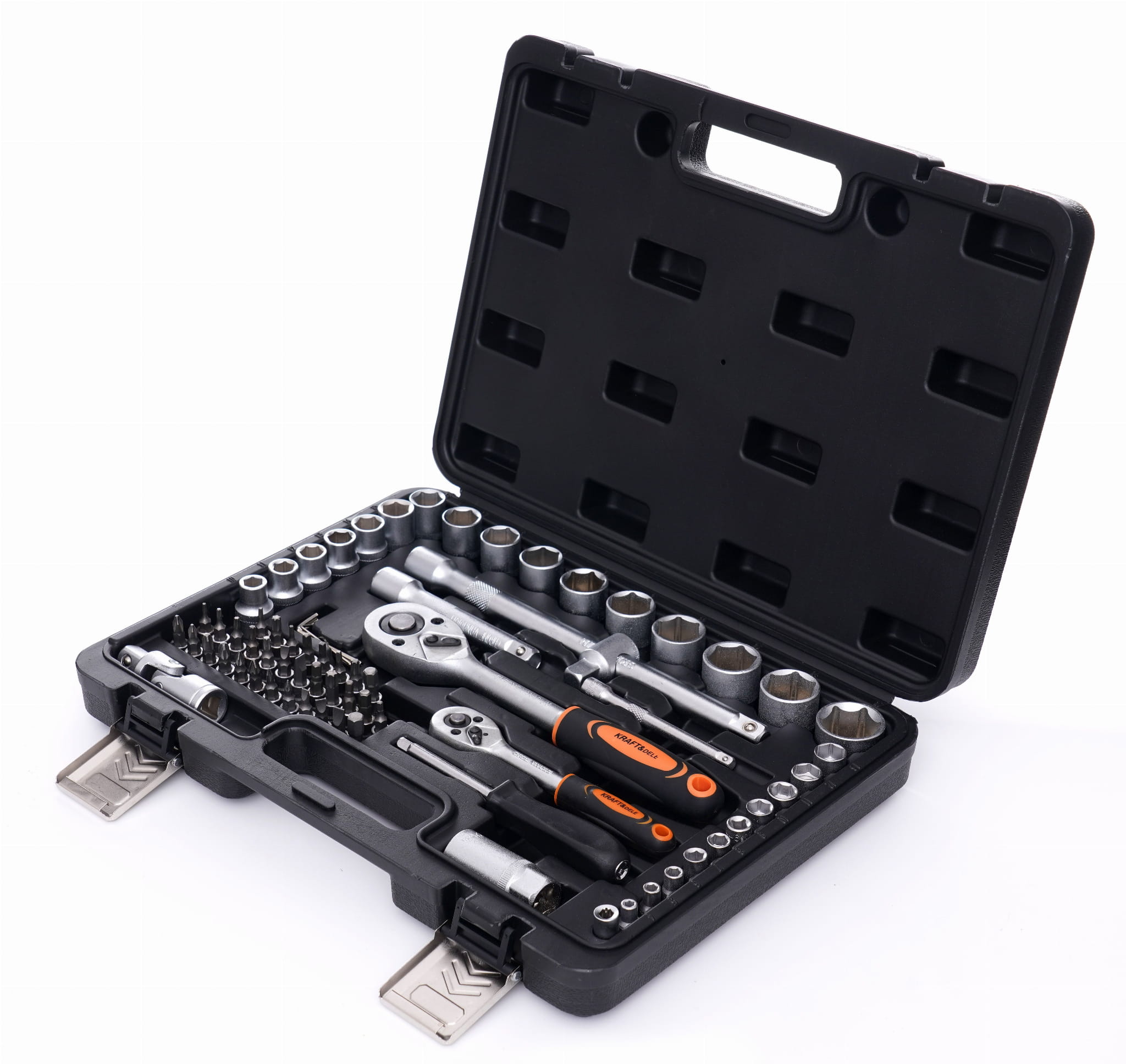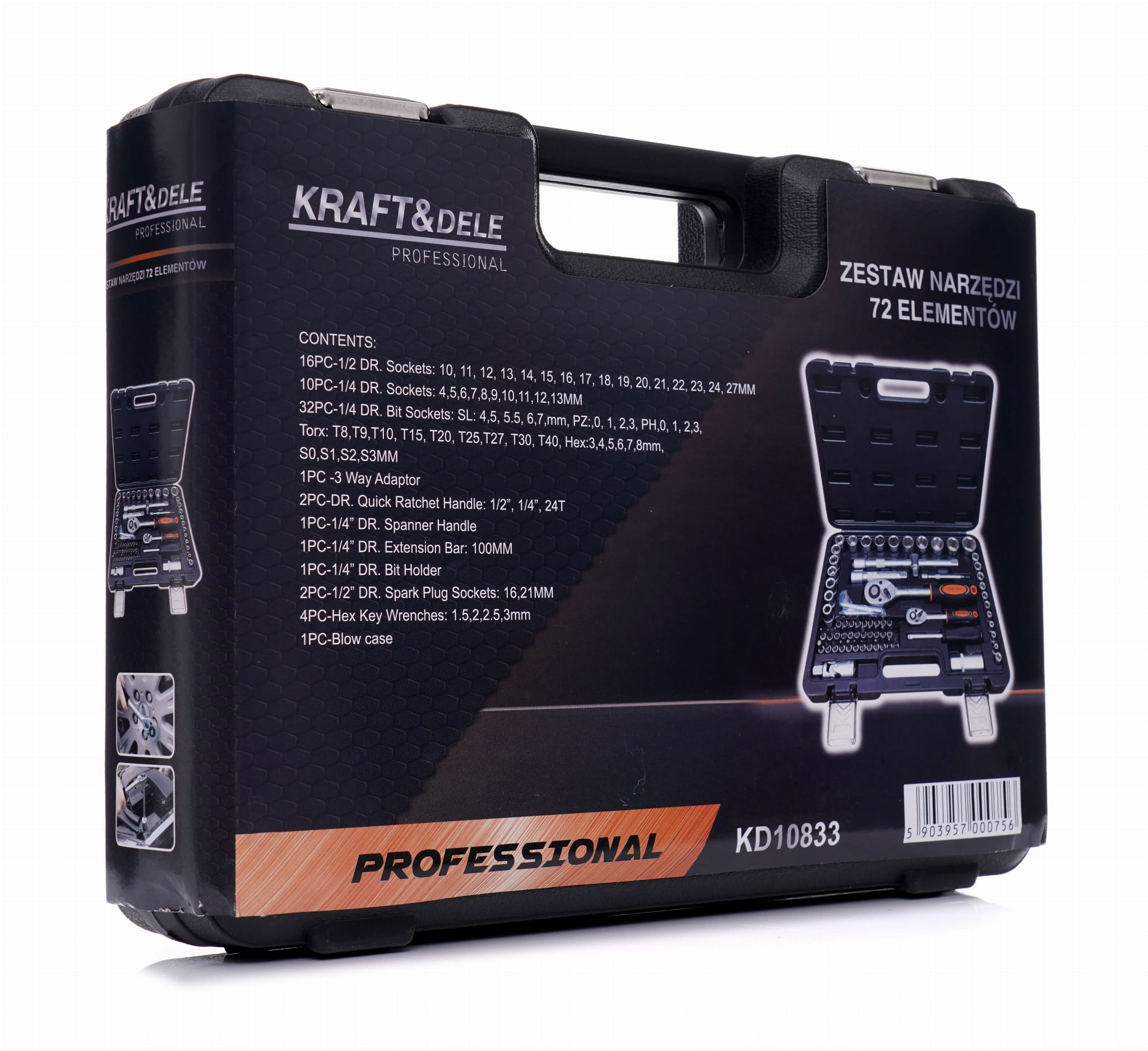 KD10833 to komplet narzędzi śrubokrętowych i kluczy nasadowych obejmujący dwa napędy (1/2" i 1/4"), pełny zestaw nasadek metrycznych, bity wielofunkcyjne oraz akcesoria pomocnicze. Zestaw przeznaczony do prac montażowych, serwisowych i naprawczych w warsztacie oraz zastosowaniach domowych.
