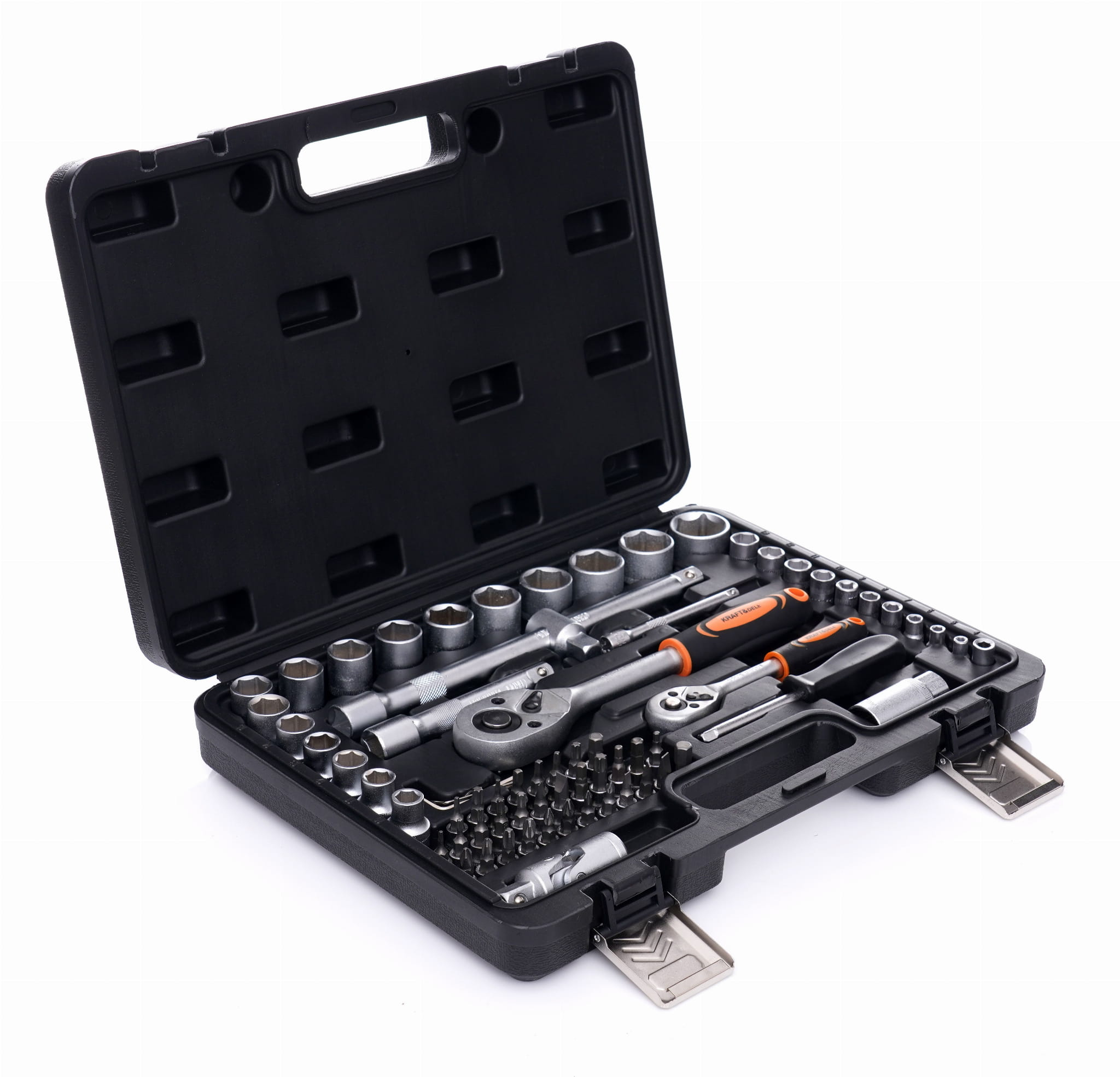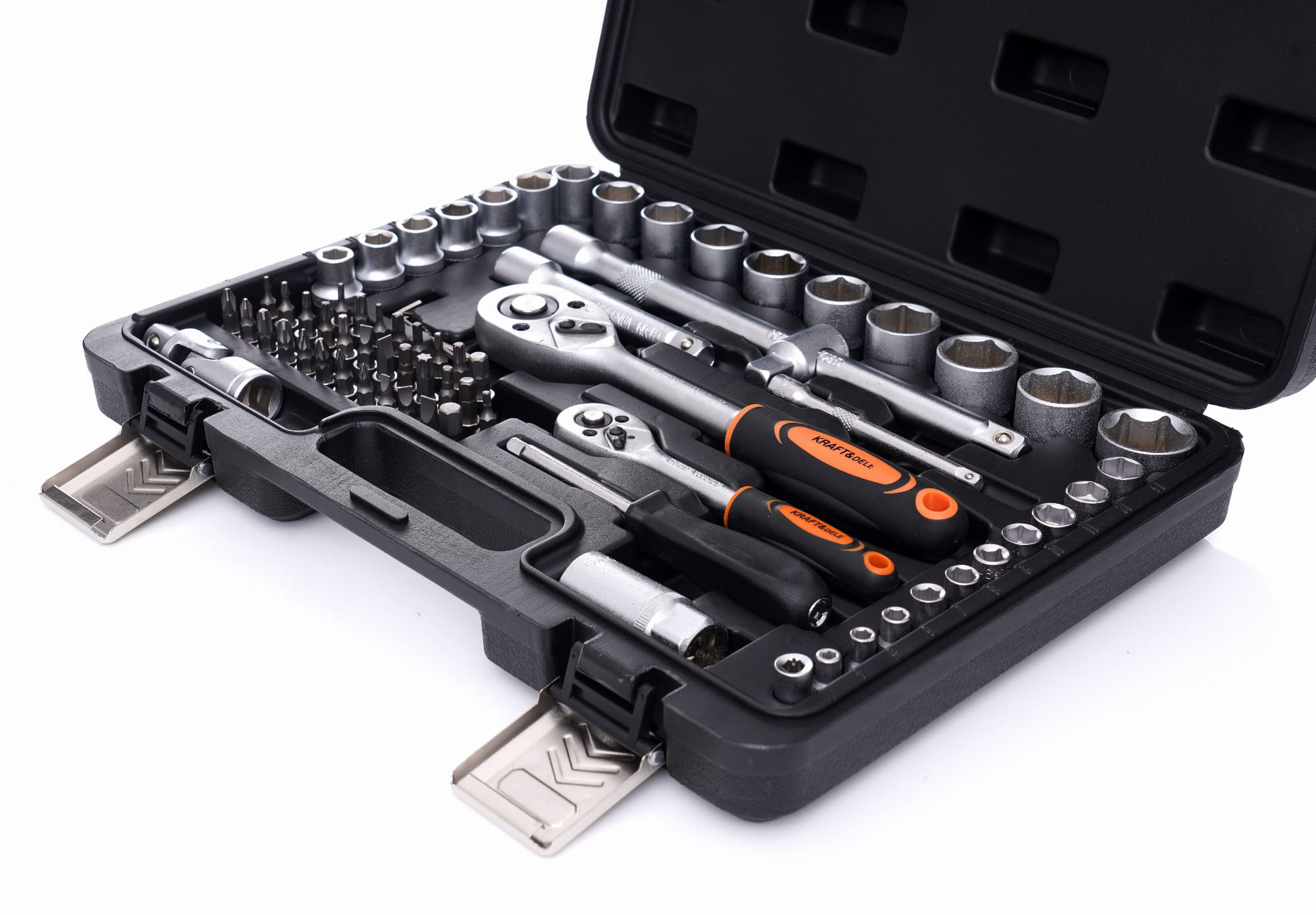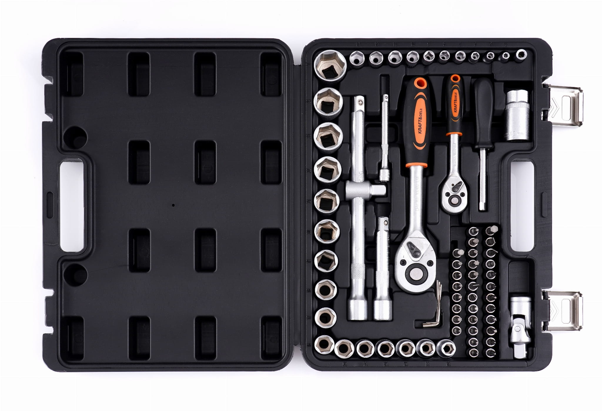 KD10833 to komplet narzędzi śrubokrętowych i kluczy nasadowych obejmujący dwa napędy (1/2" i 1/4"), pełny zestaw nasadek metrycznych, bity wielofunkcyjne oraz akcesoria pomocnicze. Zestaw przeznaczony do prac montażowych, serwisowych i naprawczych w warsztacie oraz zastosowaniach domowych.