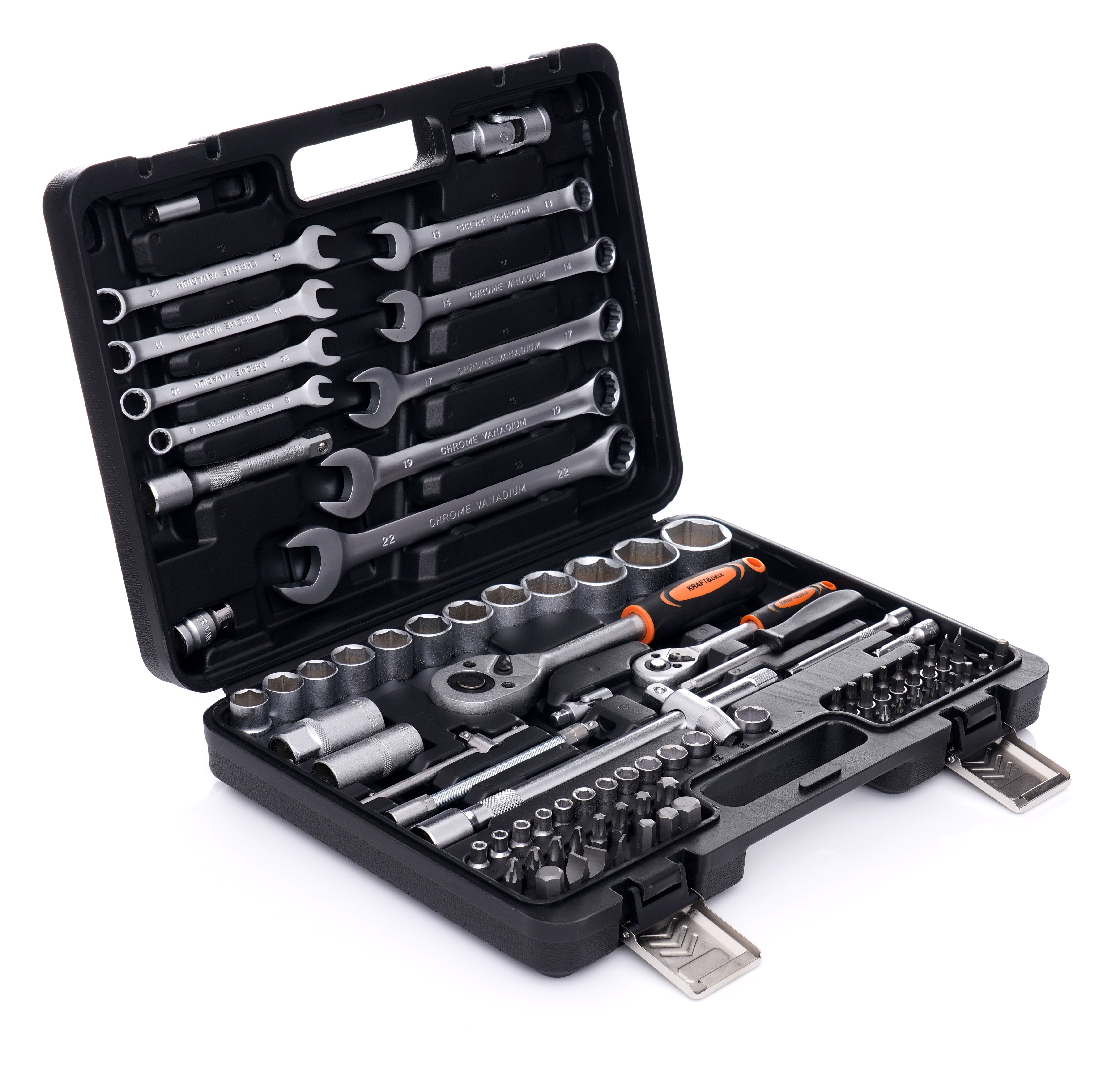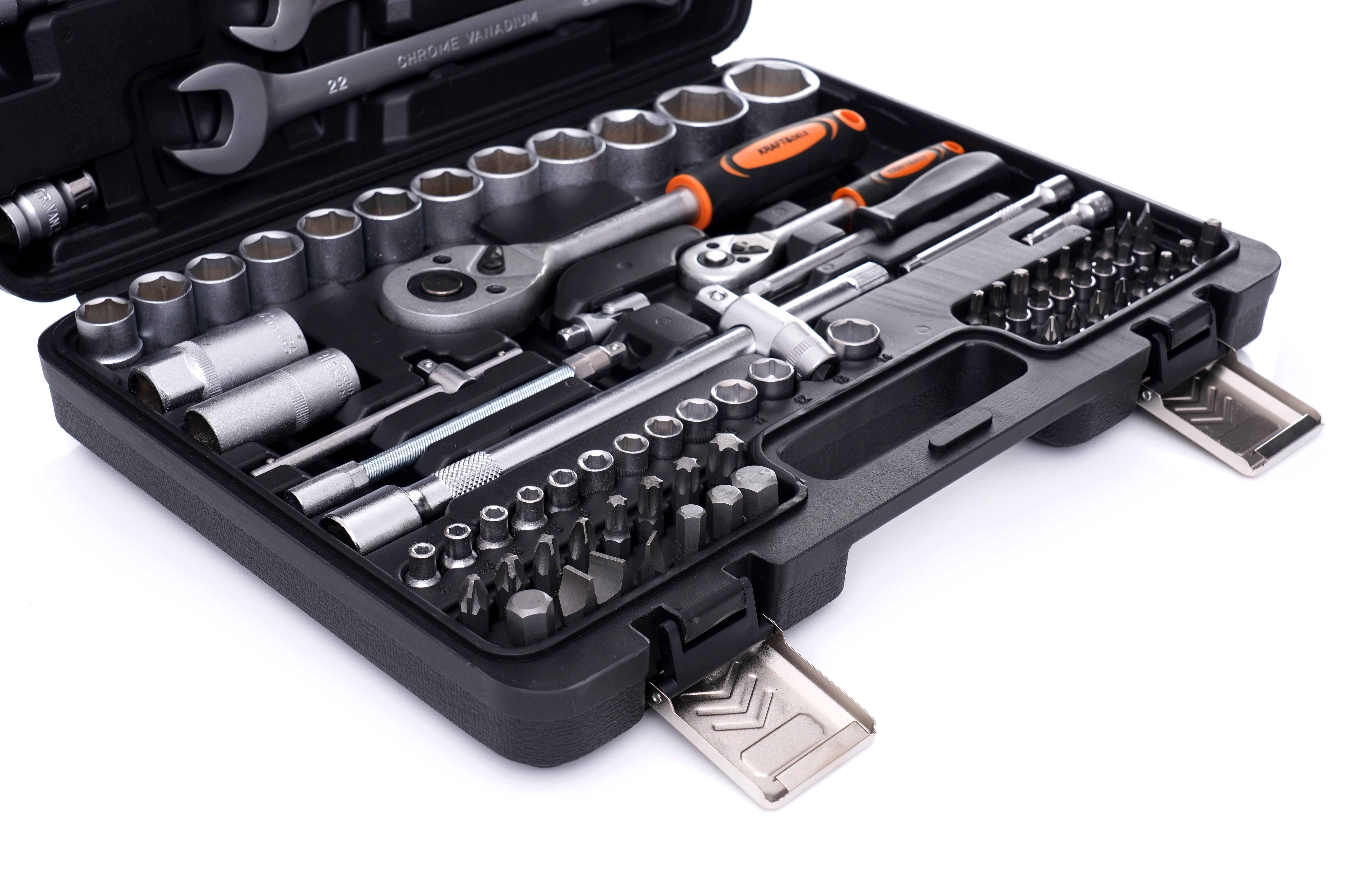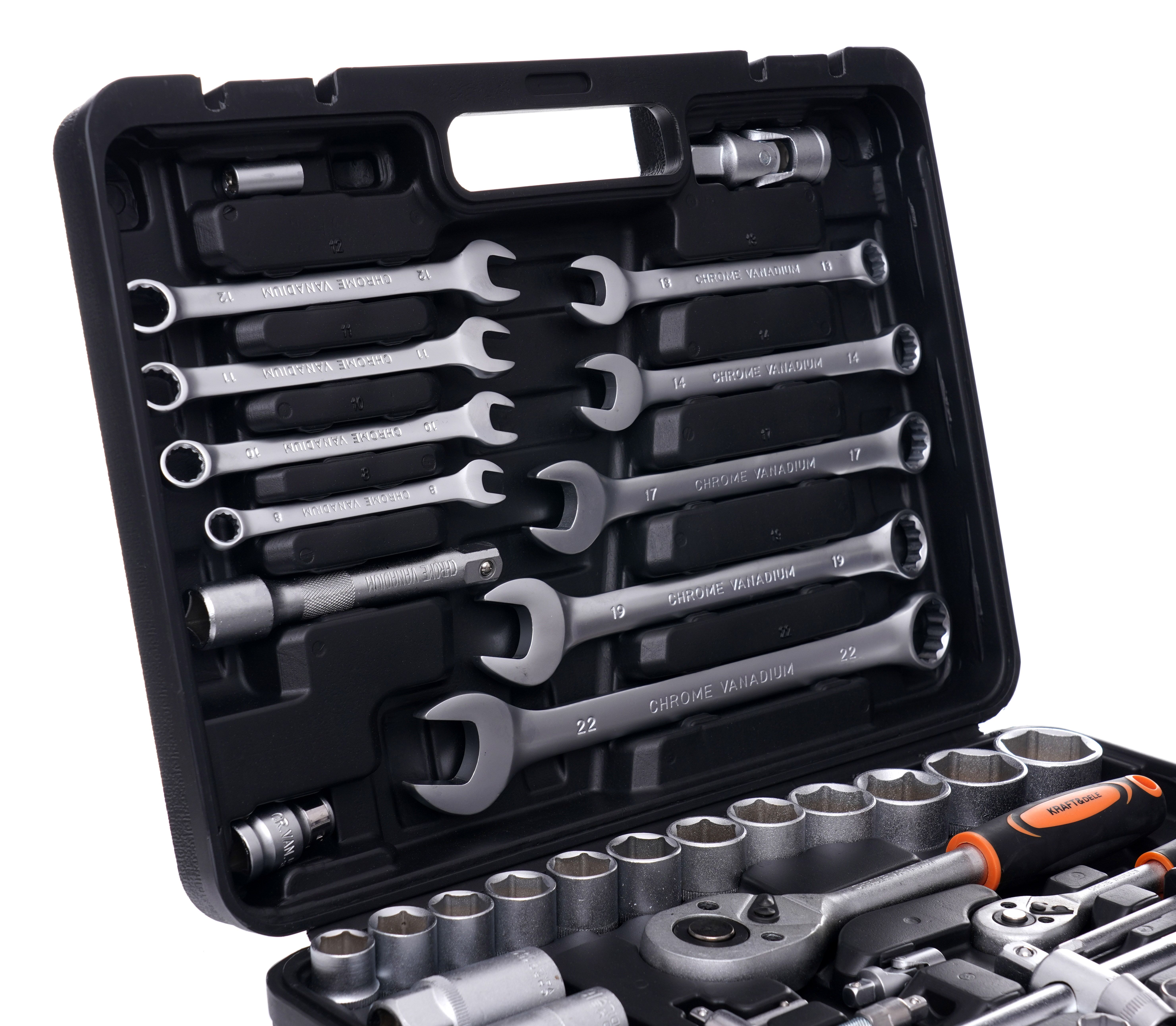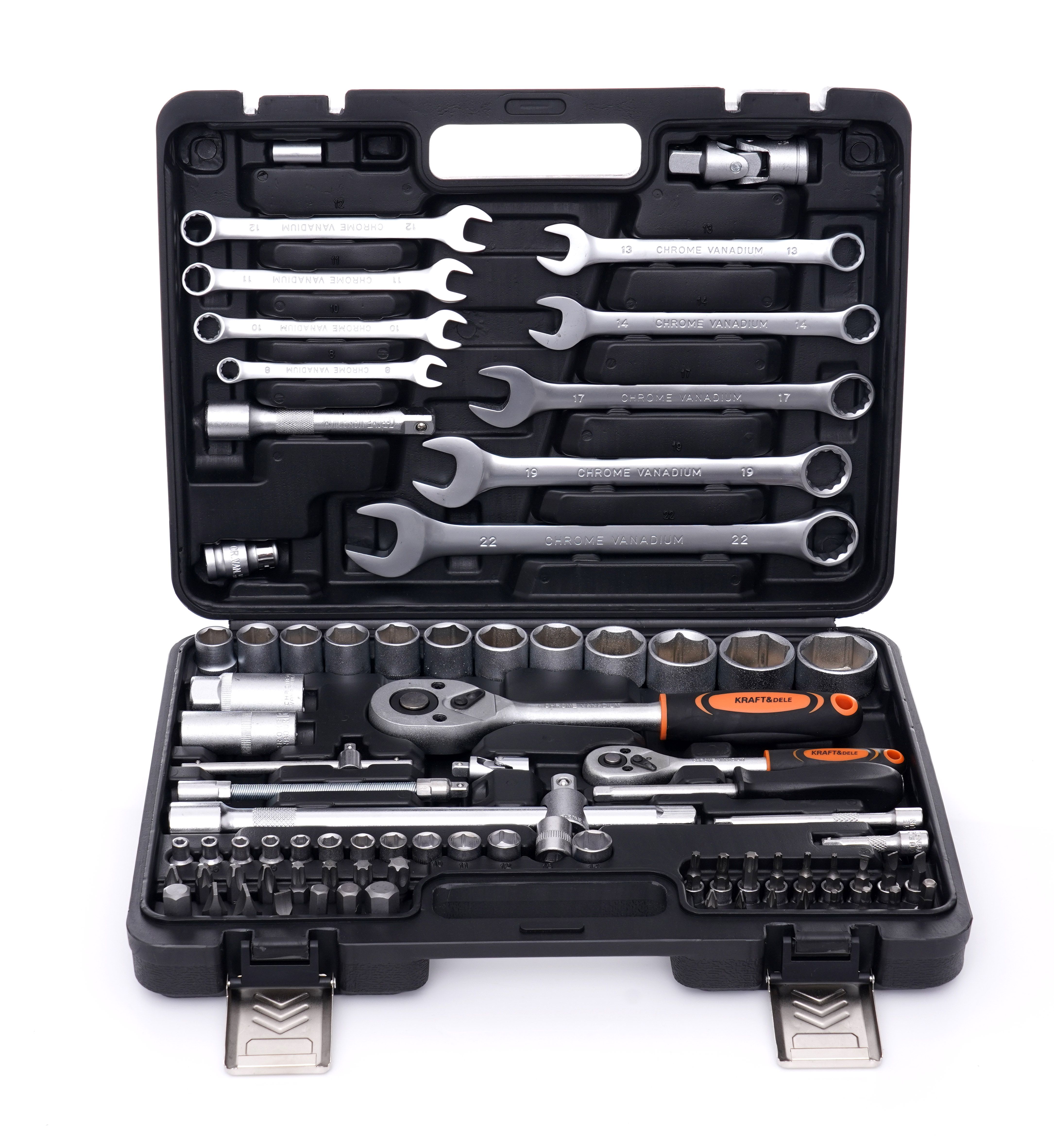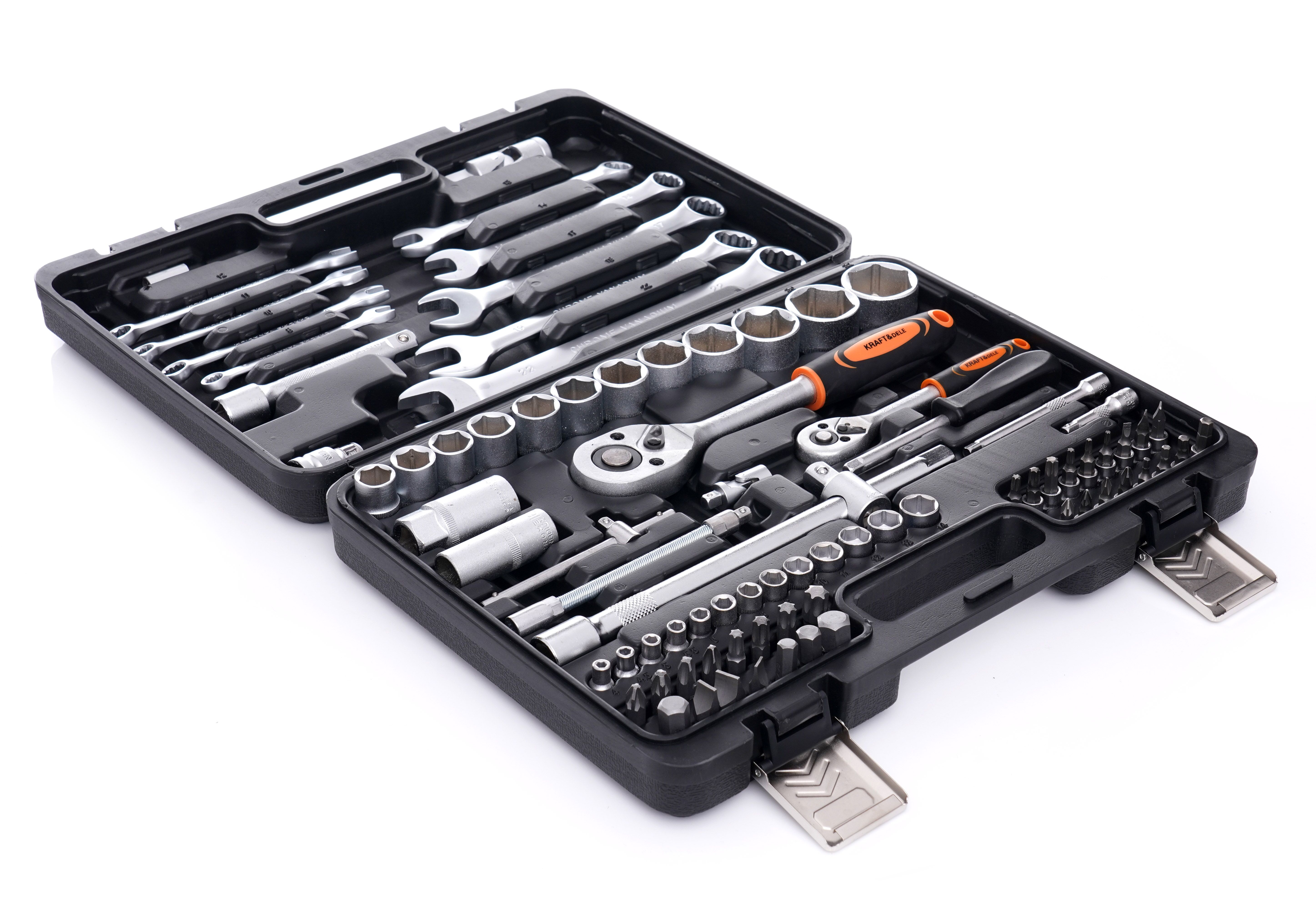 Zestaw kluczy KRAFT&DELE KD10832 jest uniwersalny i dobrze sprawdzi się zarówno w domowym zapleczu narzędziowym, jak i w warsztacie. Różne rozmiary nasadek, bity oraz elementy typu przedłużki i przeguby ułatwiają pracę w trudno dostępnych miejscach.