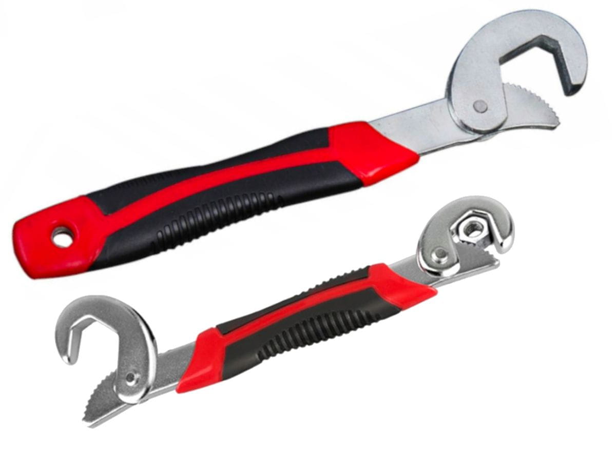 Komplet dwóch kluczy hakowych ze stali chromowo-wanadowej (CRV) z samonastawnym mechanizmem główki. Zakres pracy od 9 do 32 mm obejmuje trzy podzakresy, co pozwala zastąpić wiele kluczy płaskich i oczkowych jednym narzędziem. Potrójne zazębienie umożliwia pracę przy zdeformowanych lub częściowo uszkodzonych powierzchniach łbów śrub i nakrętek.