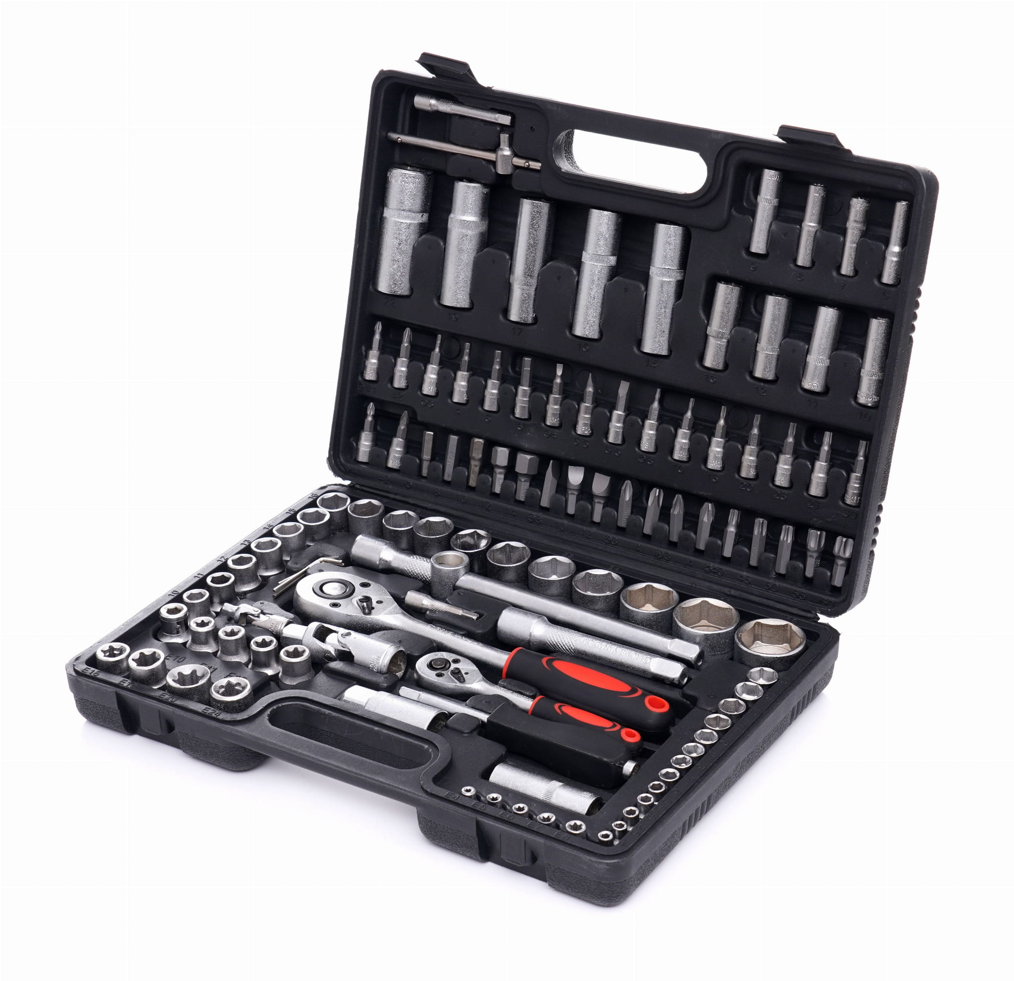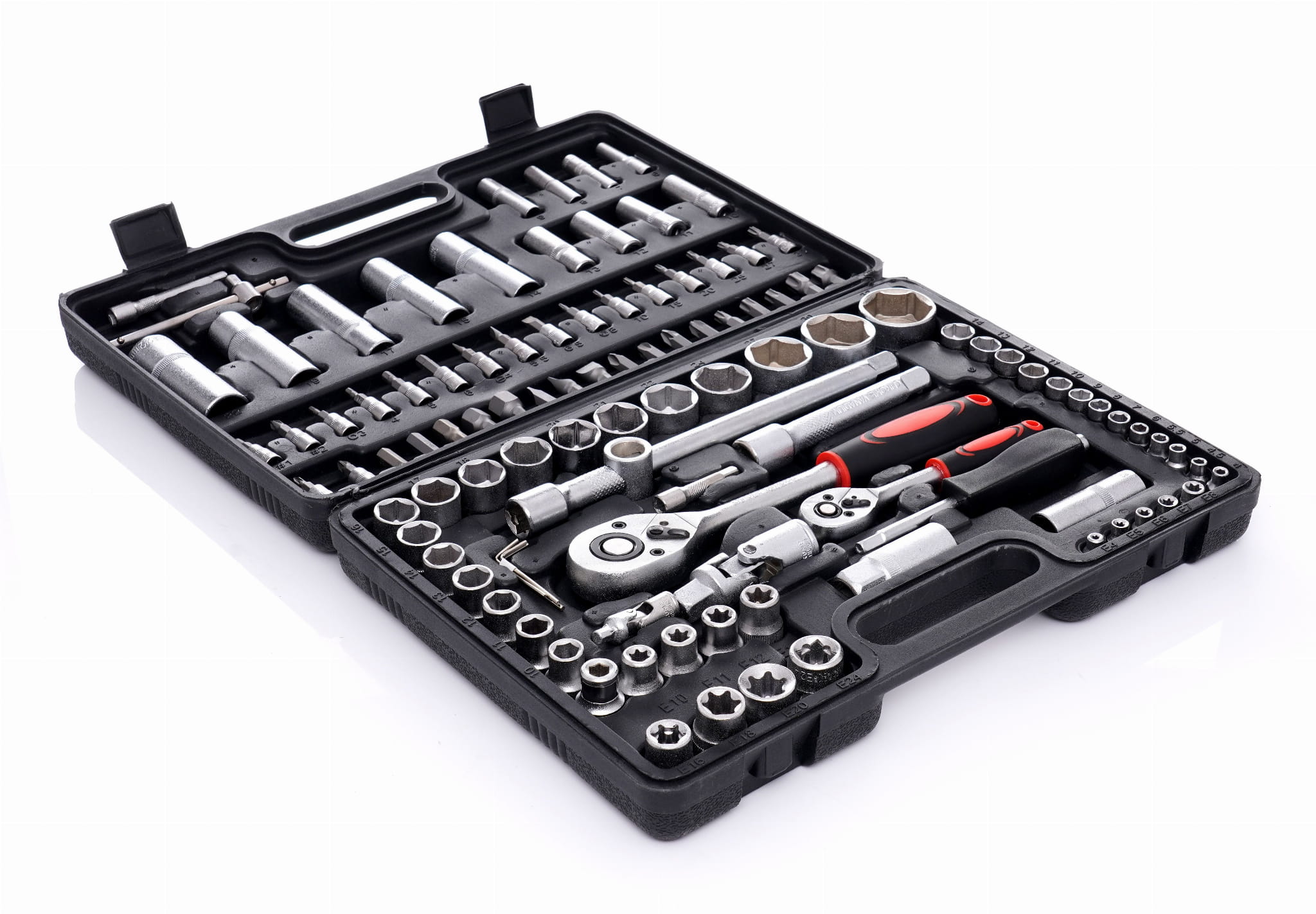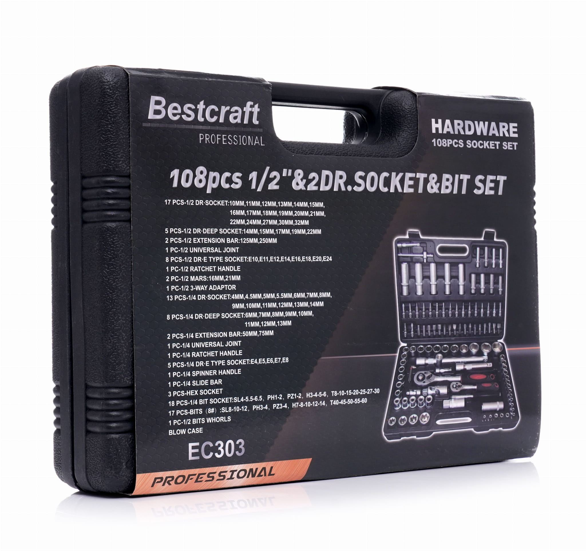 EC303 to rozbudowany zestaw narzędzi ręcznych obejmujący nasadki w napędach 1/4" i 1/2", grzechotki 72-zębowe, bity, przedłużki, przeguby Cardana oraz klucze imbusowe i Torx. Wszystkie elementy wykonano ze stali chromowo-wanadowej (CrV) i umieszczono w walizce z formowanymi gniazdami.