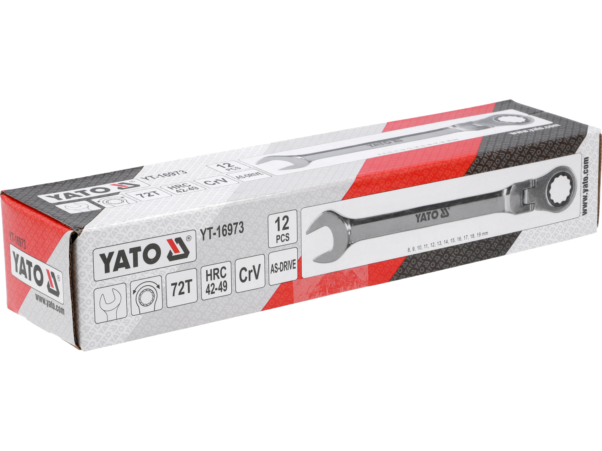 Profesjonalny zestaw 12 kluczy płasko-oczkowych z mechanizmem grzechotkowym i ruchomym przegubem. Konstrukcja ze stali chromowo-wanadowej z systemem AS-DRIVE zapewnia efektywną pracę w ograniczonej przestrzeni warsztatowej.