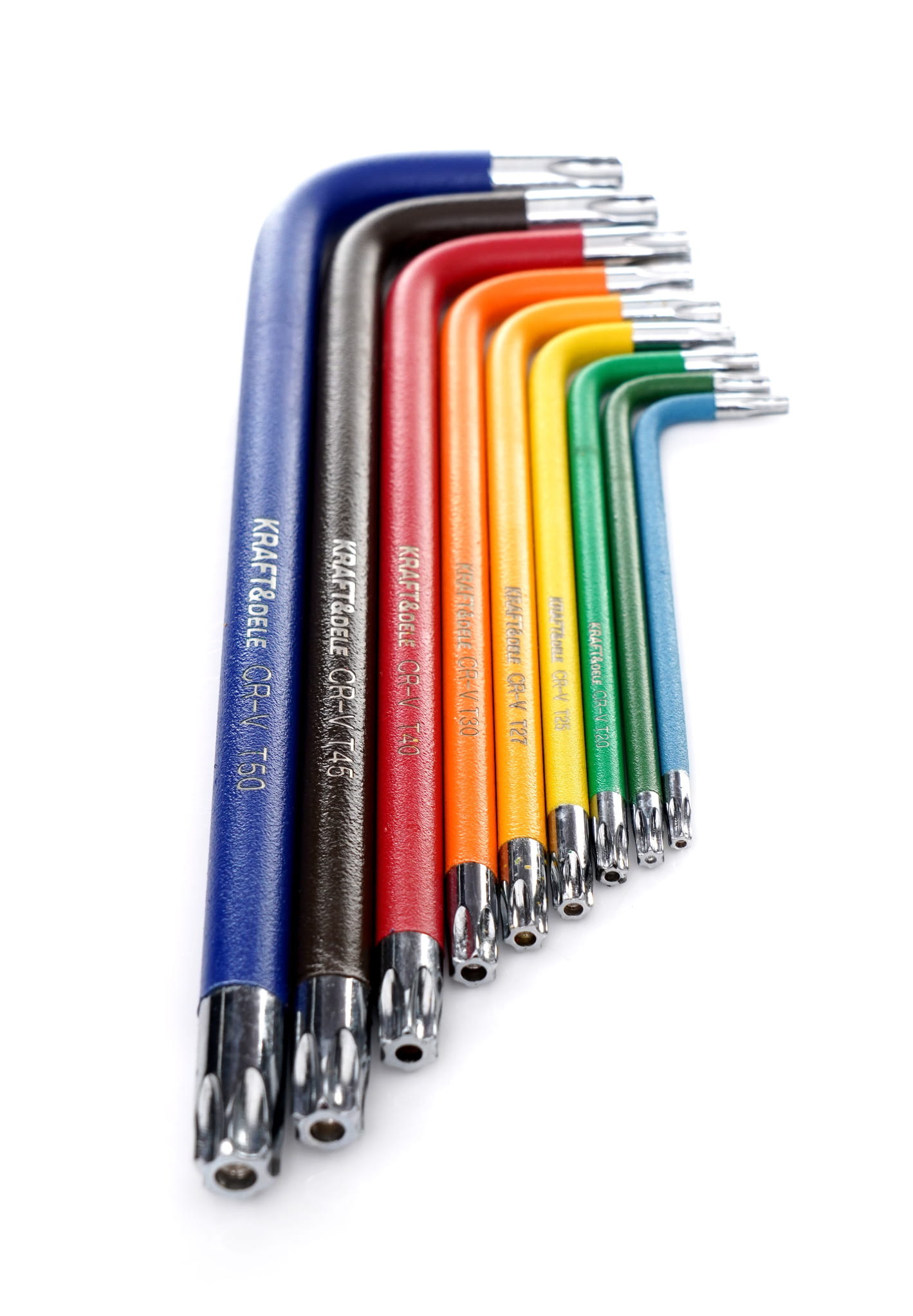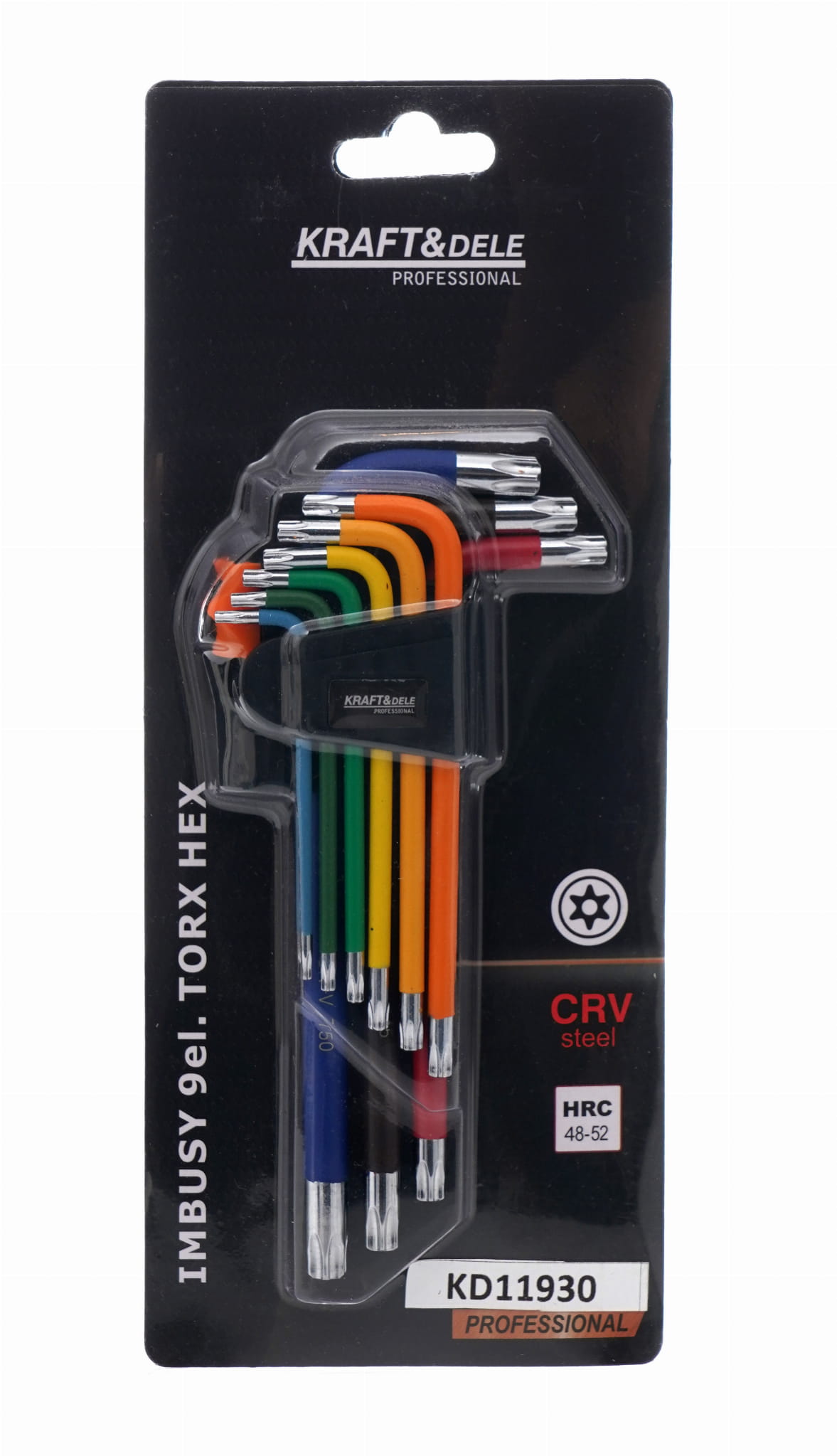 Komplet dziewięciu kluczy typu Torx z otworem przelotowym w trzpieniu, wykonanych ze stali chromowo-wanadowej (CRV). Zestaw obejmuje rozmiary od T10 do T50, a każdy klucz oznaczony jest indywidualnym kolorem, co przyspiesza identyfikację rozmiaru podczas pracy. Klucze przechowywane są w plastikowym uchwycie porządkującym komplet.