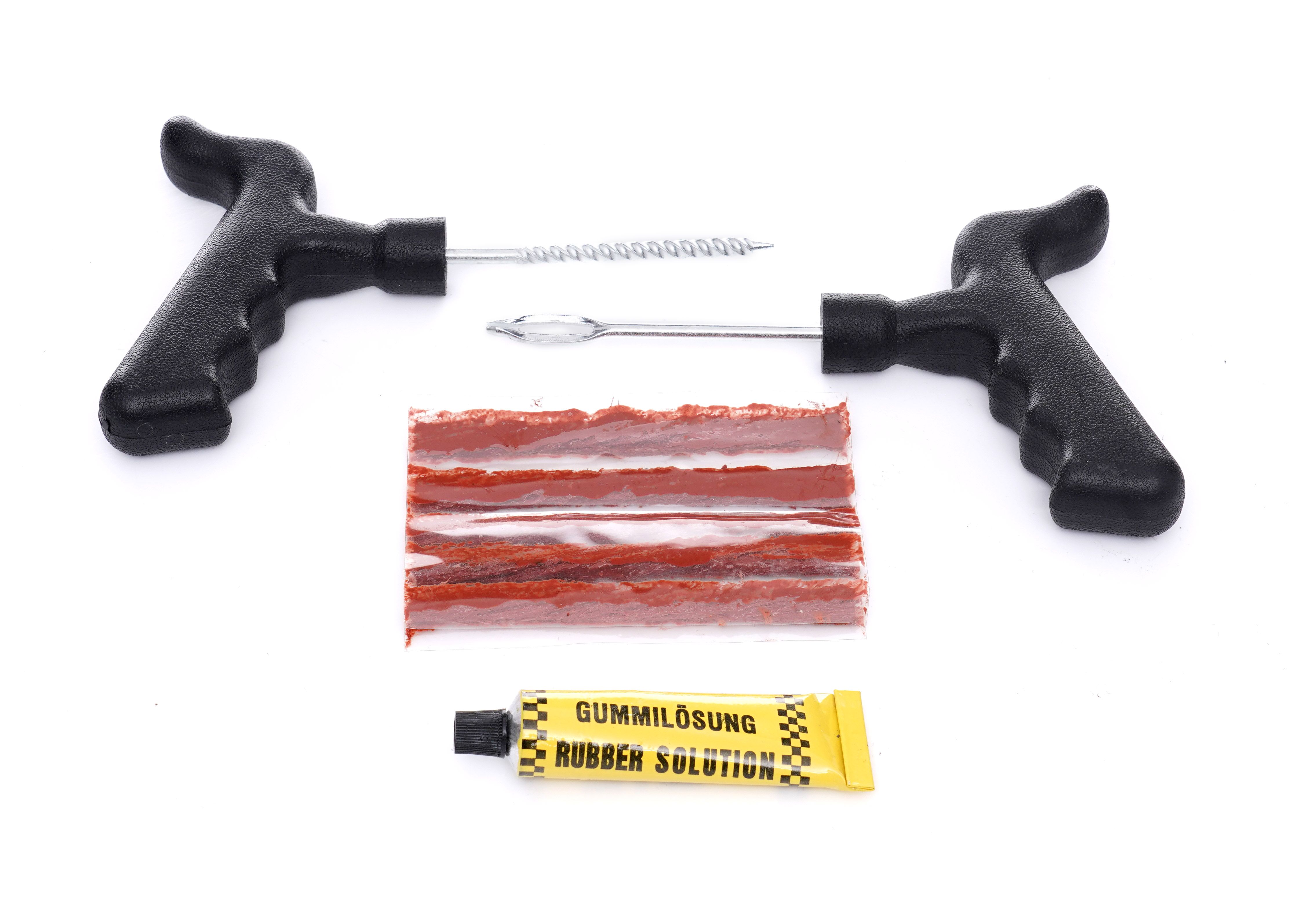 ZESTAW NAPRACZWCZY DO OPON 8EL. KD10593 zawiera sznury, szydło, klej i aplikator, dzięki czemu masz pod ręką podstawowe narzędzia do naprawy.