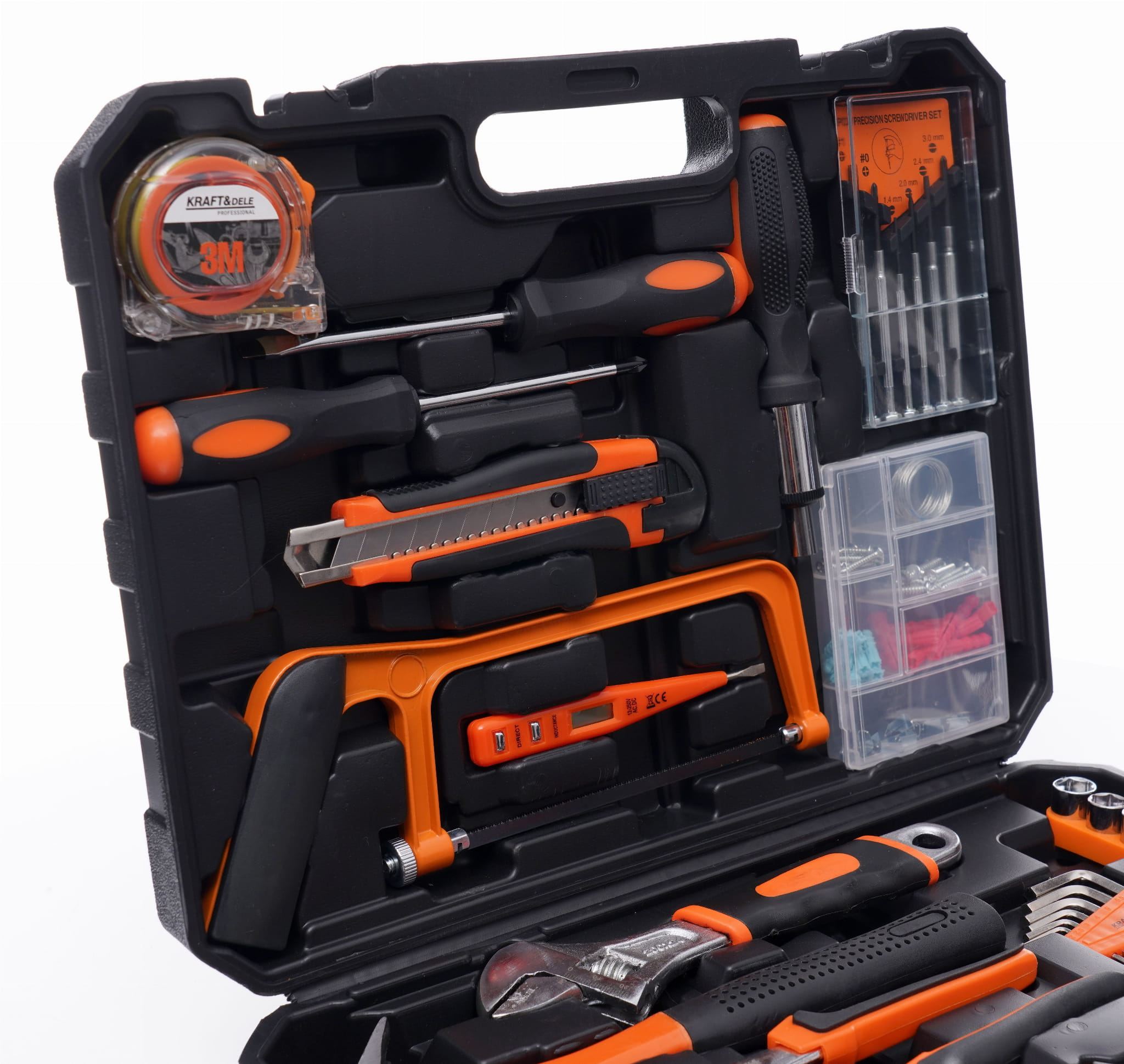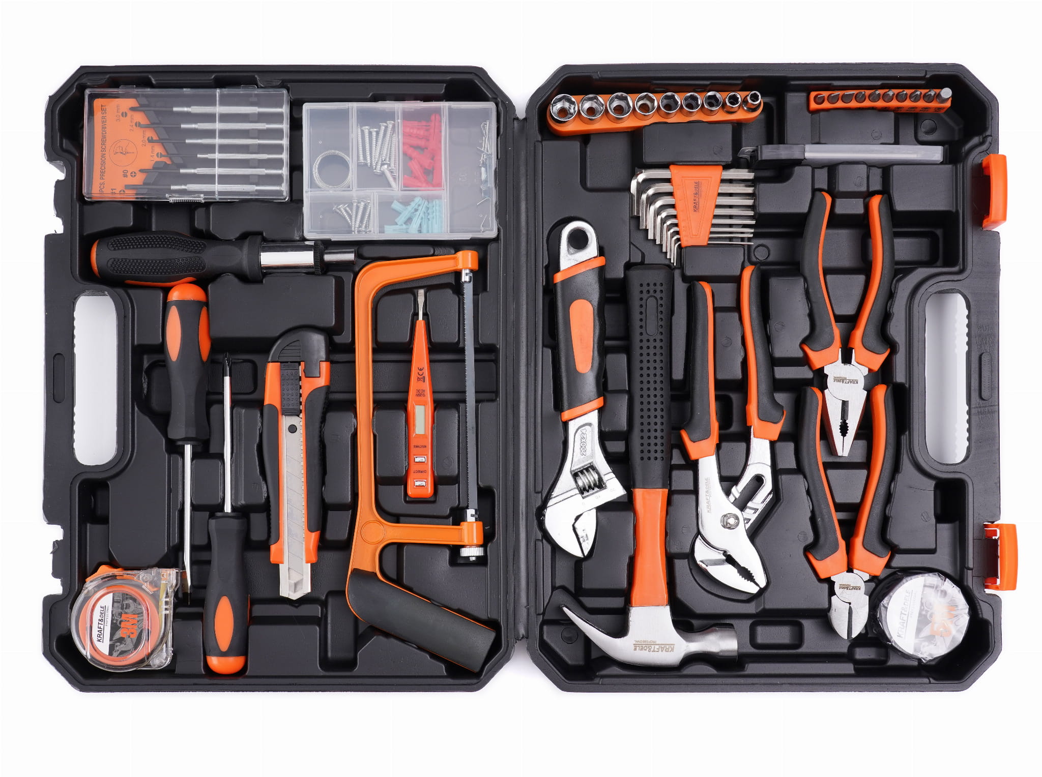 Zestaw łączy narzędzia do dokręcania (nasadki 1/4", klucze imbusowe, grzechotka), cięcia (piła do metalu, nóż do tapet), elektryki (próbnik napięcia, taśma izolacyjna), pomiarów (miara 3 m) oraz narzędzia precyzyjne — co pozwala realizować prace z różnych dziedzin bez potrzeby dokupowania elementów.