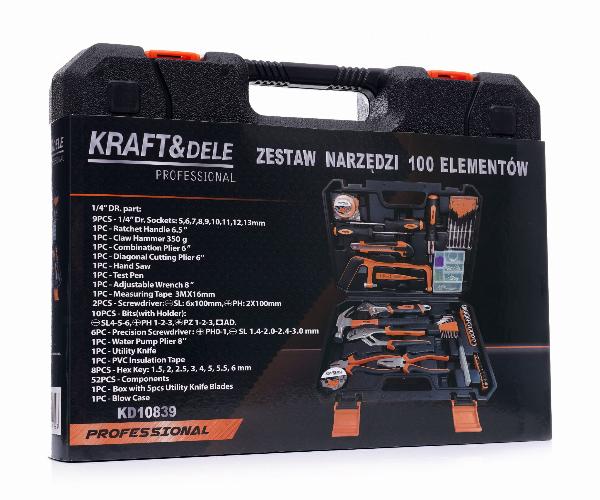 Kompletny zestaw narzędzi warsztatowych i domowych zamknięty w walizce transportowej z tworzywa sztucznego. Narzędzia wykonano ze stali chromowo-wanadowej (CrV), która łączy odporność na korozję z podwyższoną ciągliwością i wytrzymałością mechaniczną. Zestaw obejmuje nasadki, klucze, śrubokręty, kombinerki, szczypce, piłę do metalu oraz materiały pomocnicze — łącznie 100 elementów.